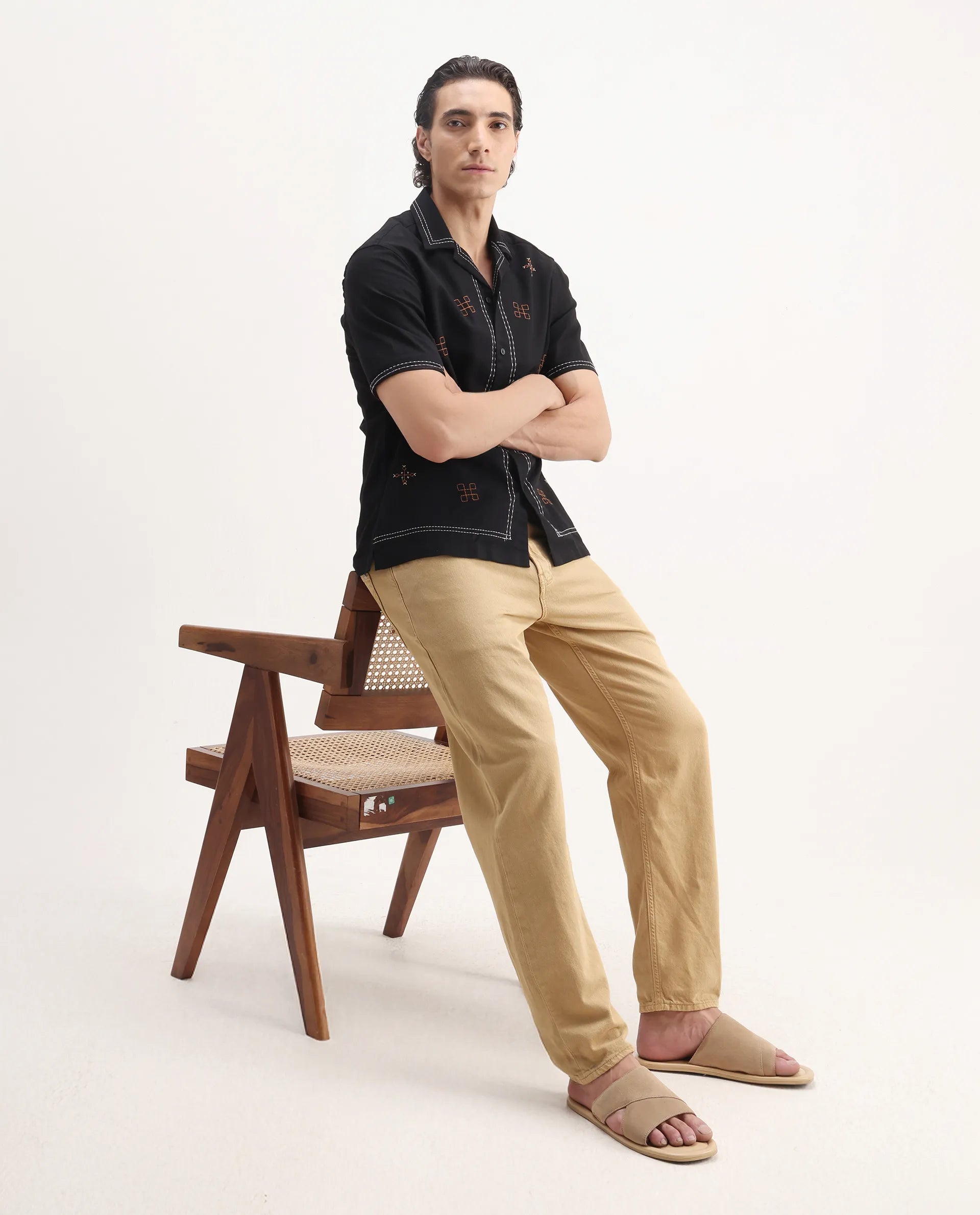 Introducing our stylish Black Embroidered Cuban Collar Shirt, the perfect addition to your casual wardrobe. Crafted from premium cotton, this relaxed fit shirt offers both comfort and style. Featuring a unique embroidered Cuban collar and convenient button closure, it's ideal for any casual outing. The half sleeves add a touch of modern flair, making it a versatile choice for any occasion. Elevate your fashion game with this must-have black shirt, designed for those who appreciate quality and style. Perfect for pairing with jeans or chinos for a laid-back yet sophisticated look. Shop now and embrace effortless elegance.