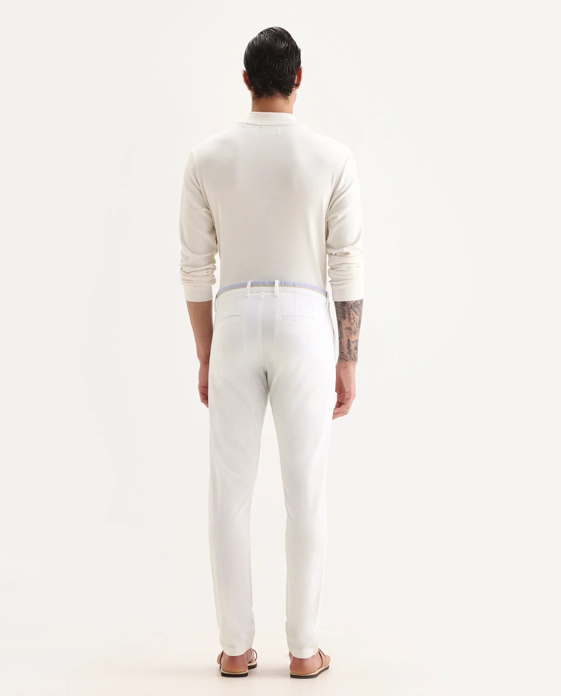 - A solid stretch trouser with tape detail at the waistband.
