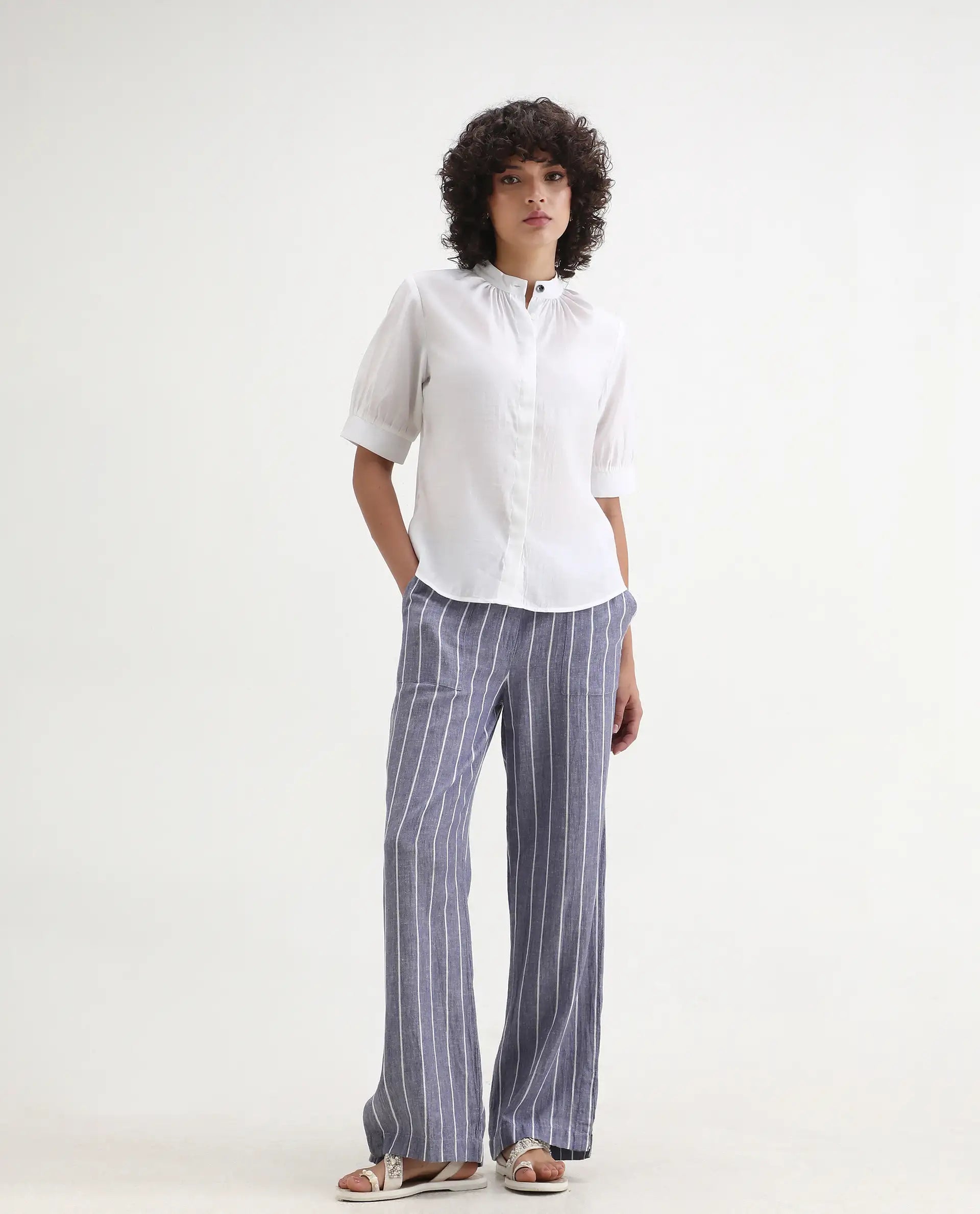 Rareism Women's Breen White Polyester Mandarin Collar Plain Bishop Sleeve Regular Fit Top