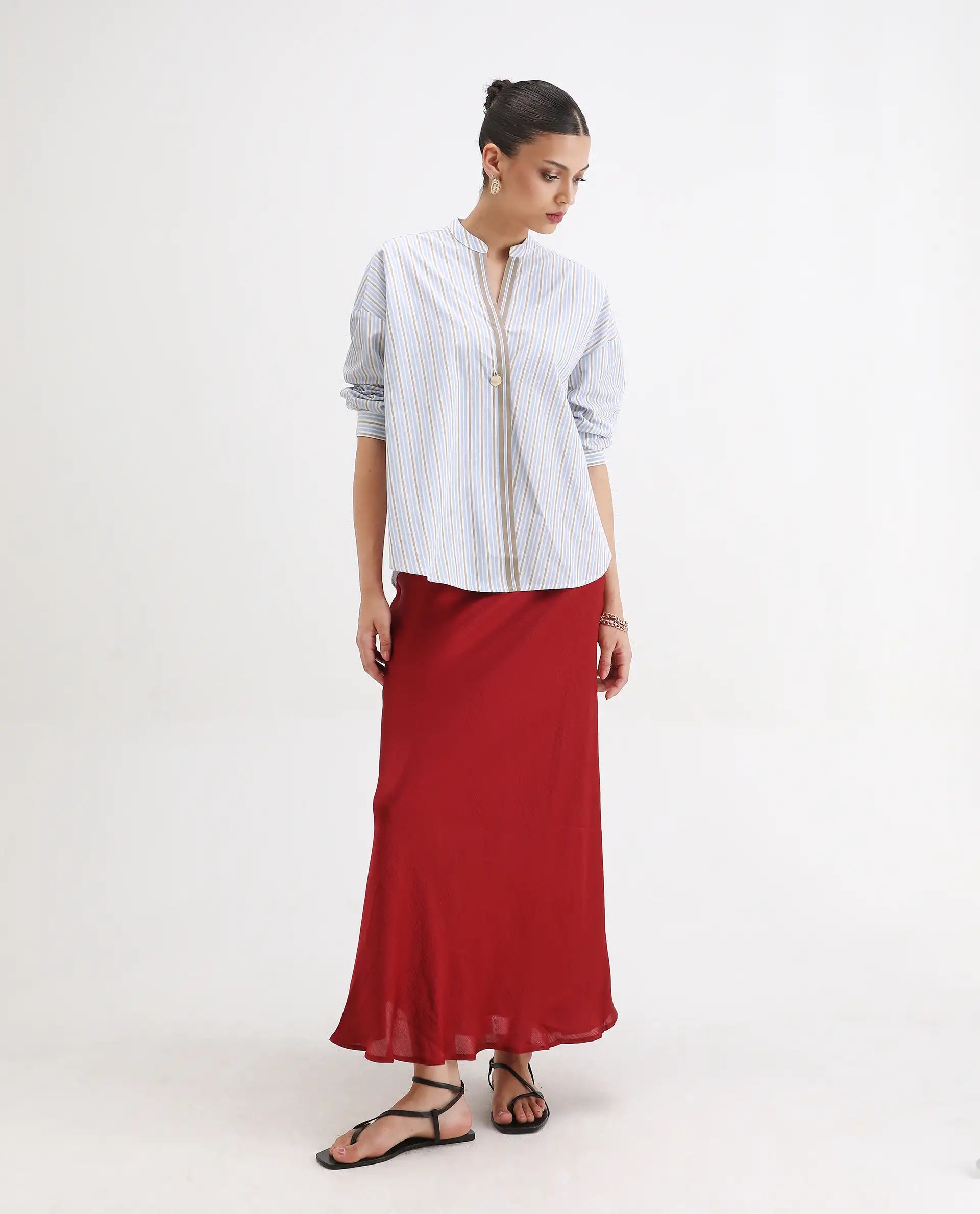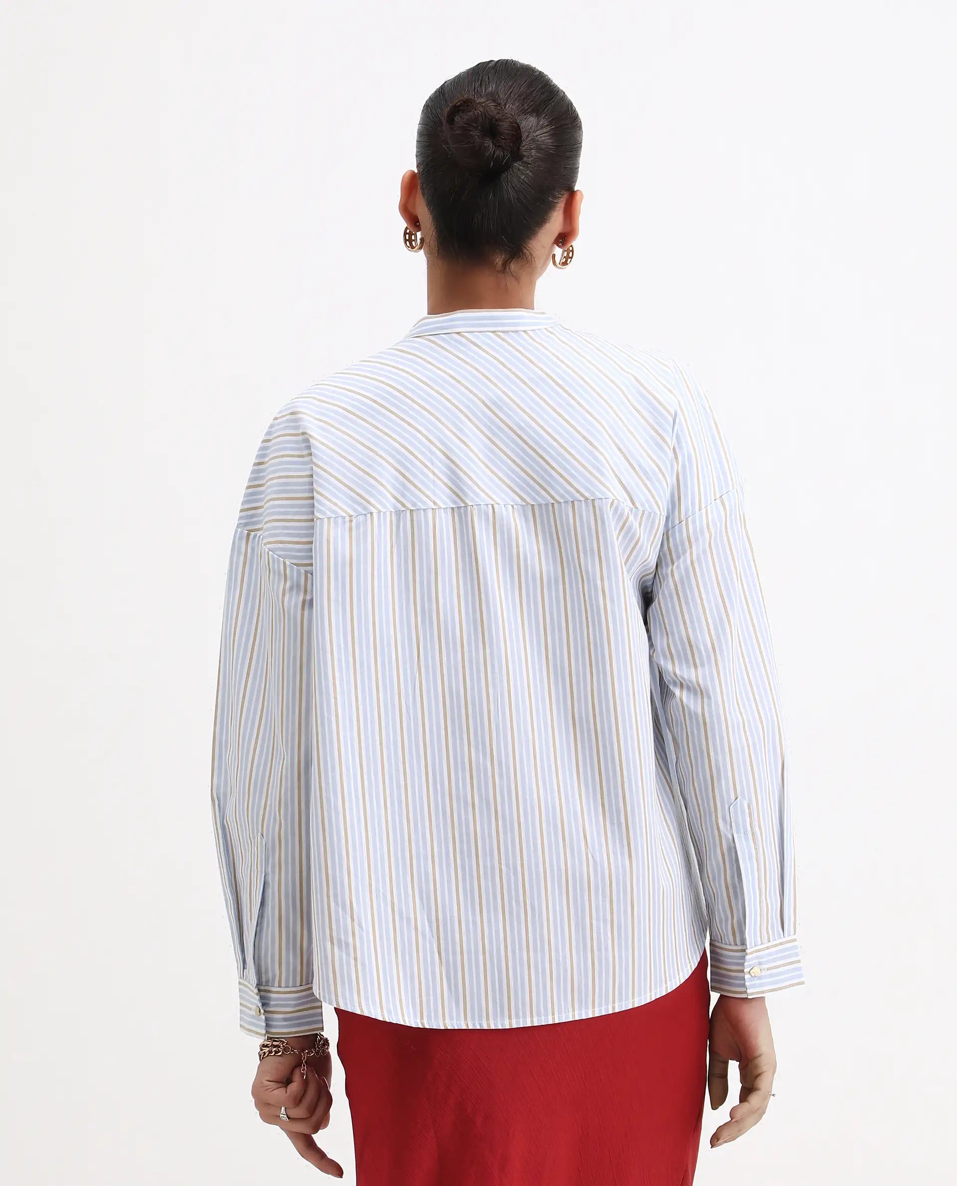 This Rareism women's shirt features a light blue cotton fabric designed for comfort and breathability. It showcases a mandarin collar and cuffed sleeves, adding a refined touch to its striped pattern. The button closure ensures a secure fit, making it an ideal choice for both casual and professional settings. Its tailored design combines style with ease of wear, perfect for those seeking a versatile wardrobe staple.