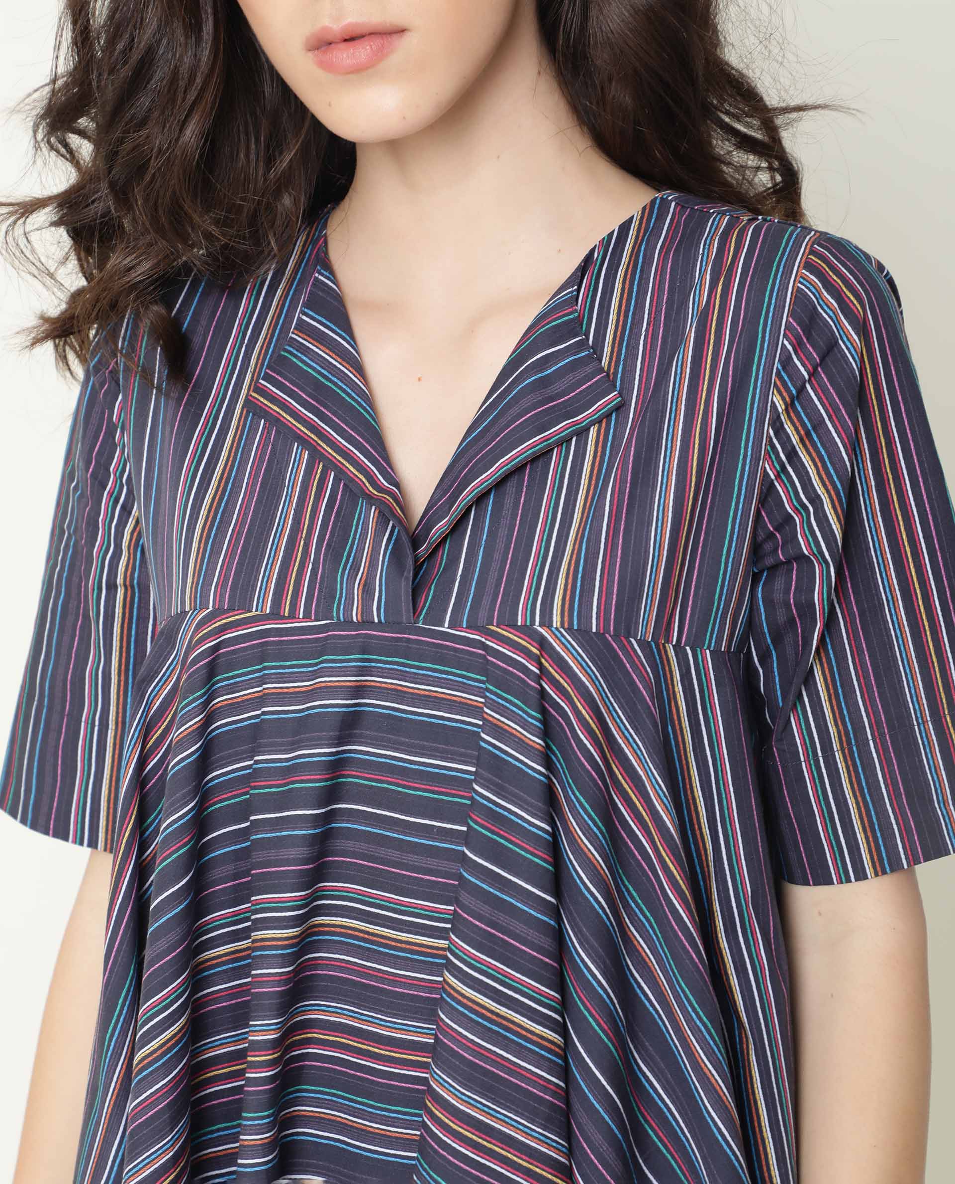 - Short sleeves, cut seam at chest, and circular flare in discreet stripes.