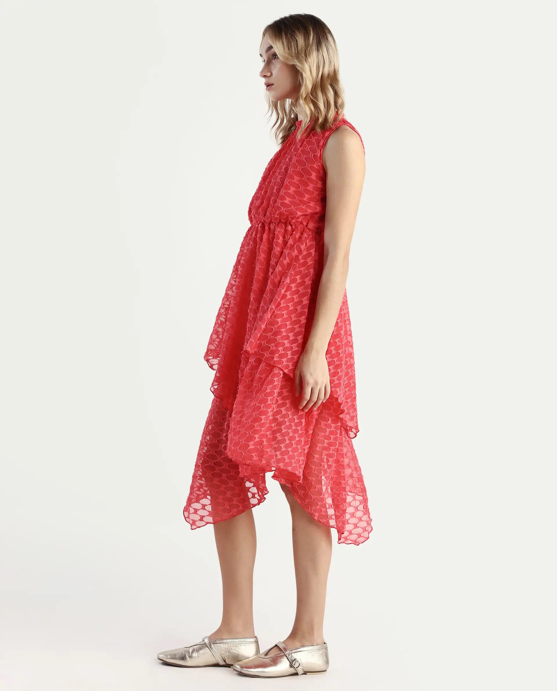 Rareism Women's Sarsa Pastel Pink Polyester Ruffled Neck Jacquard Sleeveless Midi Fit And Flare Dress