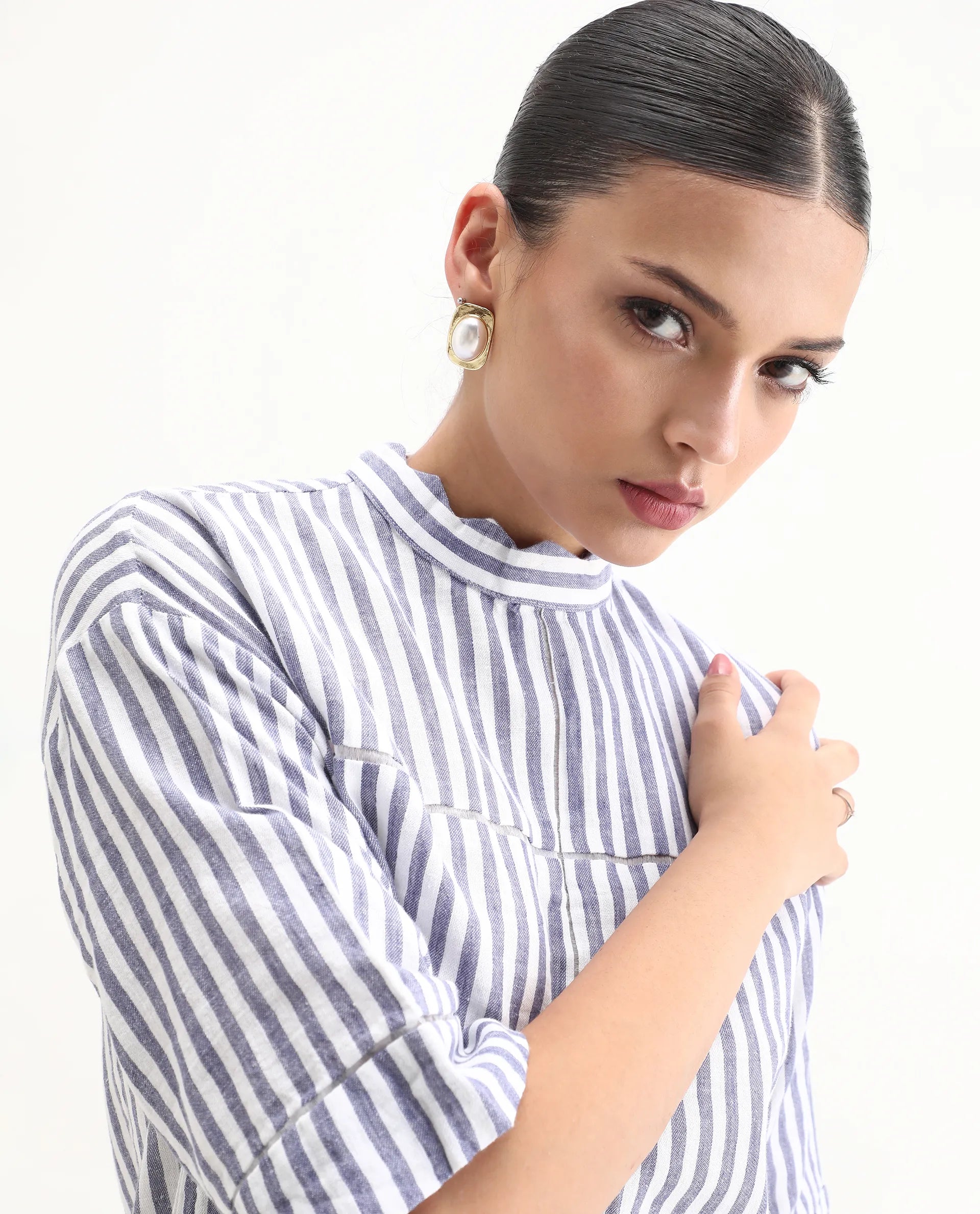 -An urban style relaxed fit linen dress with band collar and half sleeve.