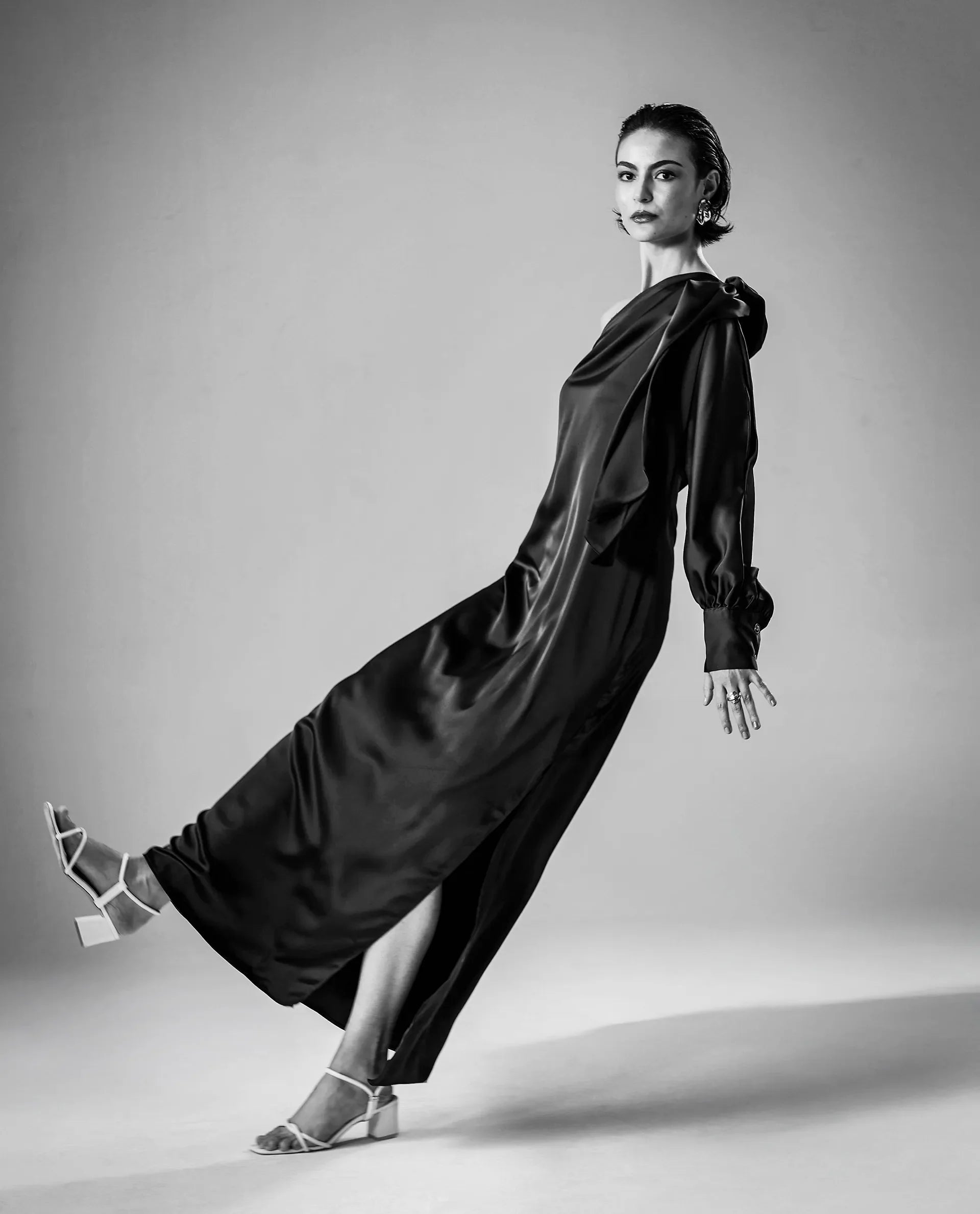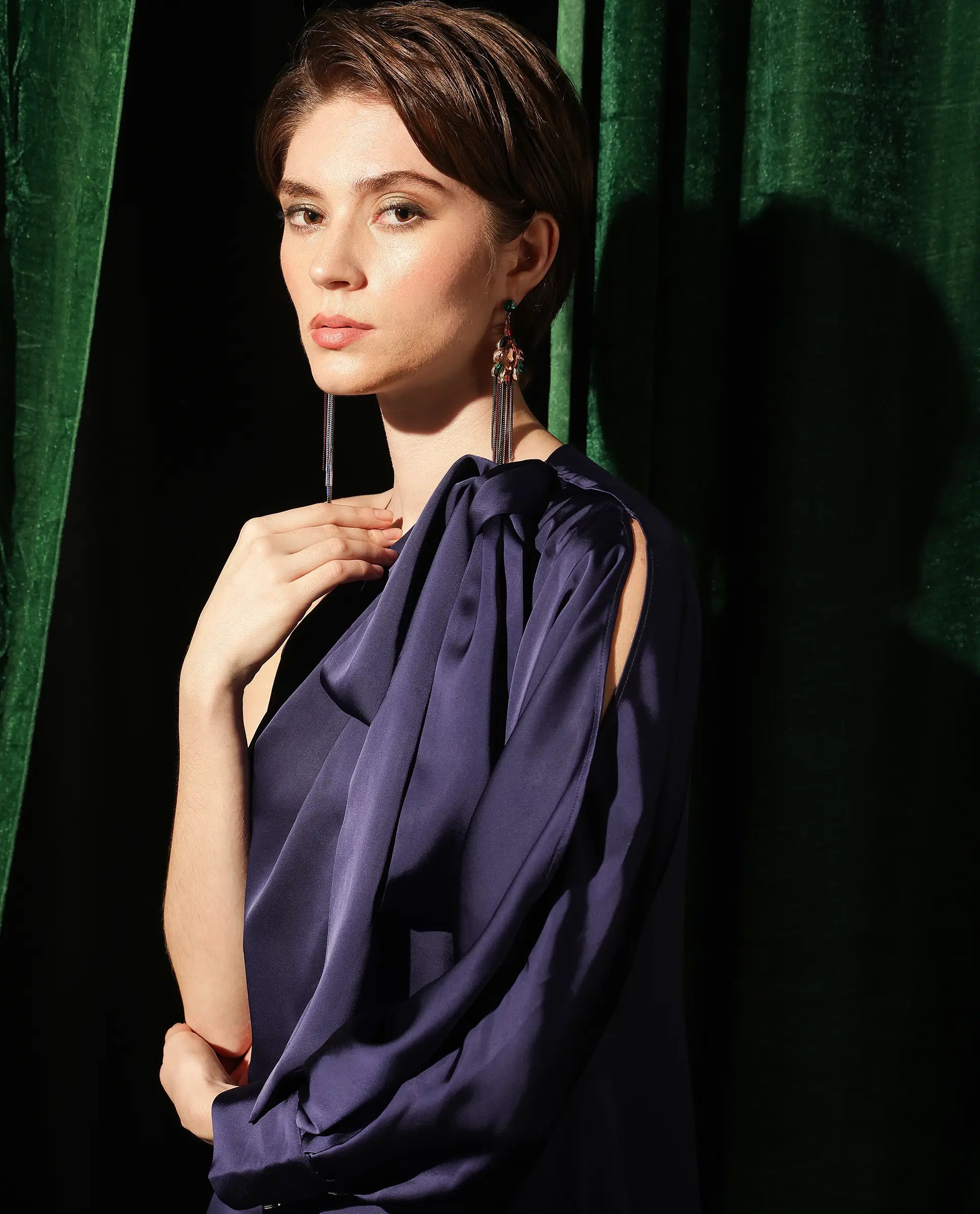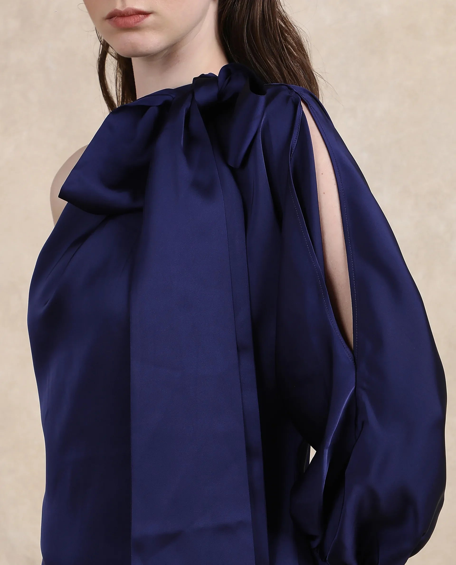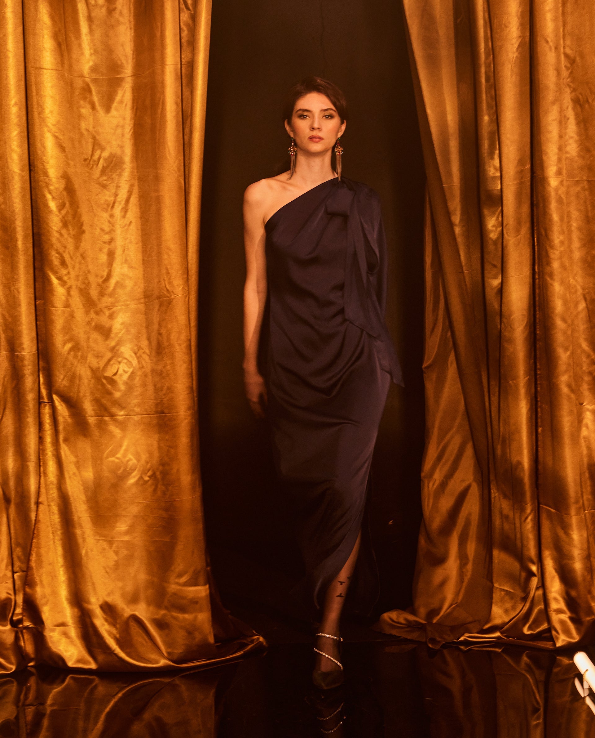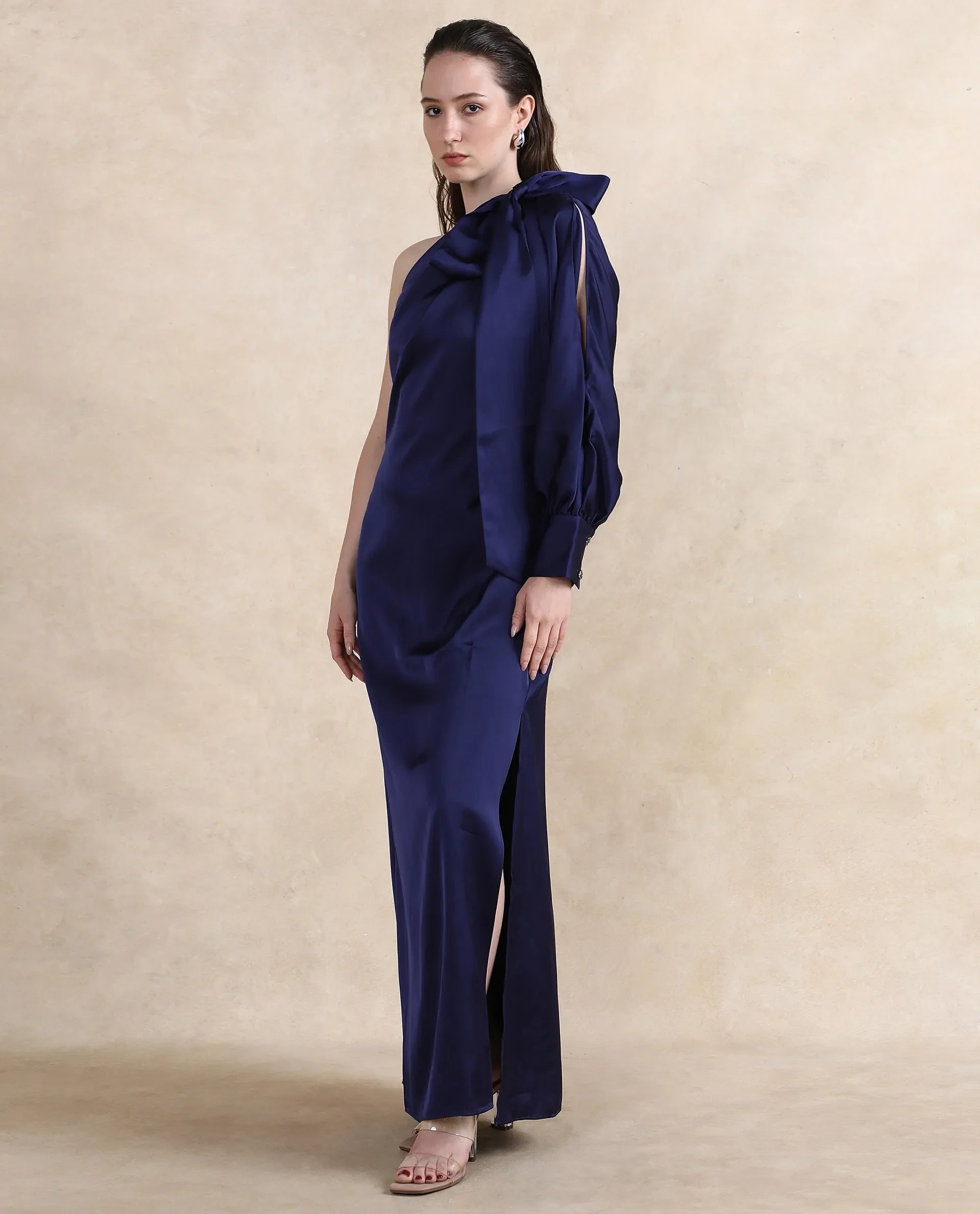 Elevate your evening look with this stunning one-shoulder navy gown. Crafted from luxurious fabric, it features a dramatic thigh-high slit for a touch of allure. The asymmetrical design and fitted silhouette enhance your figure, while the long sleeve adds sophistication. Perfect for formal events or special occasions, this gown ensures you make a memorable entrance. Pair with statement heels and accessories for a complete ensemble that exudes elegance and confidence.
