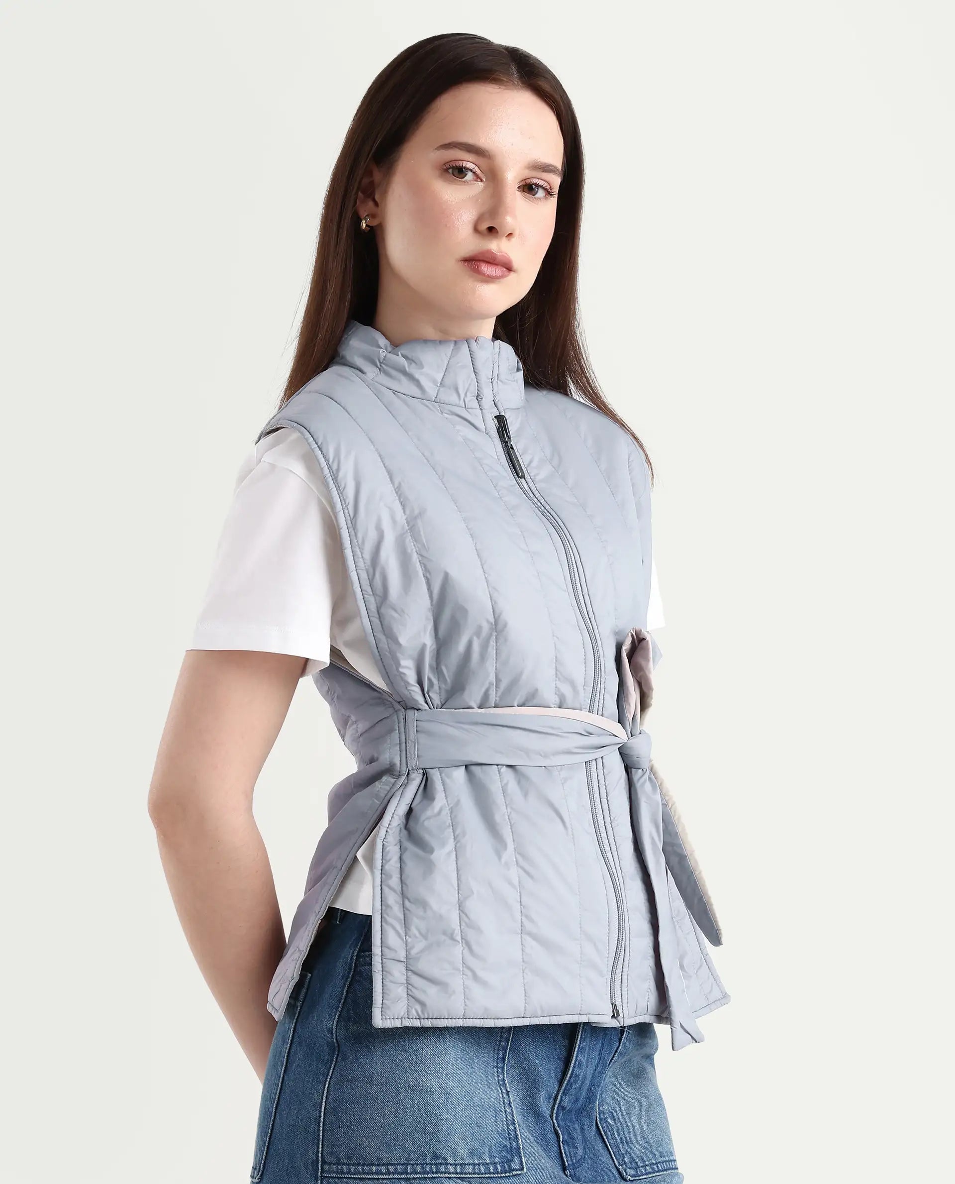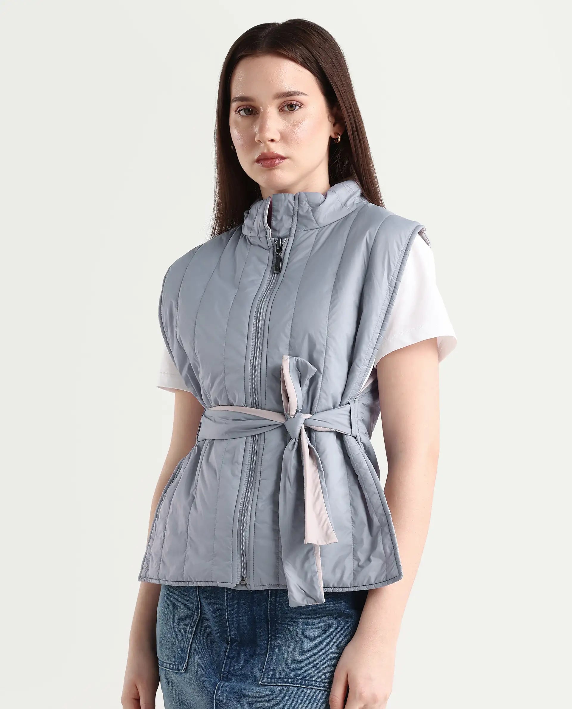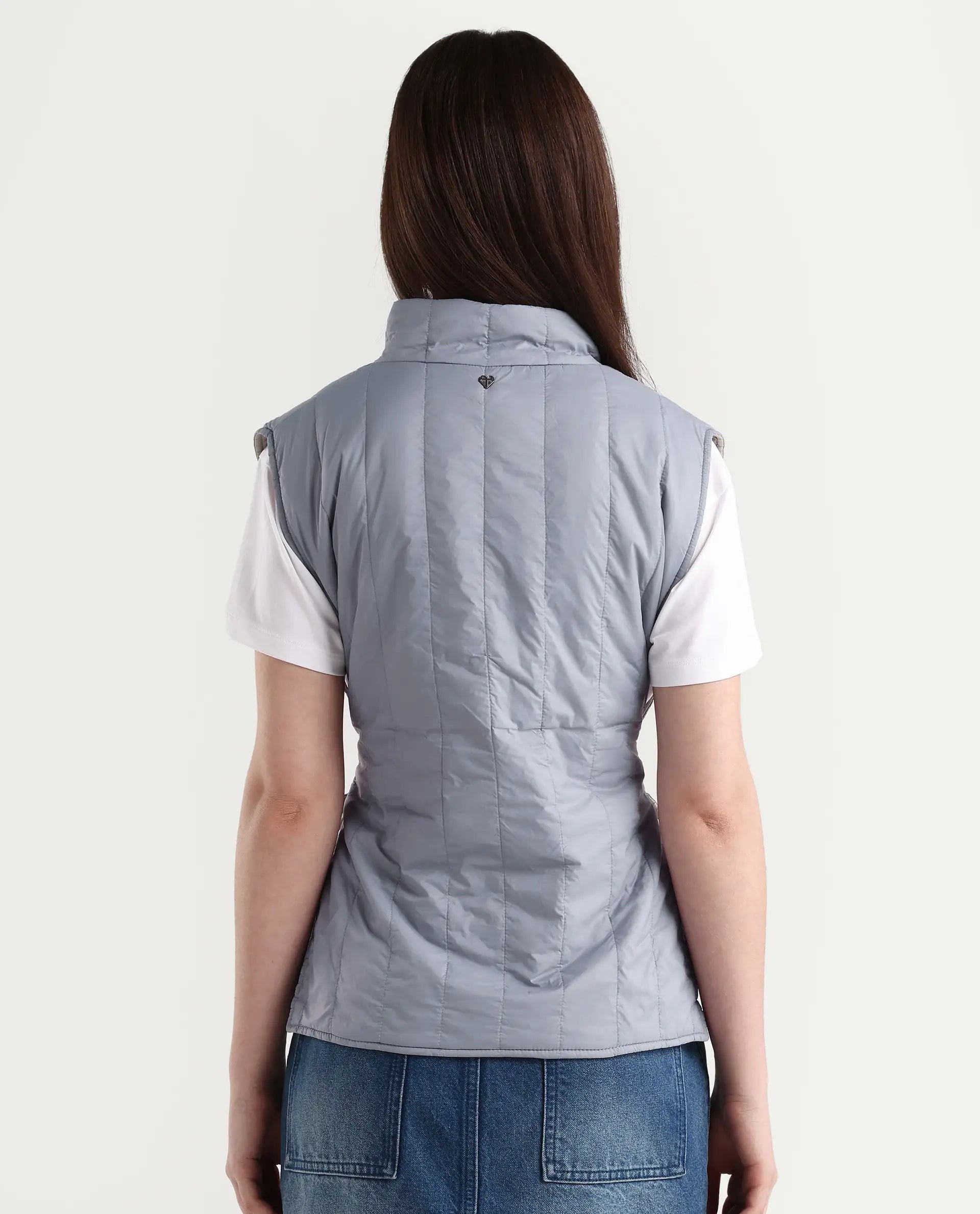 A contemporary style sleeveless puffer jacket with a quilted vertical structure.