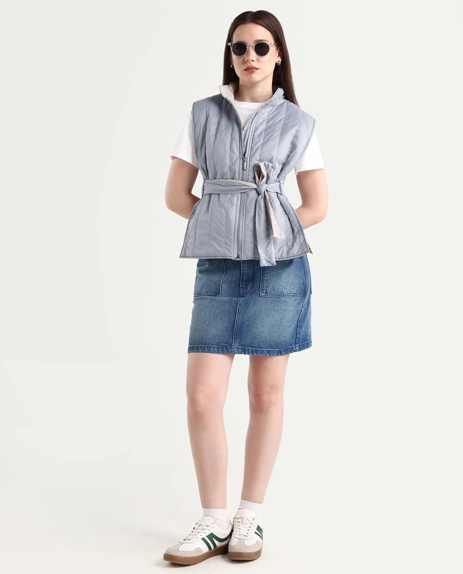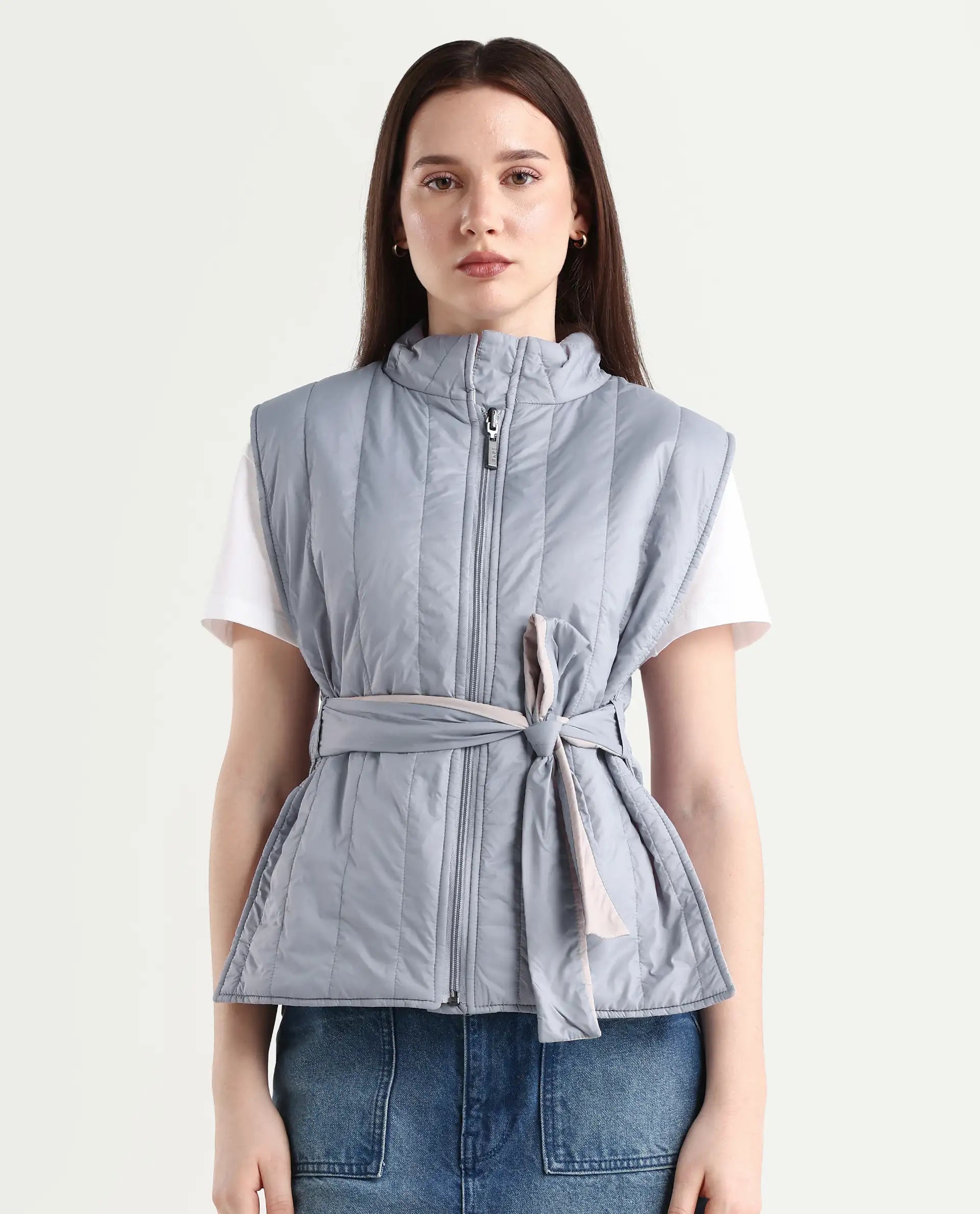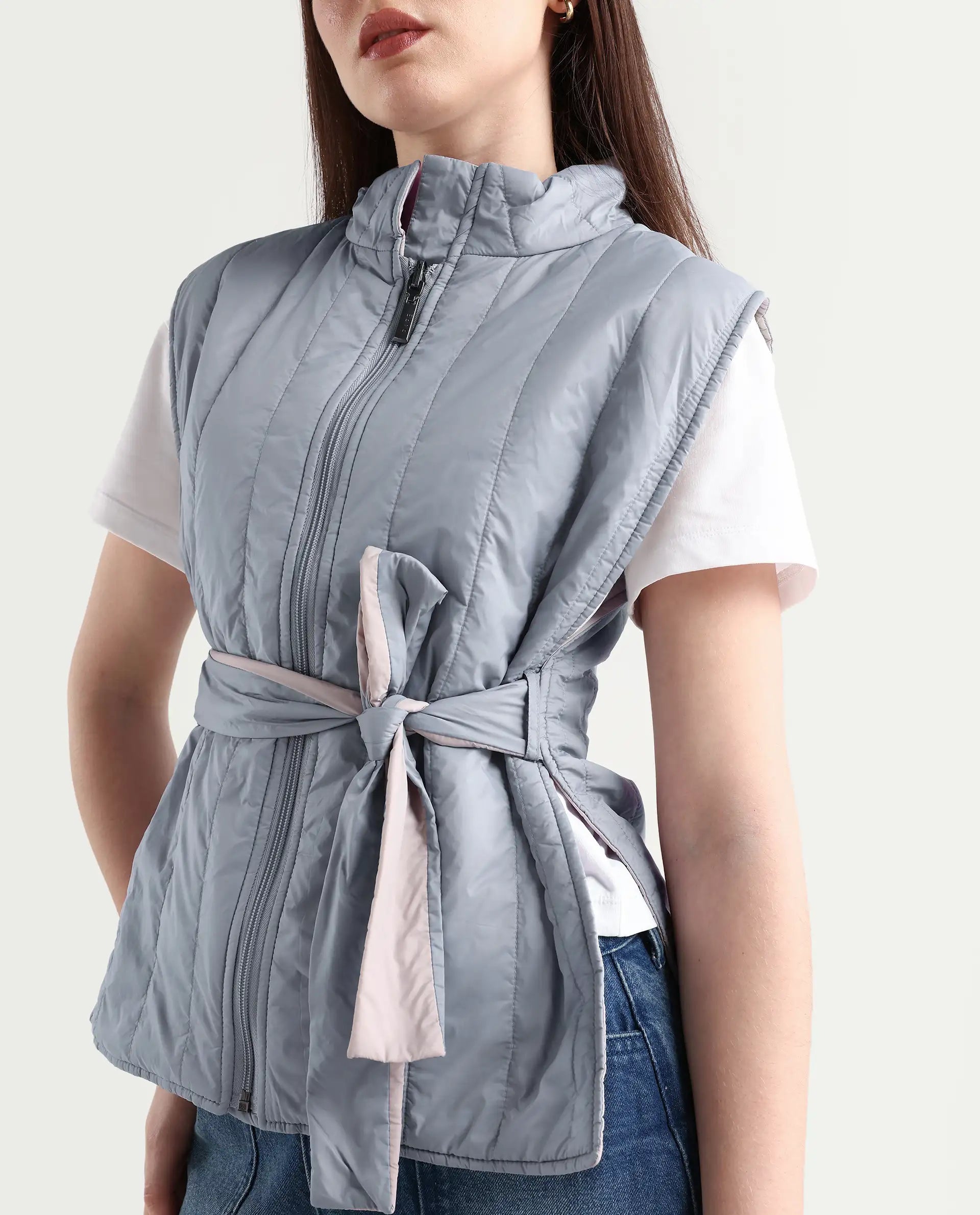 - With zipper closure and tie-up detail.