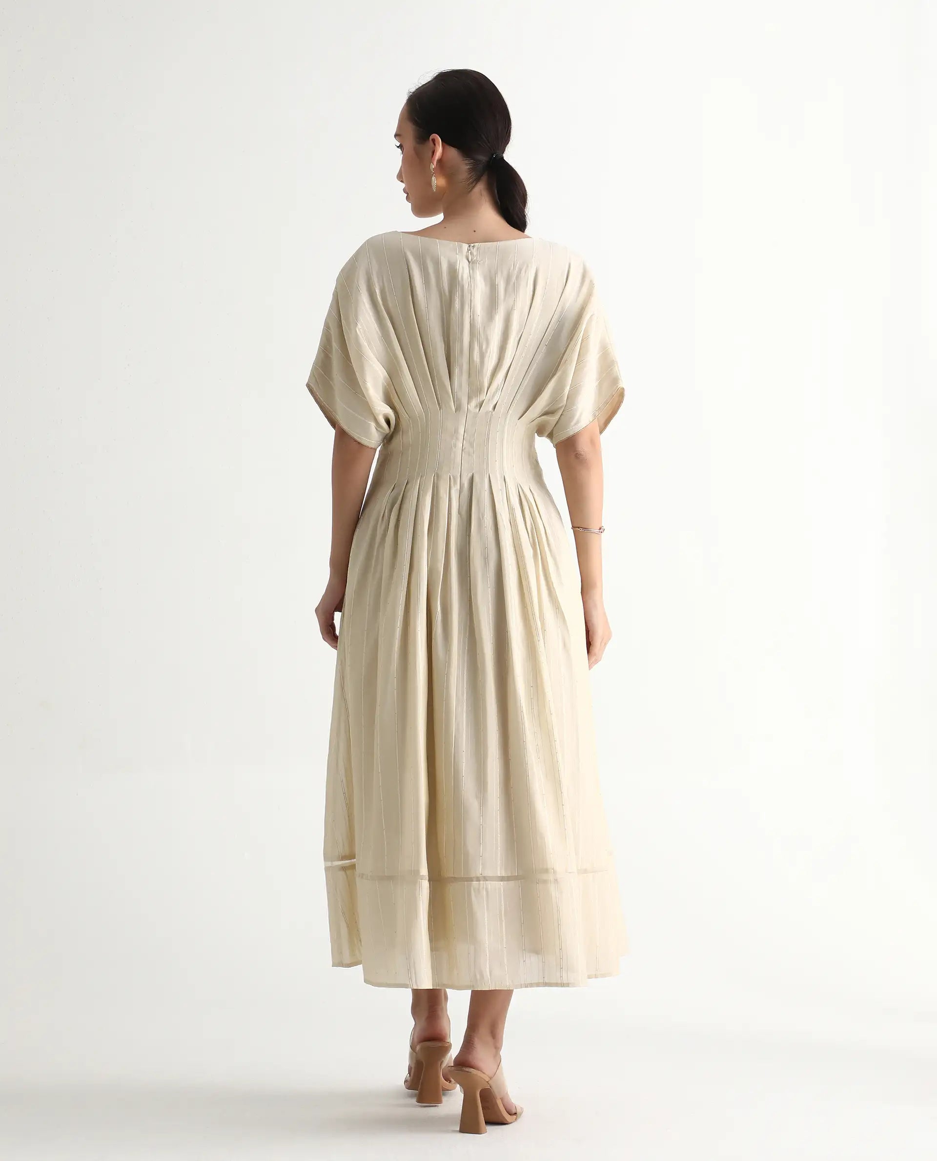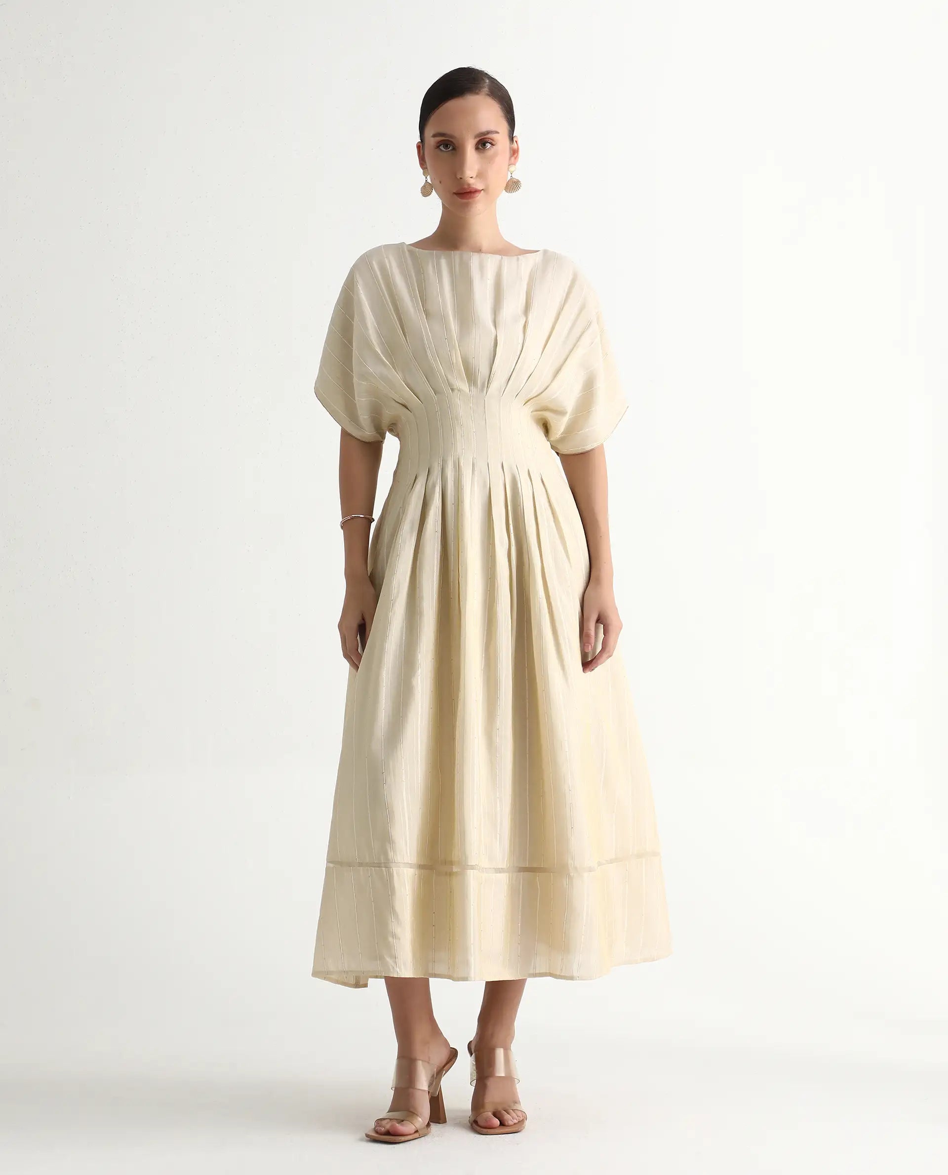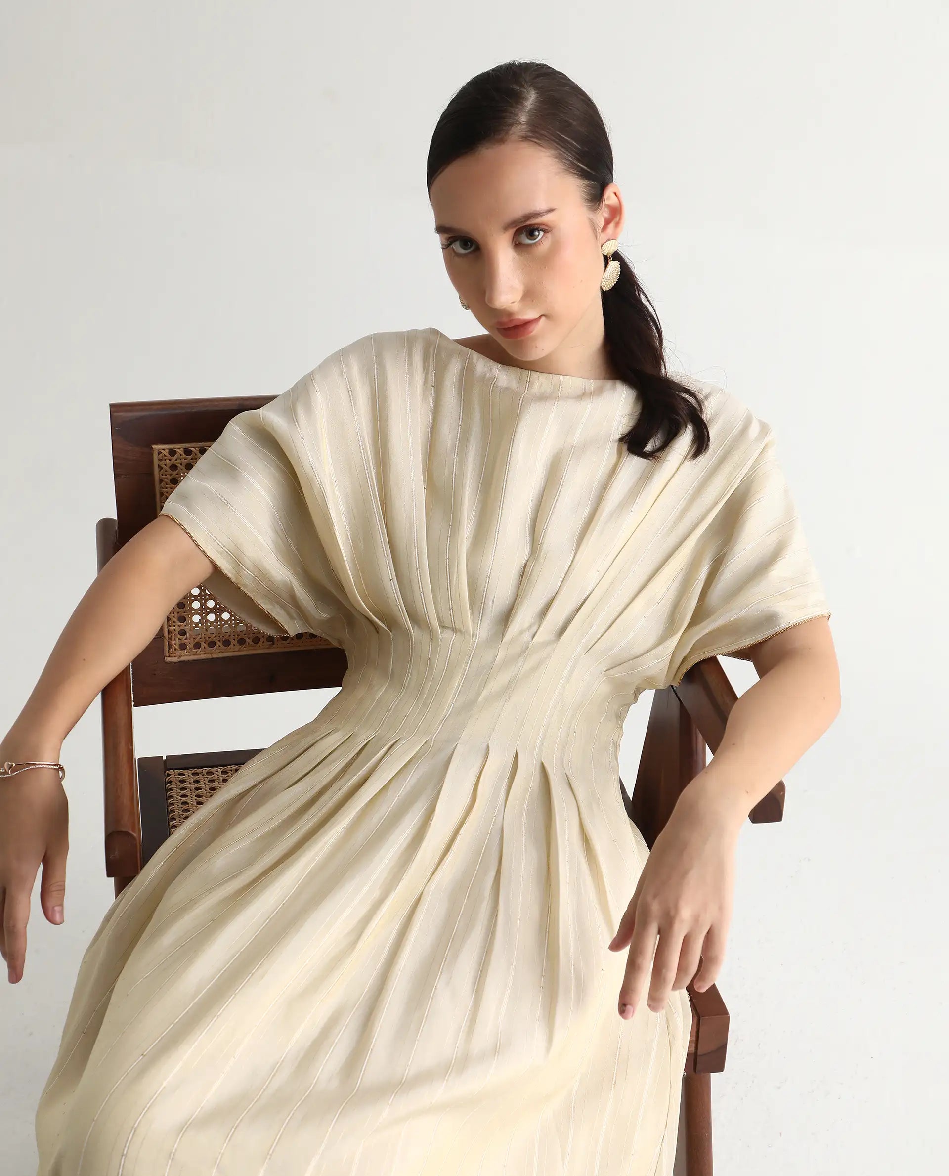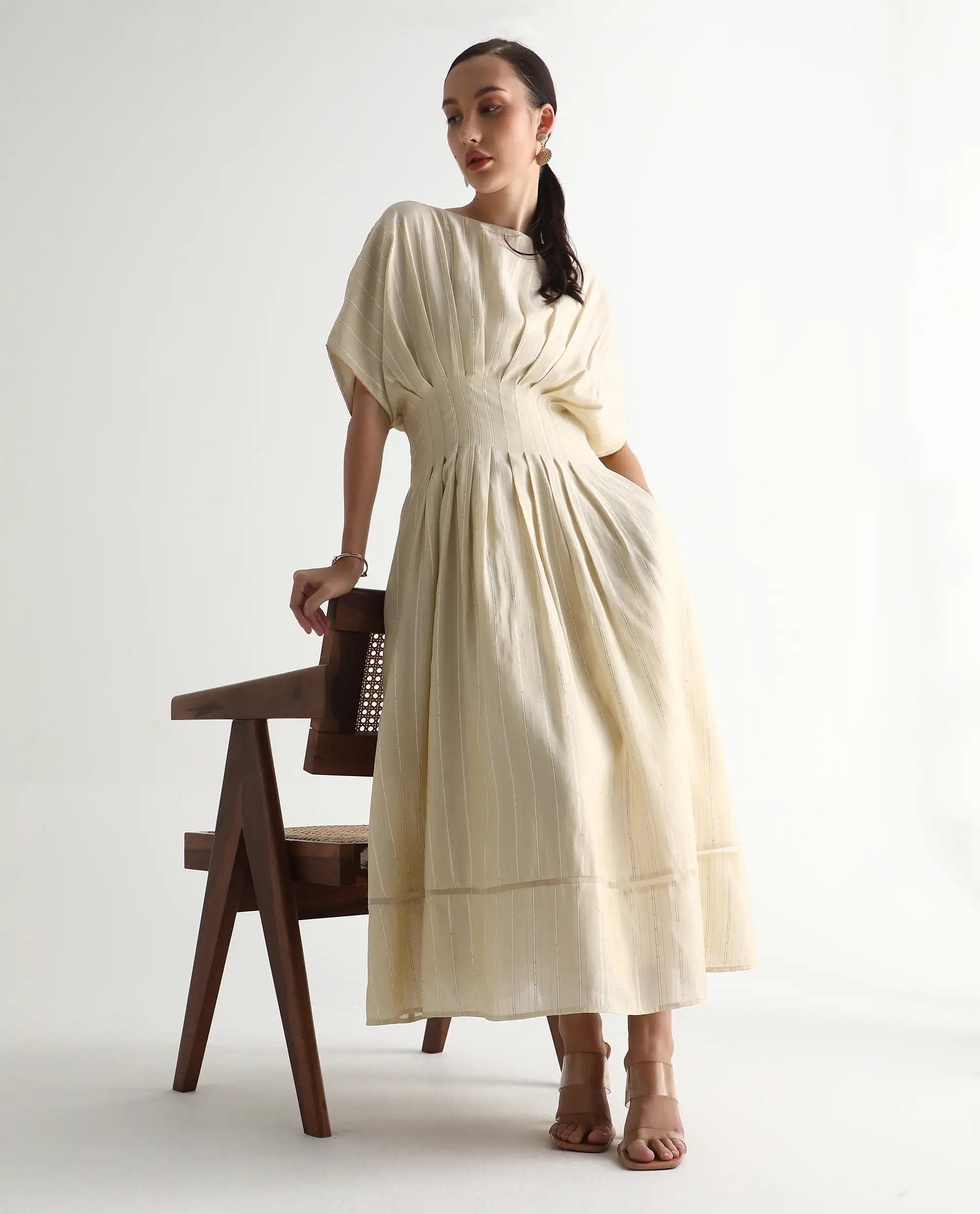 This off-white midi dress features a classic round neck and a convenient zipper closure for a secure fit. Designed with a fit-and-flare silhouette, it flatters the figure while offering comfortable movement. Its plain, elegant design makes it a versatile choice for both casual and semi-formal occasions. Crafted to combine style and ease, this dress is an essential addition to a refined wardrobe.