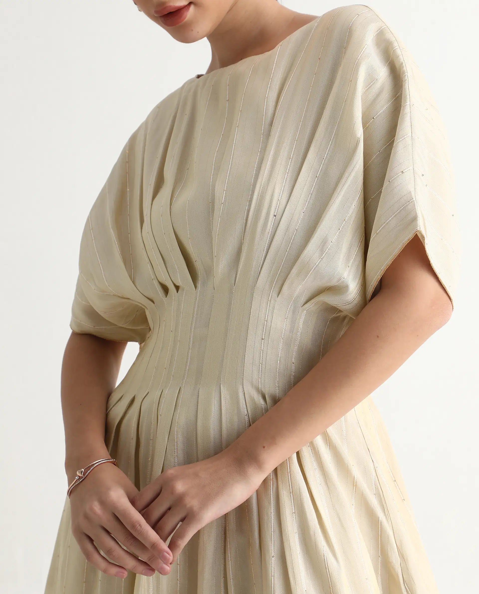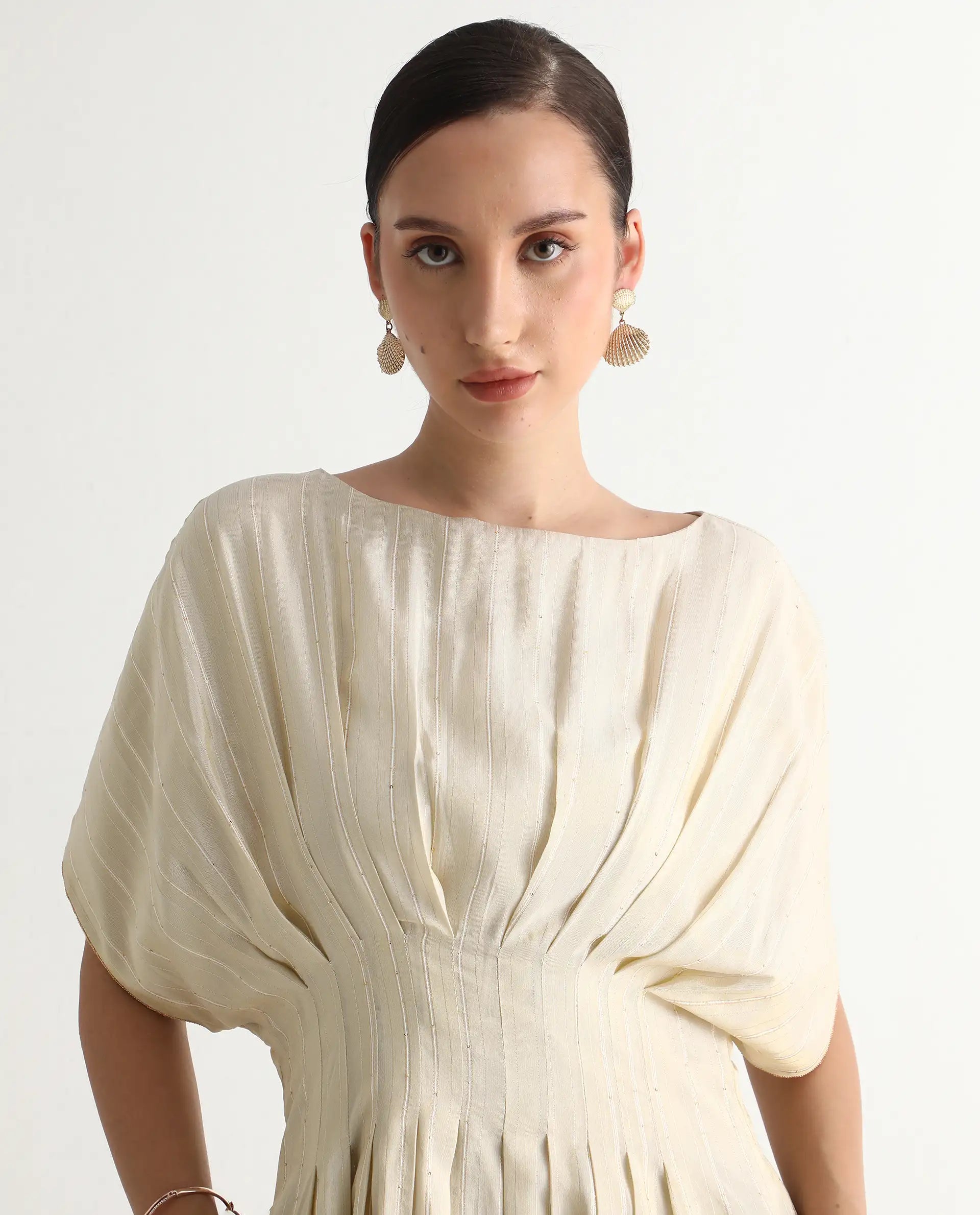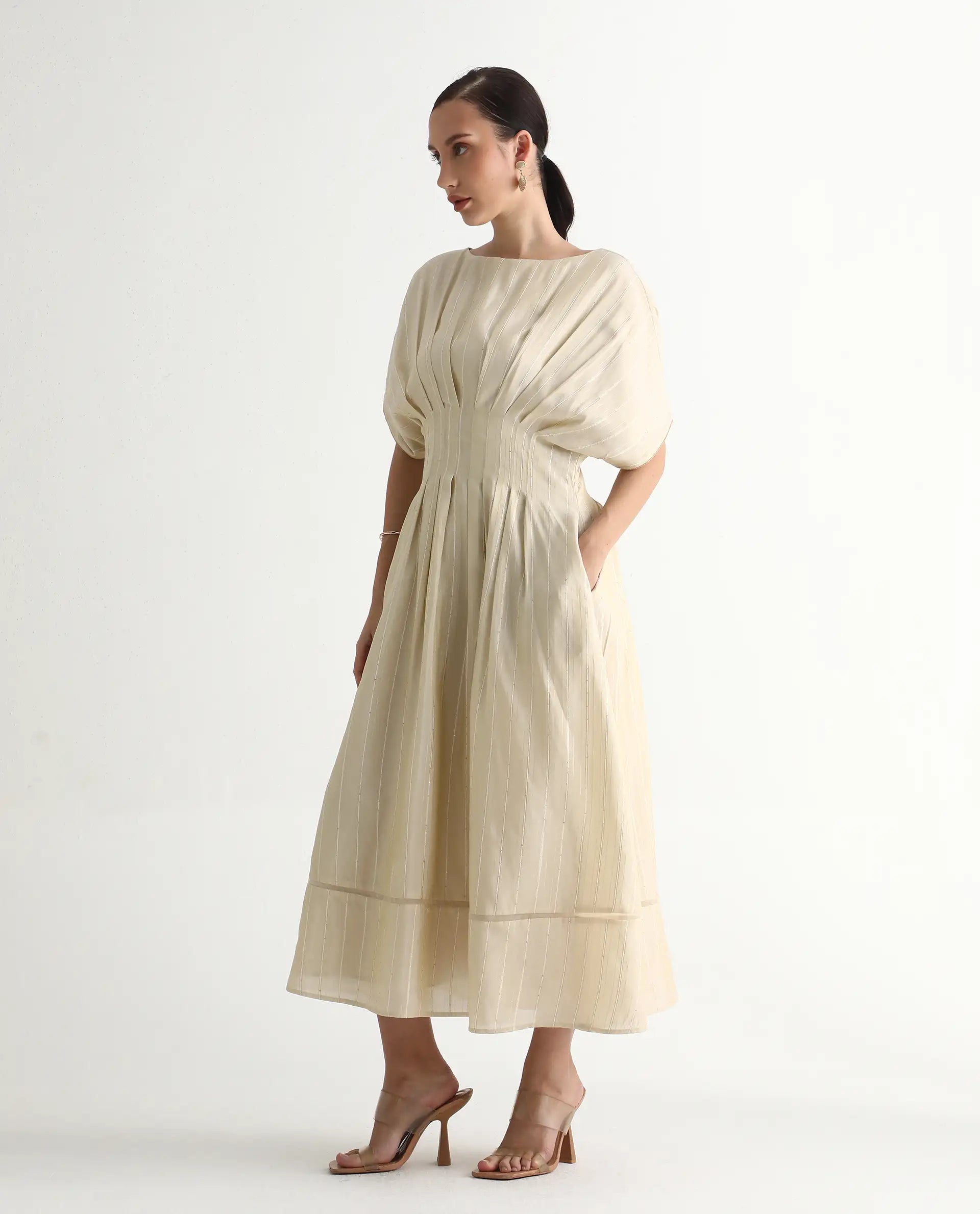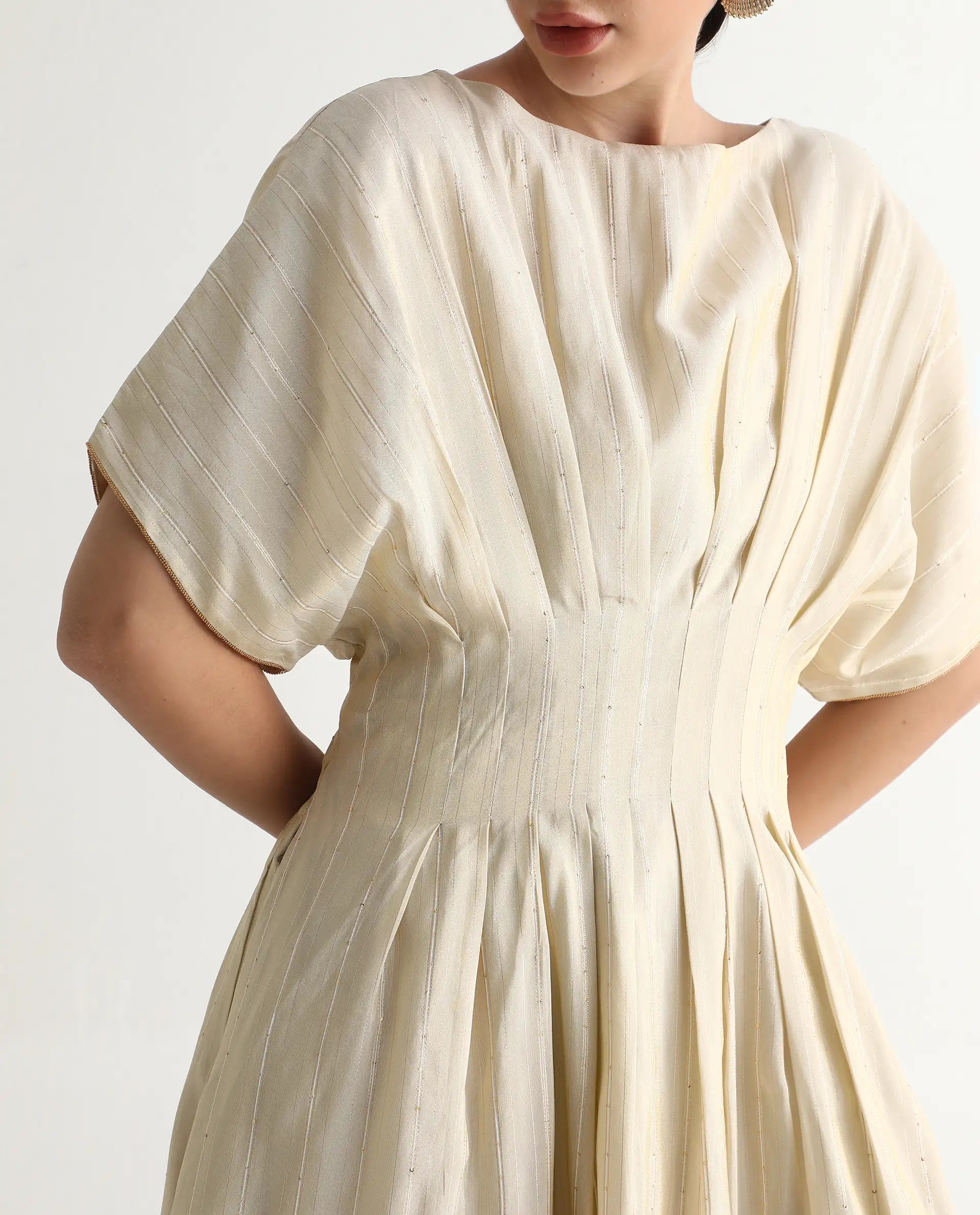This off-white midi dress features a classic round neck and a convenient zipper closure for a secure fit. Designed with a fit-and-flare silhouette, it flatters the figure while offering comfortable movement. Its plain, elegant design makes it a versatile choice for both casual and semi-formal occasions. Crafted to combine style and ease, this dress is an essential addition to a refined wardrobe.
