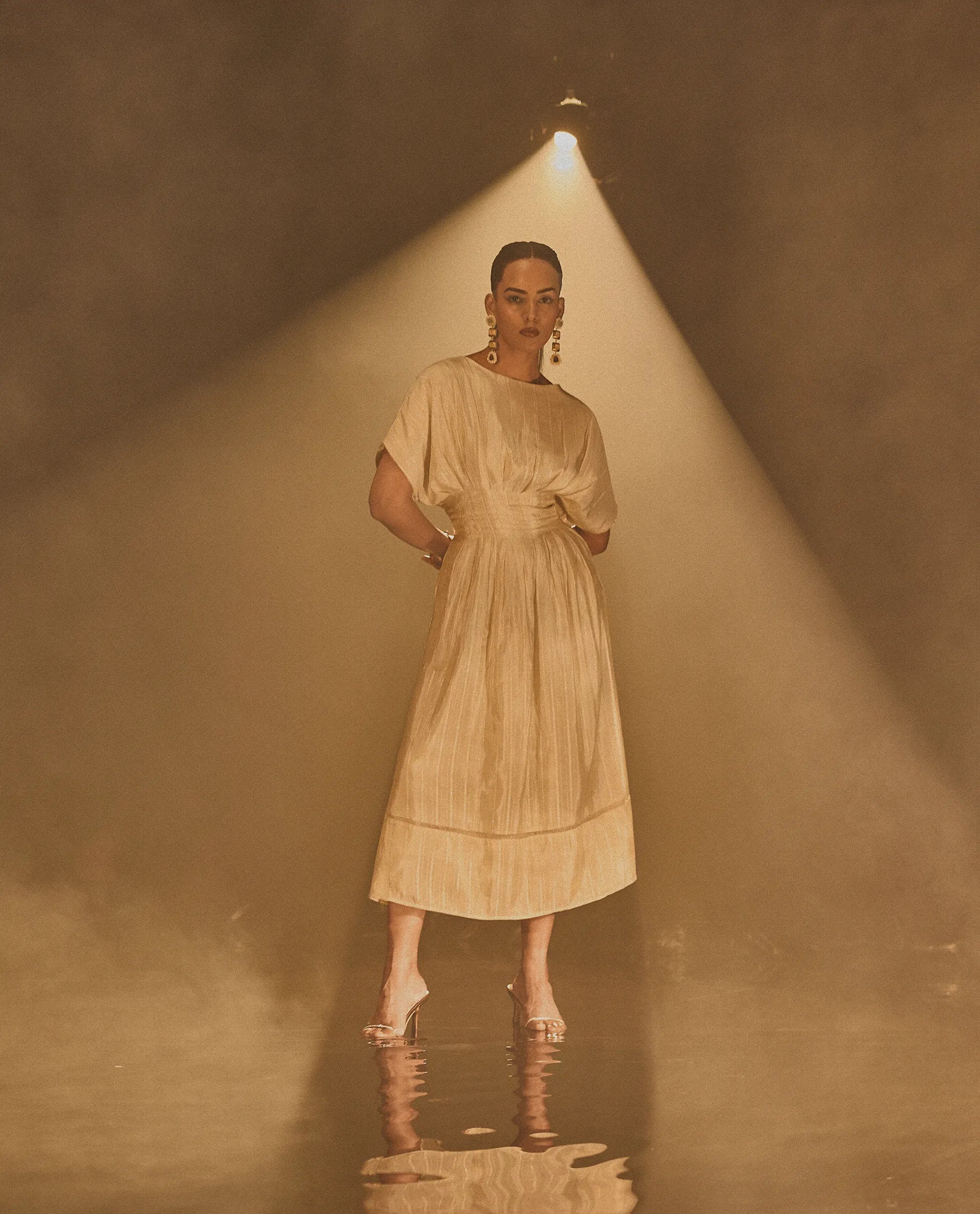 This off-white midi dress features a classic round neck and a convenient zipper closure for a secure fit. Designed with a fit-and-flare silhouette, it flatters the figure while offering comfortable movement. Its plain, elegant design makes it a versatile choice for both casual and semi-formal occasions. Crafted to combine style and ease, this dress is an essential addition to a refined wardrobe.