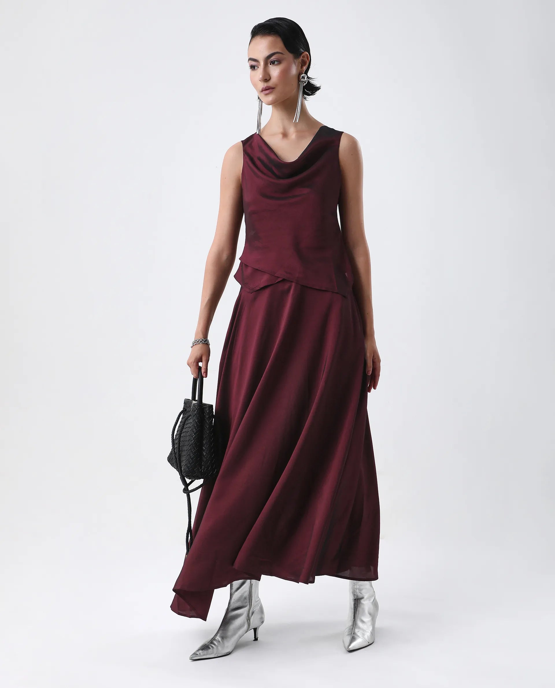 This sleeveless top from Rareism features a maroon polyester fabric with a stylish cowl neck and a convenient zipper closure. Designed for a regular fit, it offers both comfort and a refined silhouette, making it an excellent choice for versatile, elegant wear.