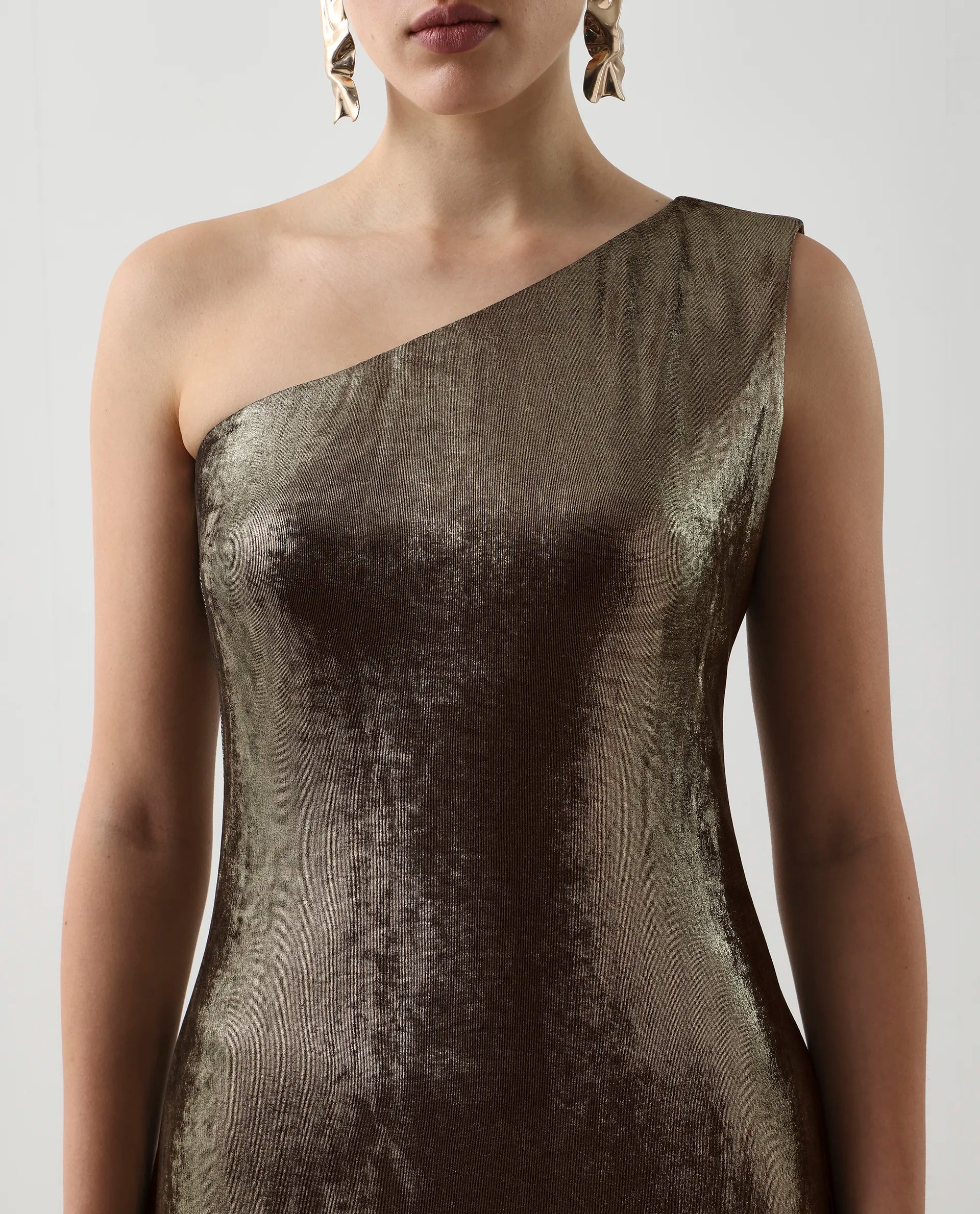 This Rareism Women Avip Gold dress features a sophisticated one-shoulder design with a secure zipper closure, offering a flattering fit-and-flare silhouette. Crafted as a midi-length plain dress, it combines elegance with comfort, making it ideal for formal events or stylish gatherings. The tailored fit enhances your shape while the flare adds graceful movement, ensuring a polished and confident look.