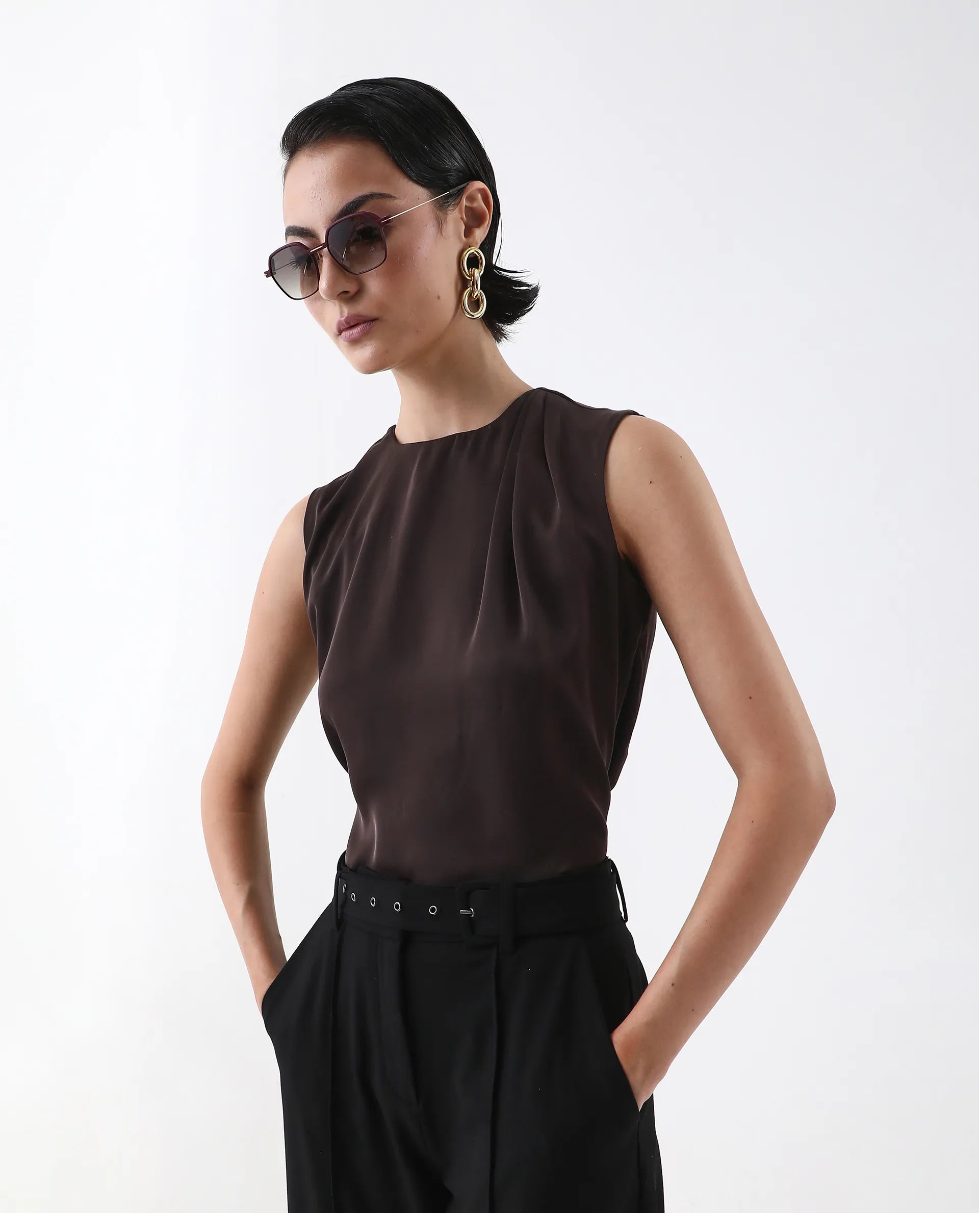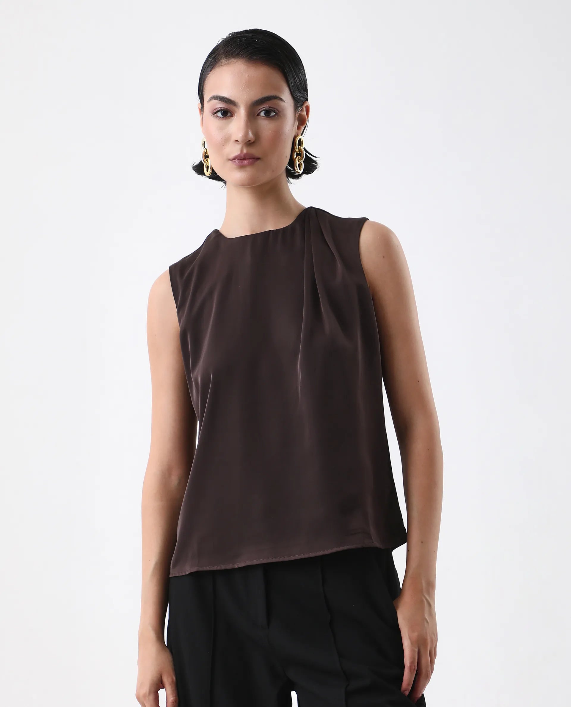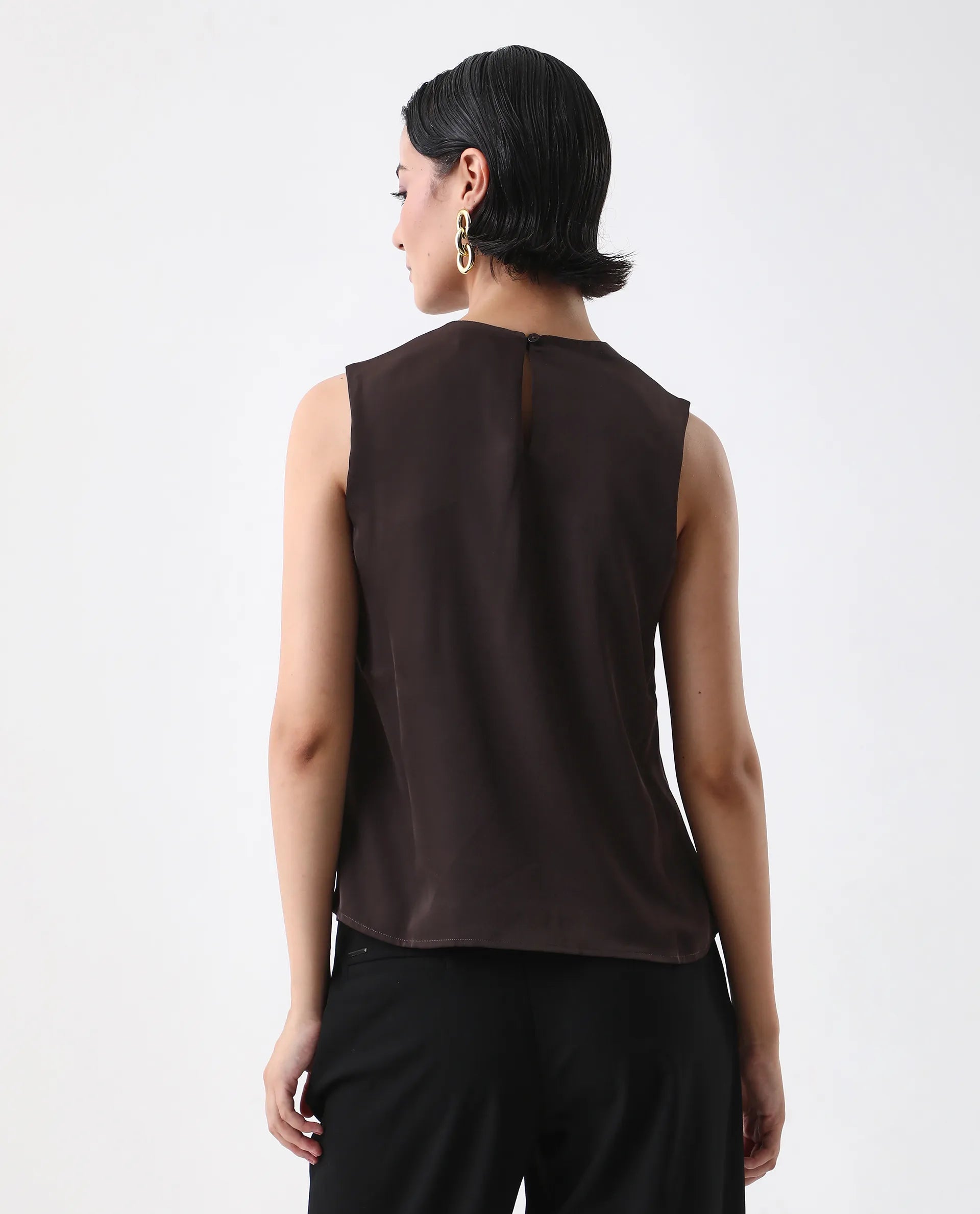 Elevate your wardrobe with the Rareism Women Aviso Brown Round Neck Top, featuring a classic button closure for a refined finish. Crafted in a rich navy hue, this plain top offers versatile styling options, perfect for both professional and casual settings. Its round neck design ensures comfort and a flattering fit, making it an essential piece for a polished, expert look.