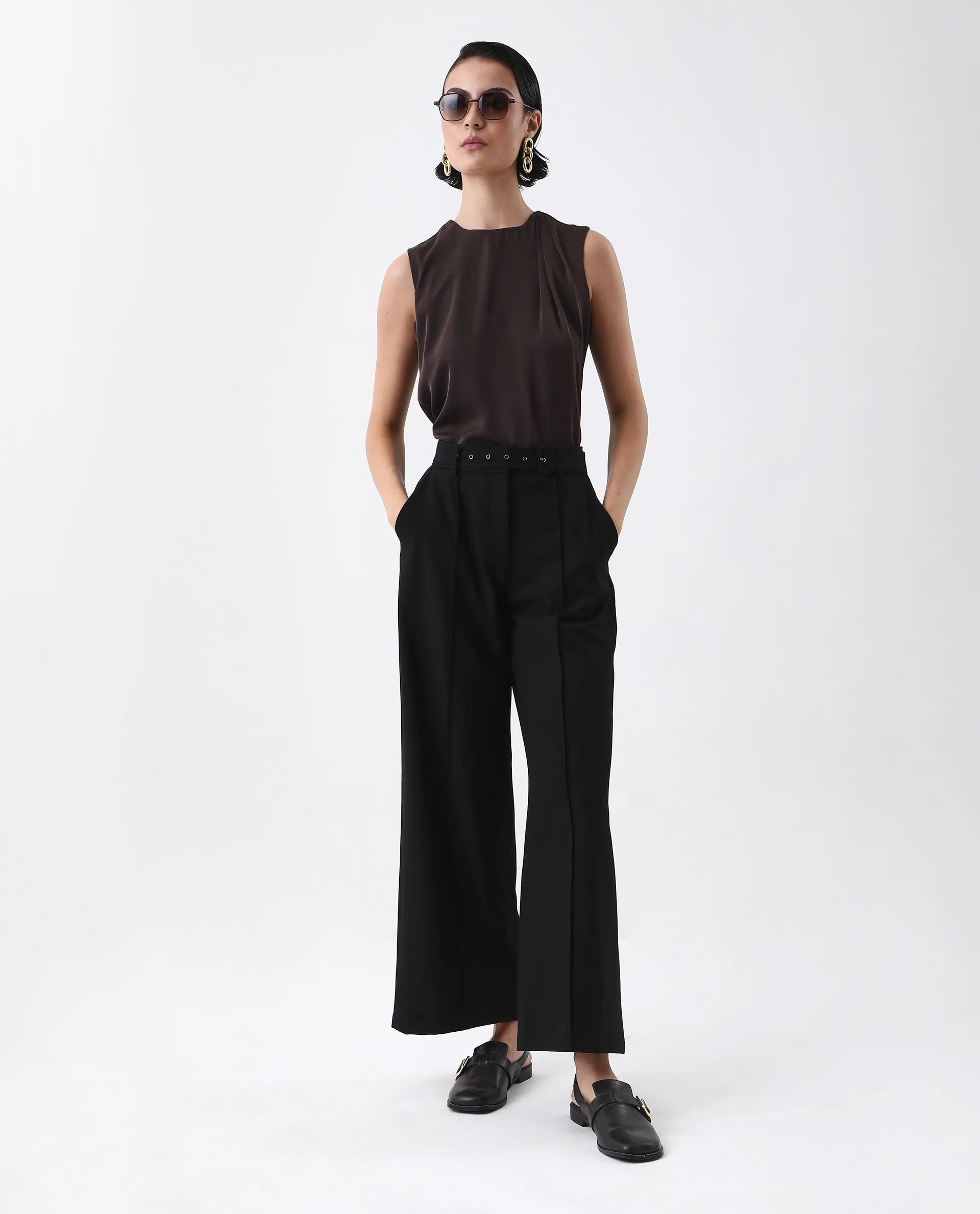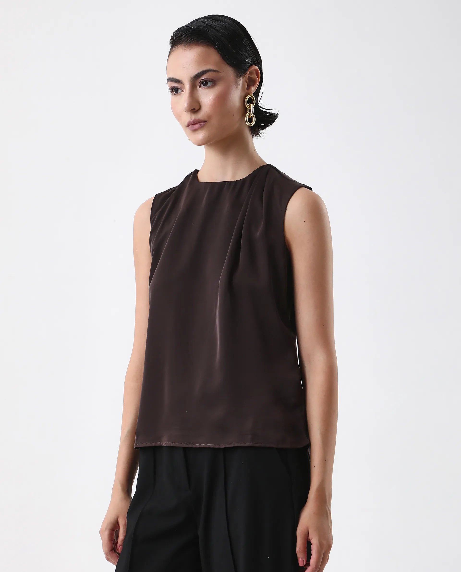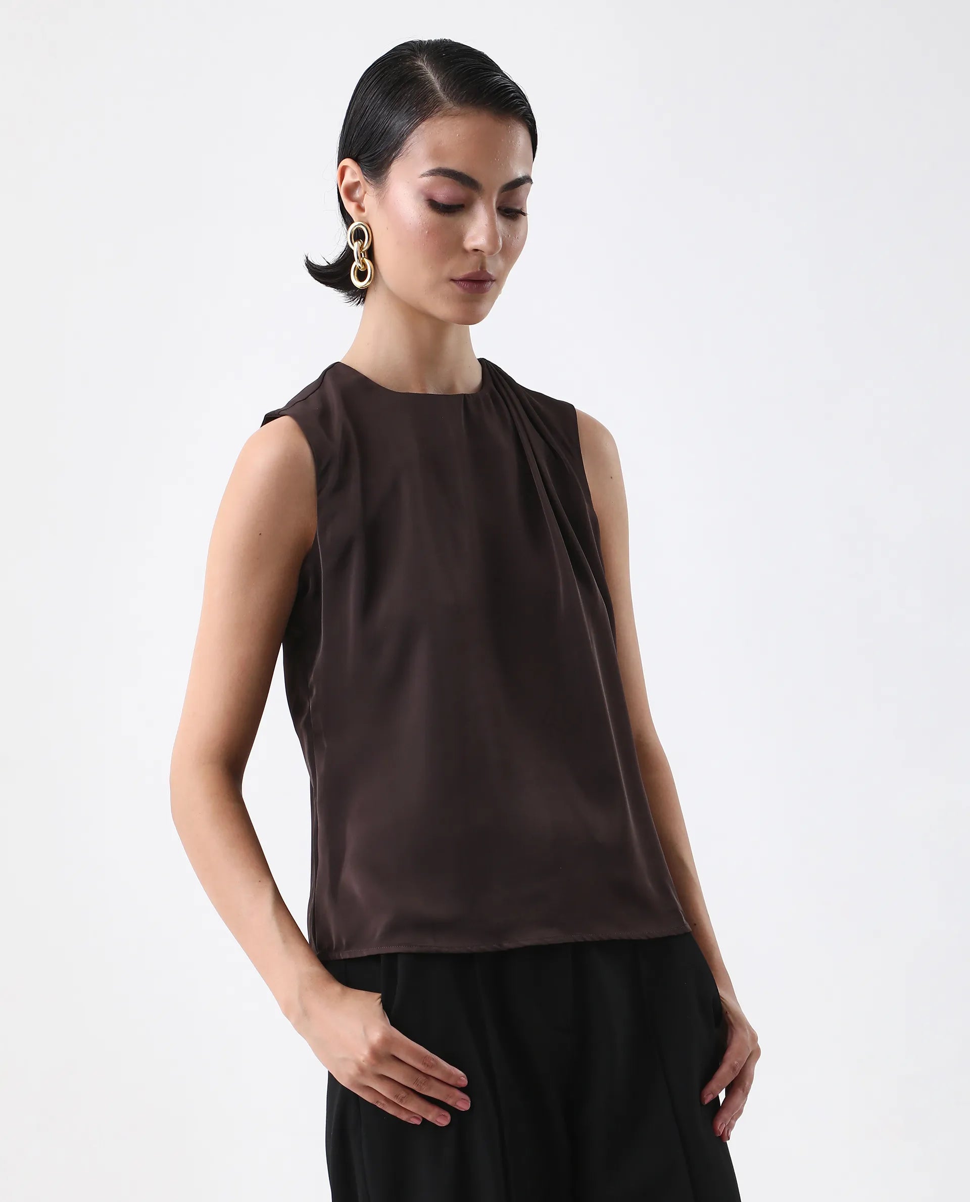 Elevate your wardrobe with the Rareism Women Aviso Brown Round Neck Top, featuring a classic button closure for a refined finish. Crafted in a rich navy hue, this plain top offers versatile styling options, perfect for both professional and casual settings. Its round neck design ensures comfort and a flattering fit, making it an essential piece for a polished, expert look.