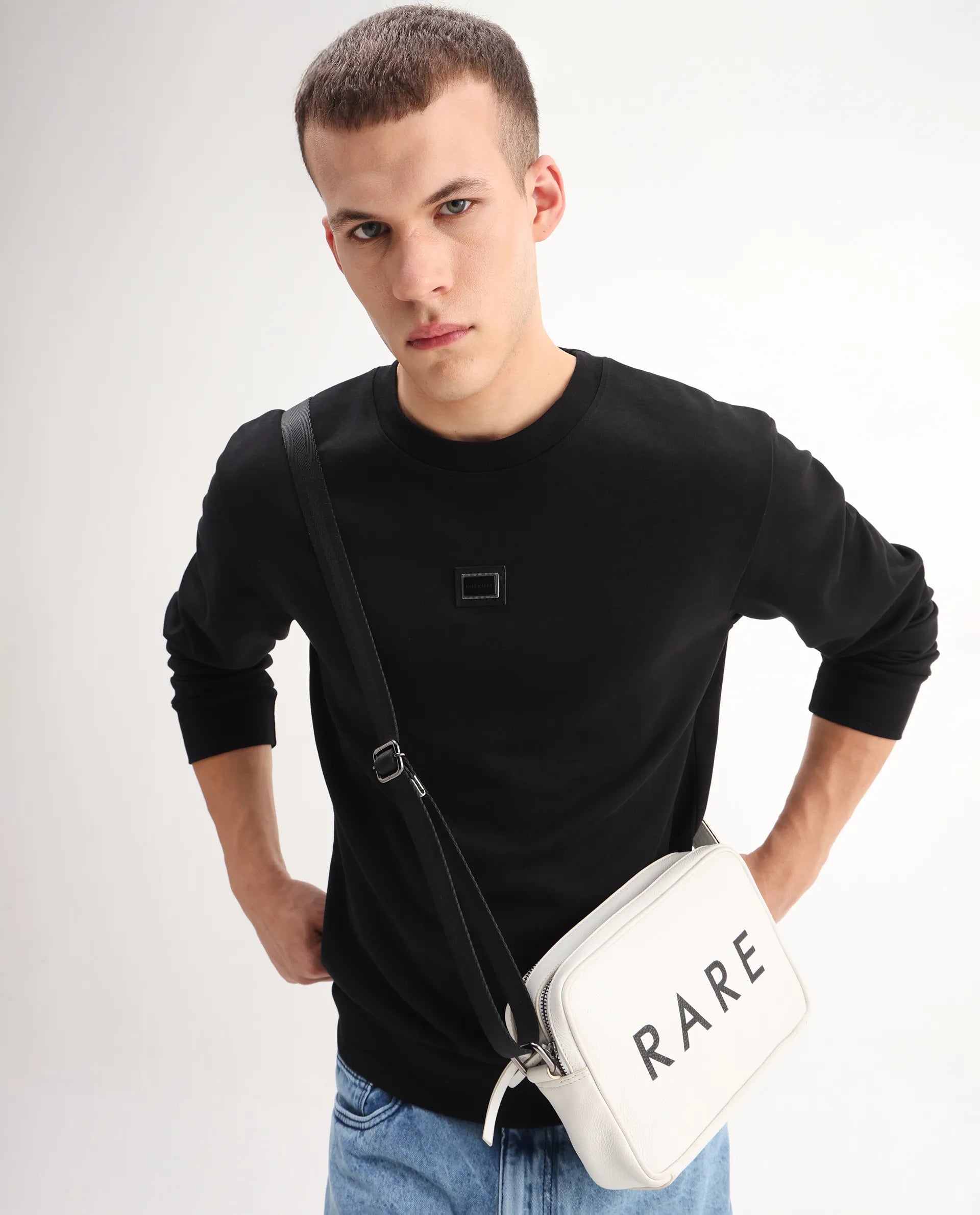 Rare Rabbit Men's Badget-25 Black Cotton Blend Badge Print Regular Fit Full Sleeve Crew Neck Sweatshirt
