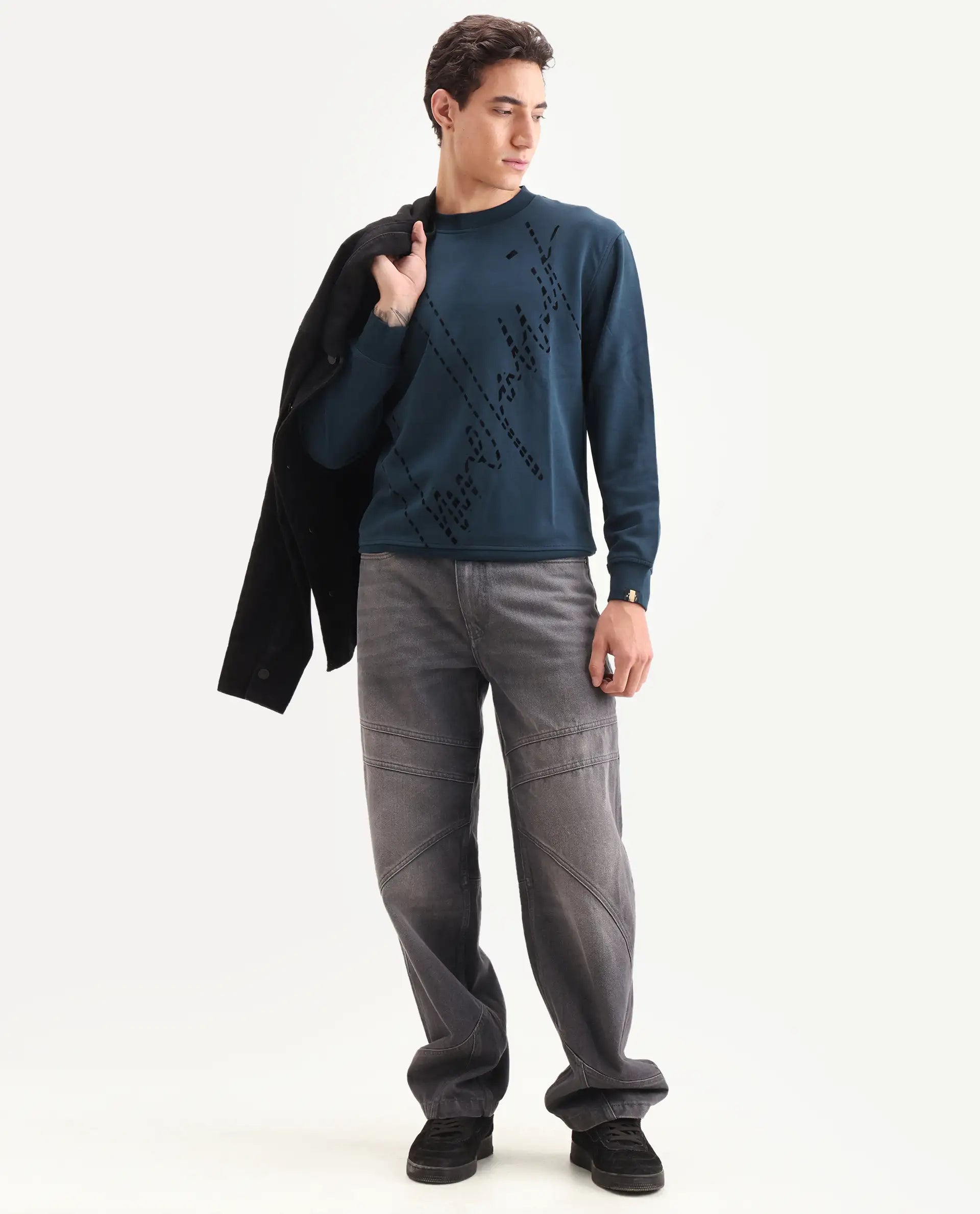 Rare Rabbit Men's Barak Teal Cotton Graphic Print Regular Fit Full Sleeve Crew Neck Sweatshirt