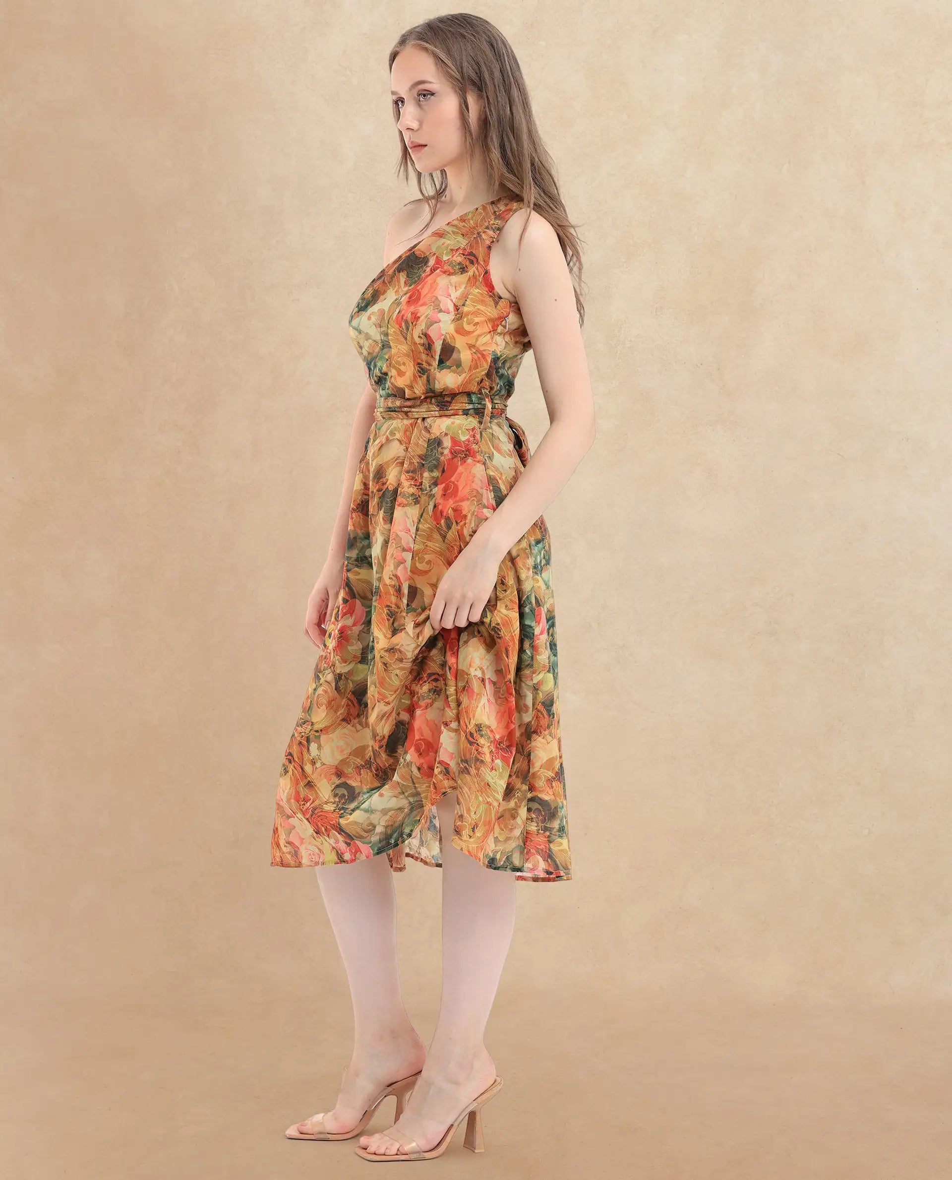 Rareism Women's Barney Multi Cotton One Shoulder Abstract Print One Shoulder Midi Fit And Flare Dress