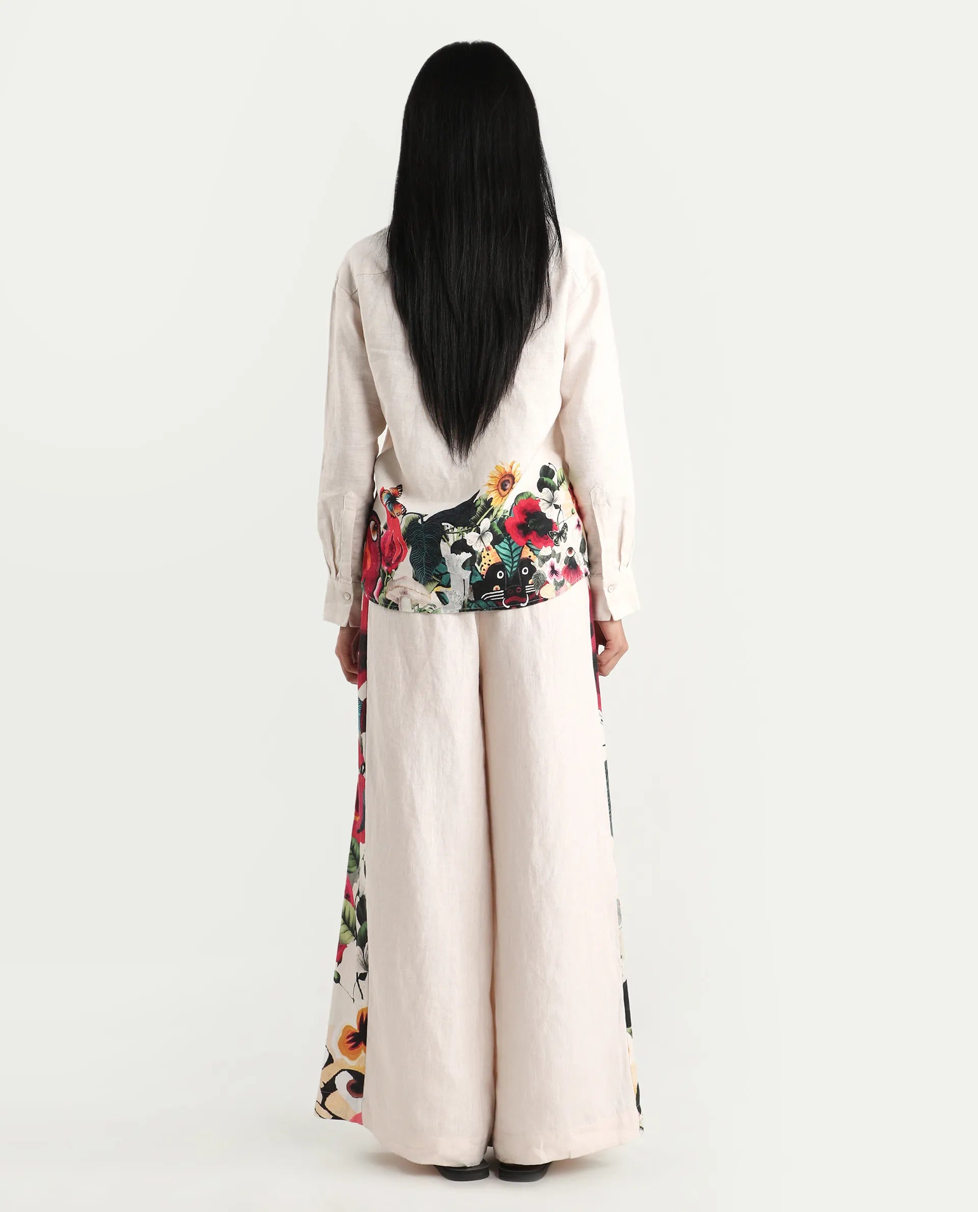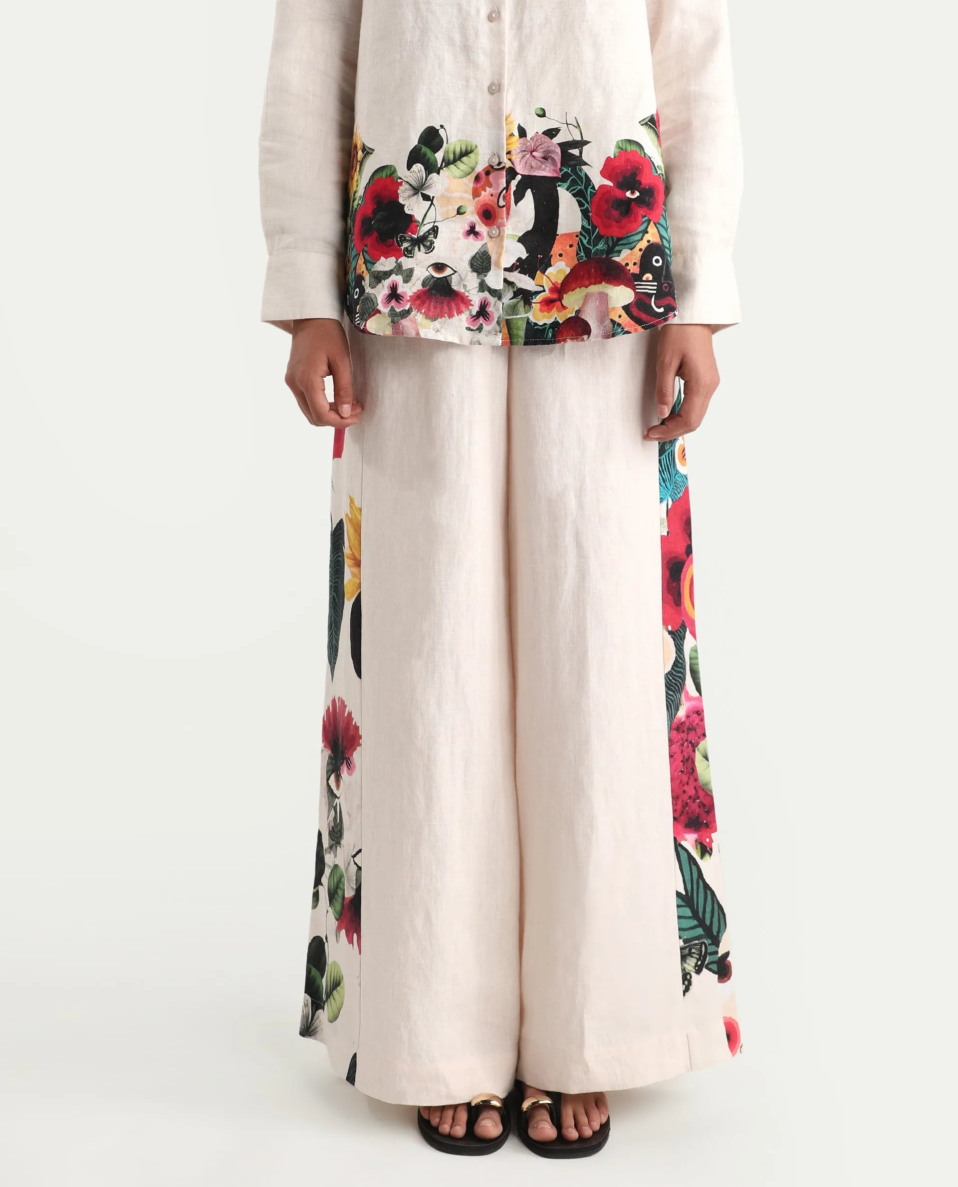 SOLID LINEN WIDE TROUSER WITH PRINTED PANEL