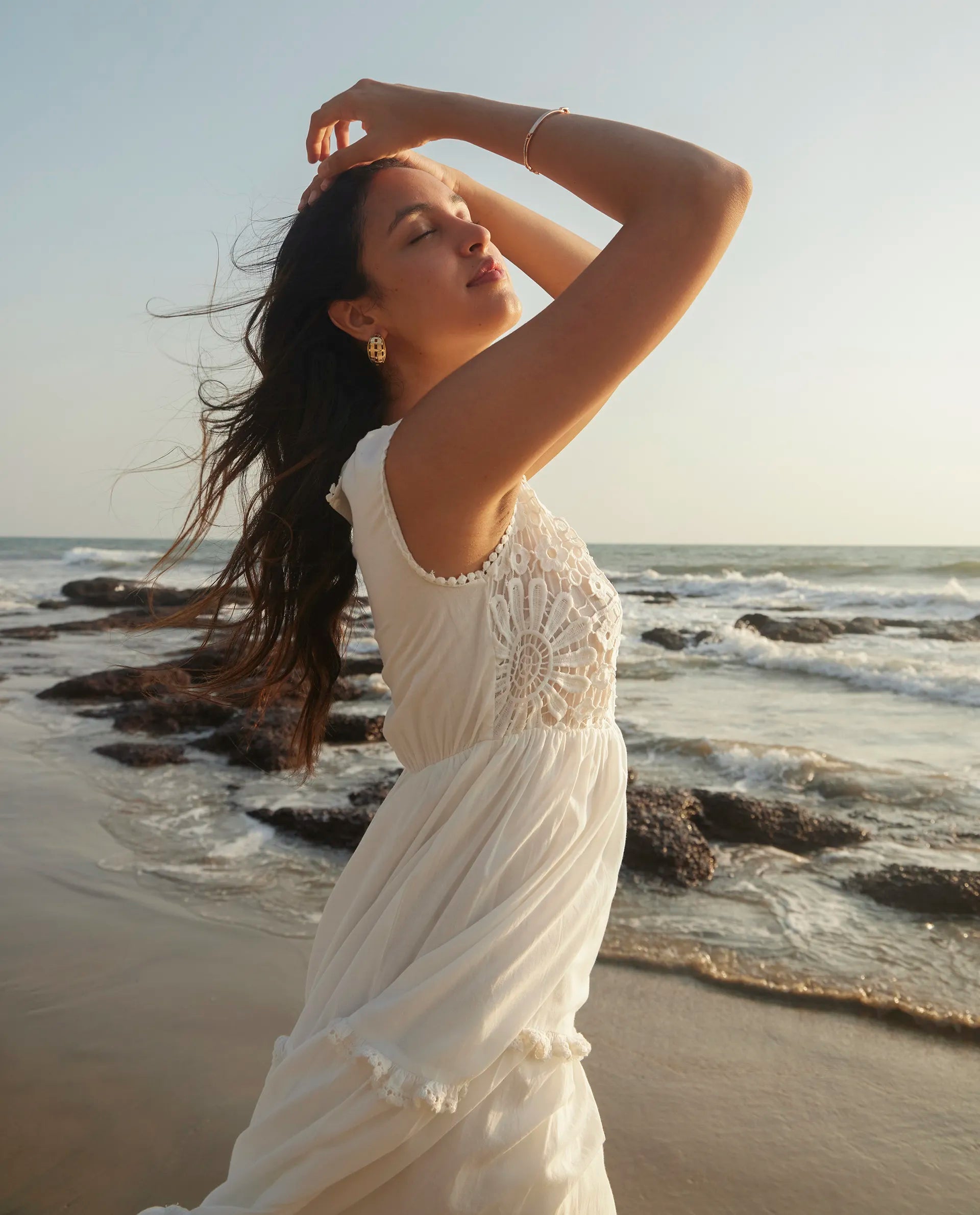 - The model (Chest-34, Waist-28, Hips-38, Height-178 cms) is wearing a size XS.