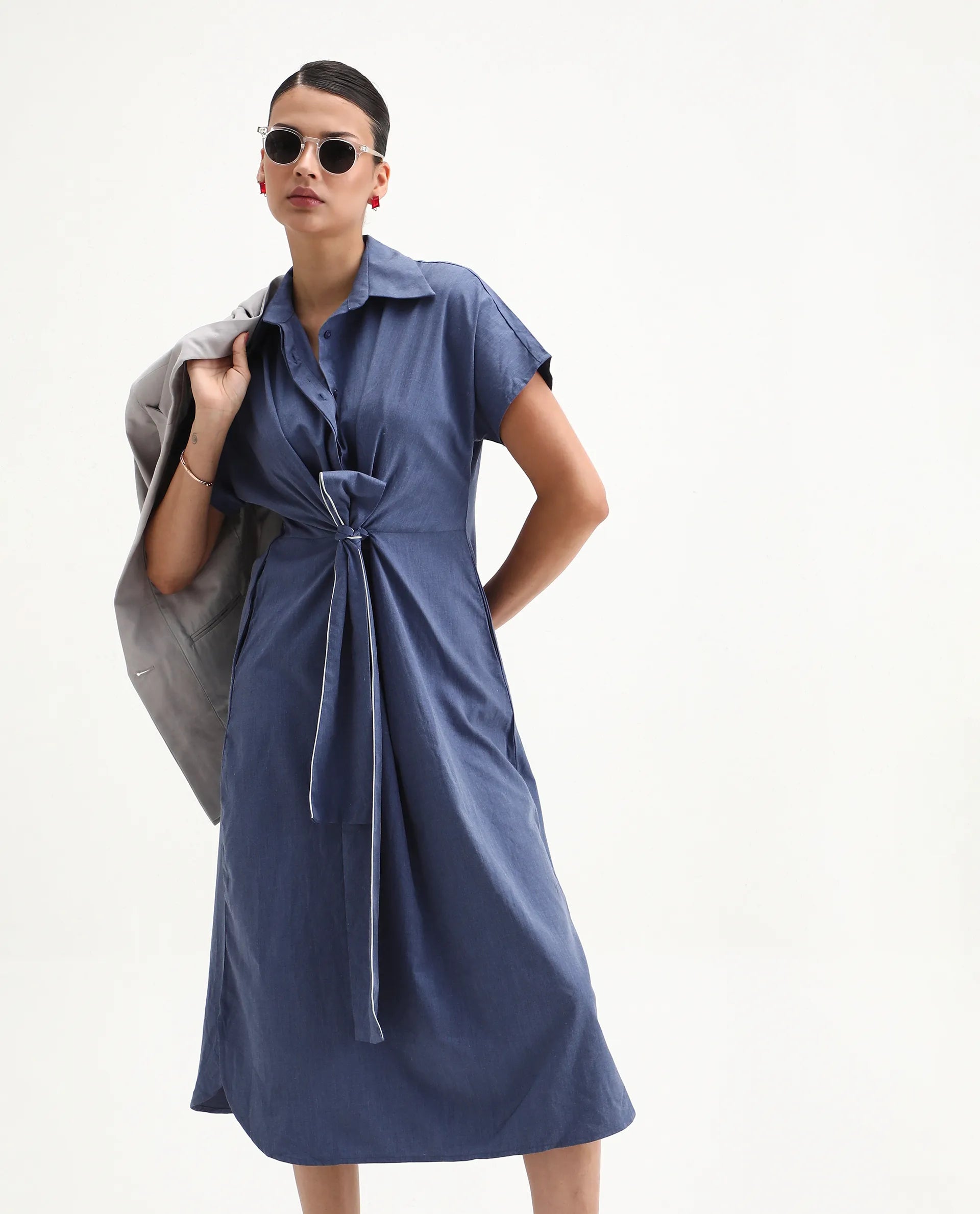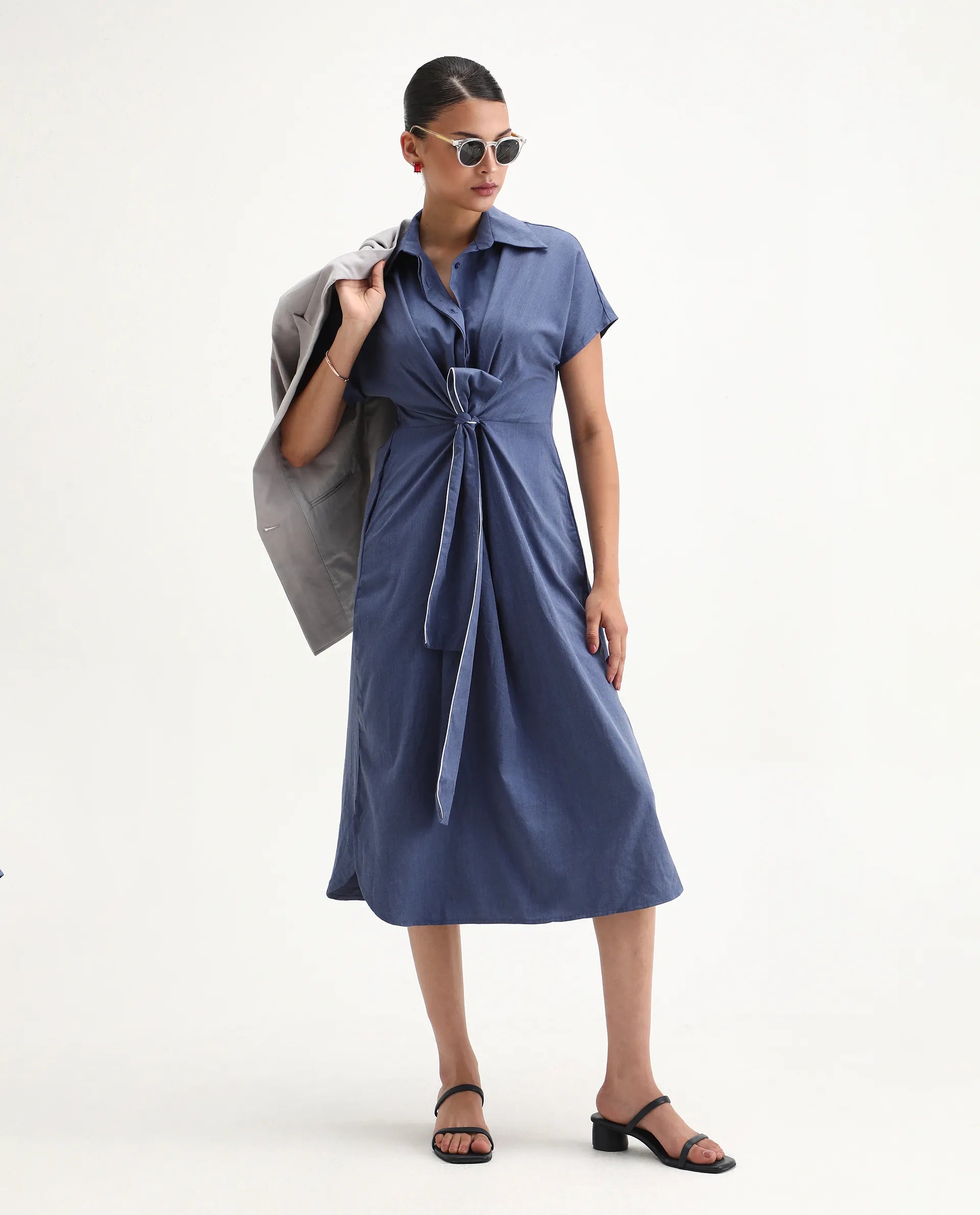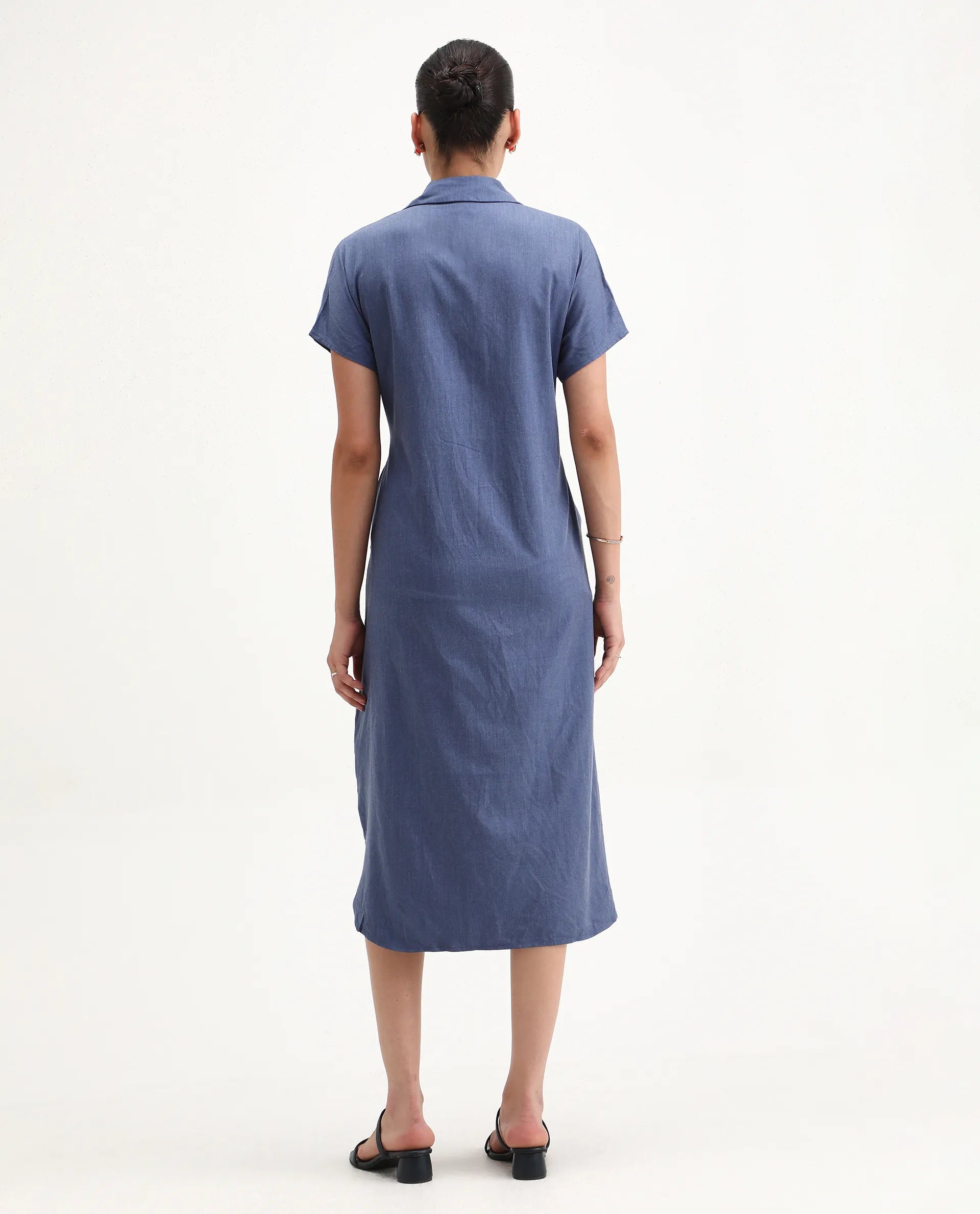 Rareism Women's Bhaque Light Blue Polyester Blend Spread Collar Plain Balloon Sleeve Midi Straight Fit Dress