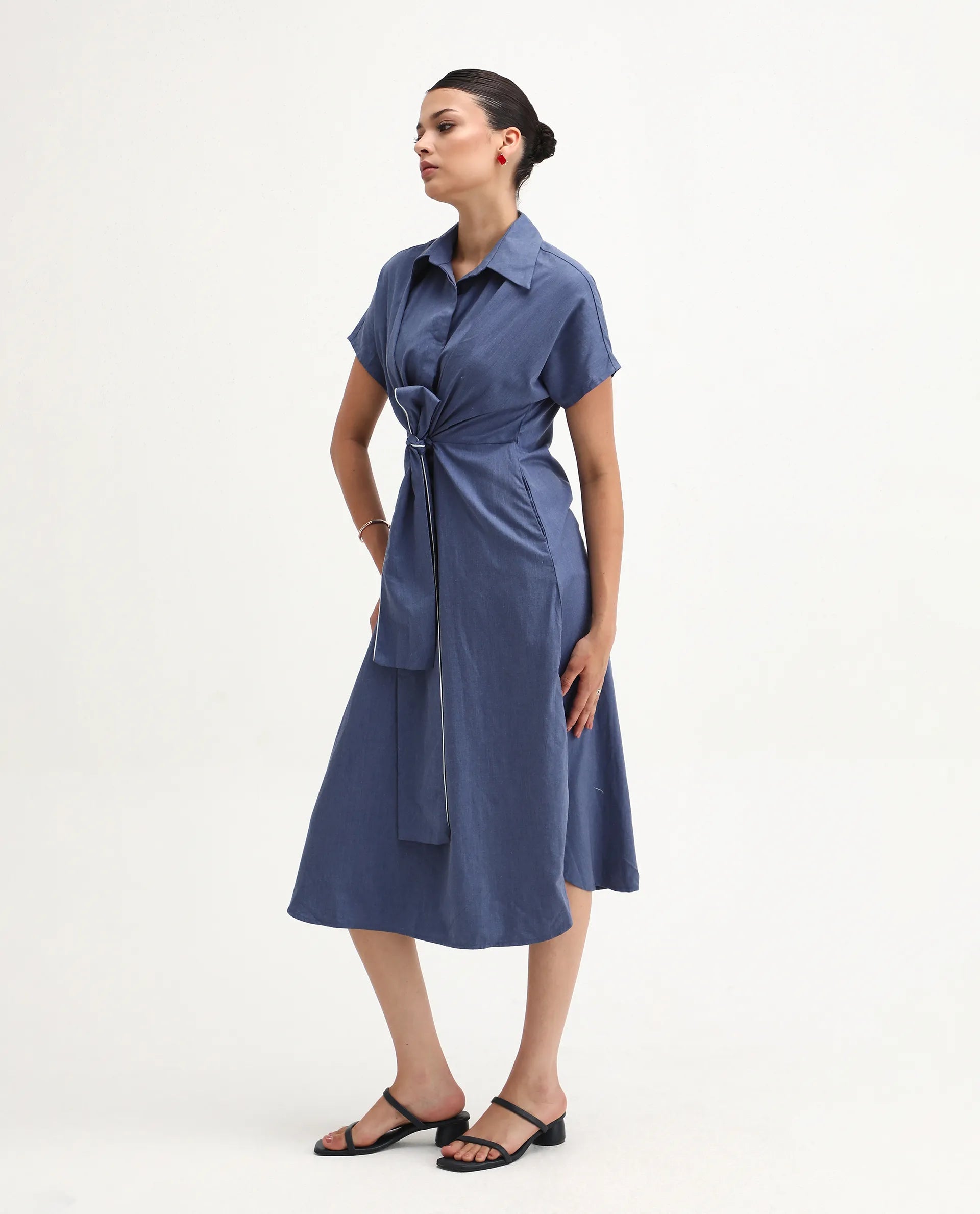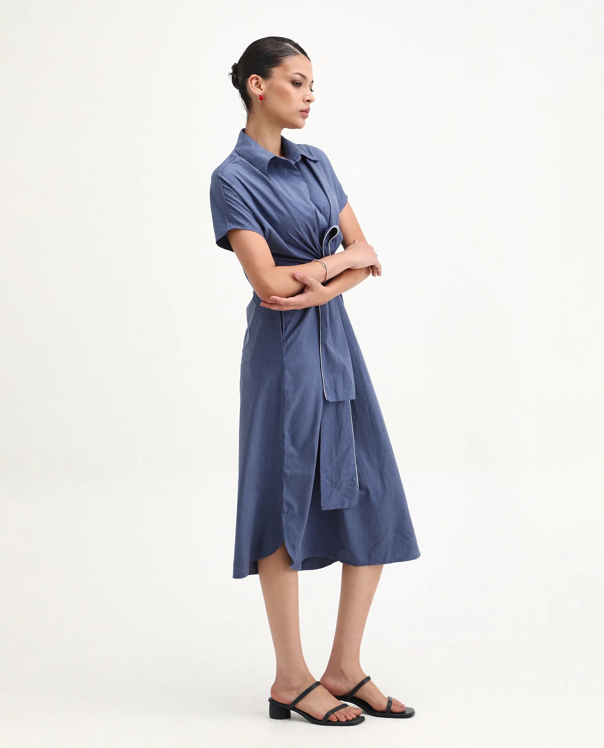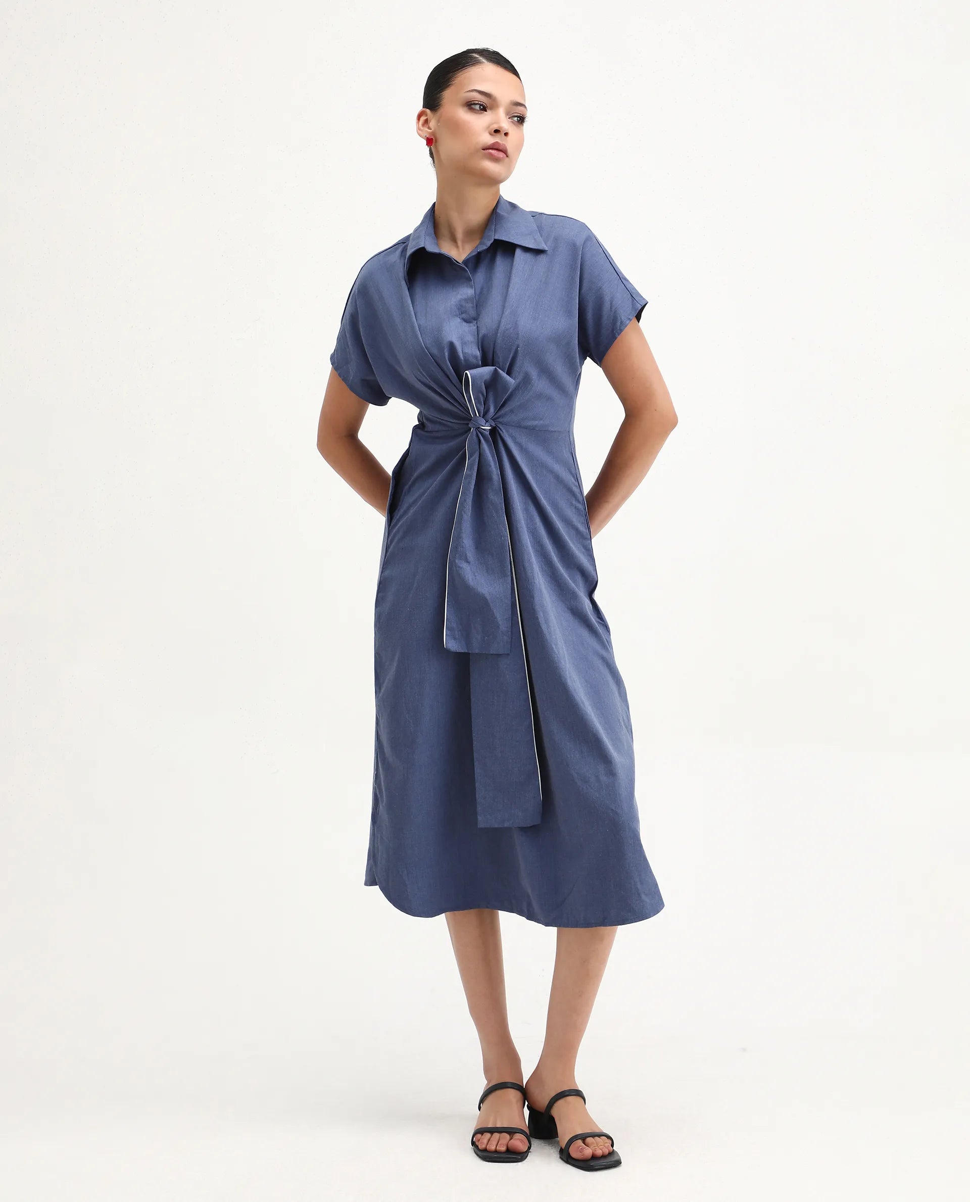 Rareism Women's Bhaque Light Blue Polyester Blend Spread Collar Plain Balloon Sleeve Midi Straight Fit Dress