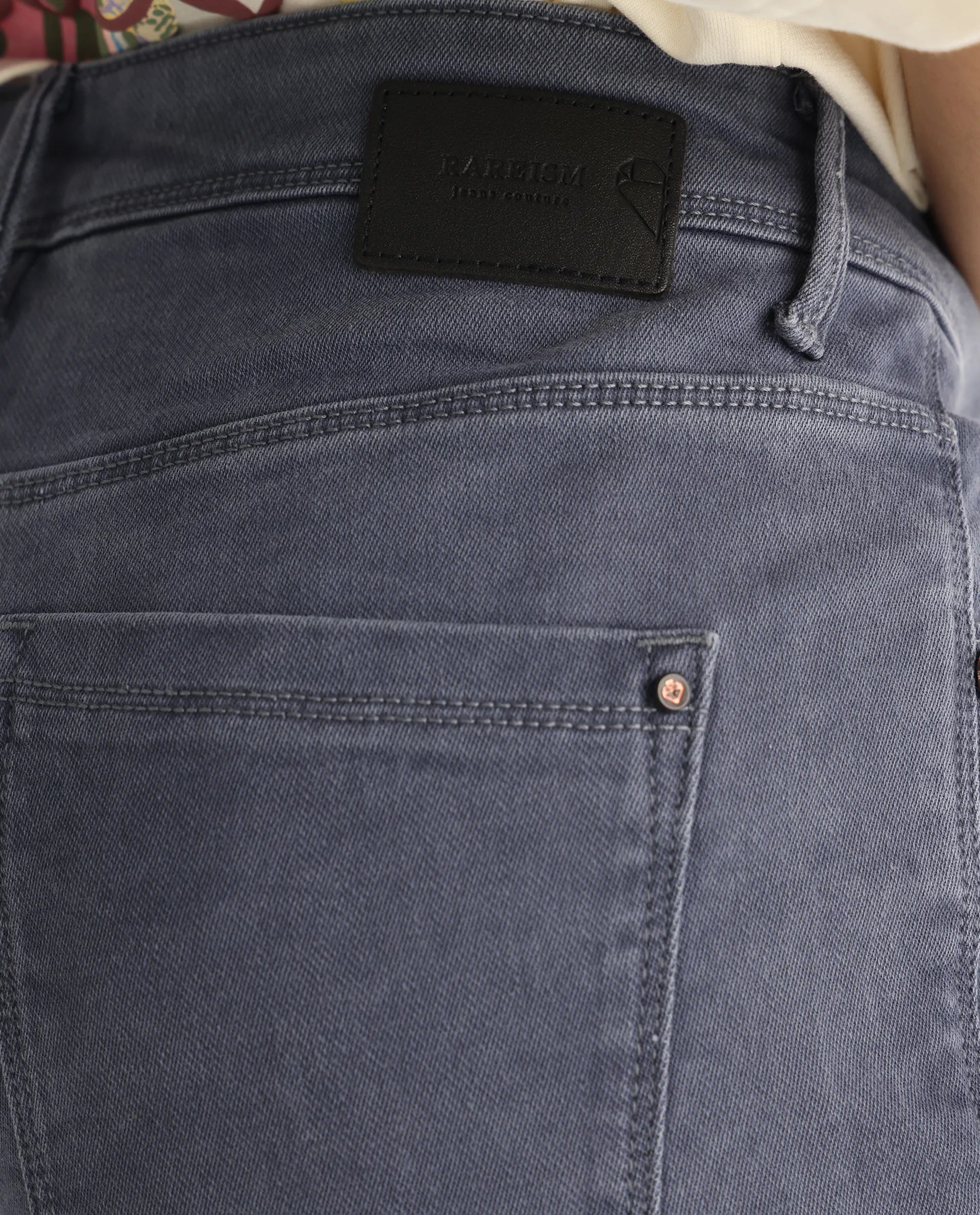 - With button closure, a zip fly , and 4 pockets, belt loops at waist and raw hem.