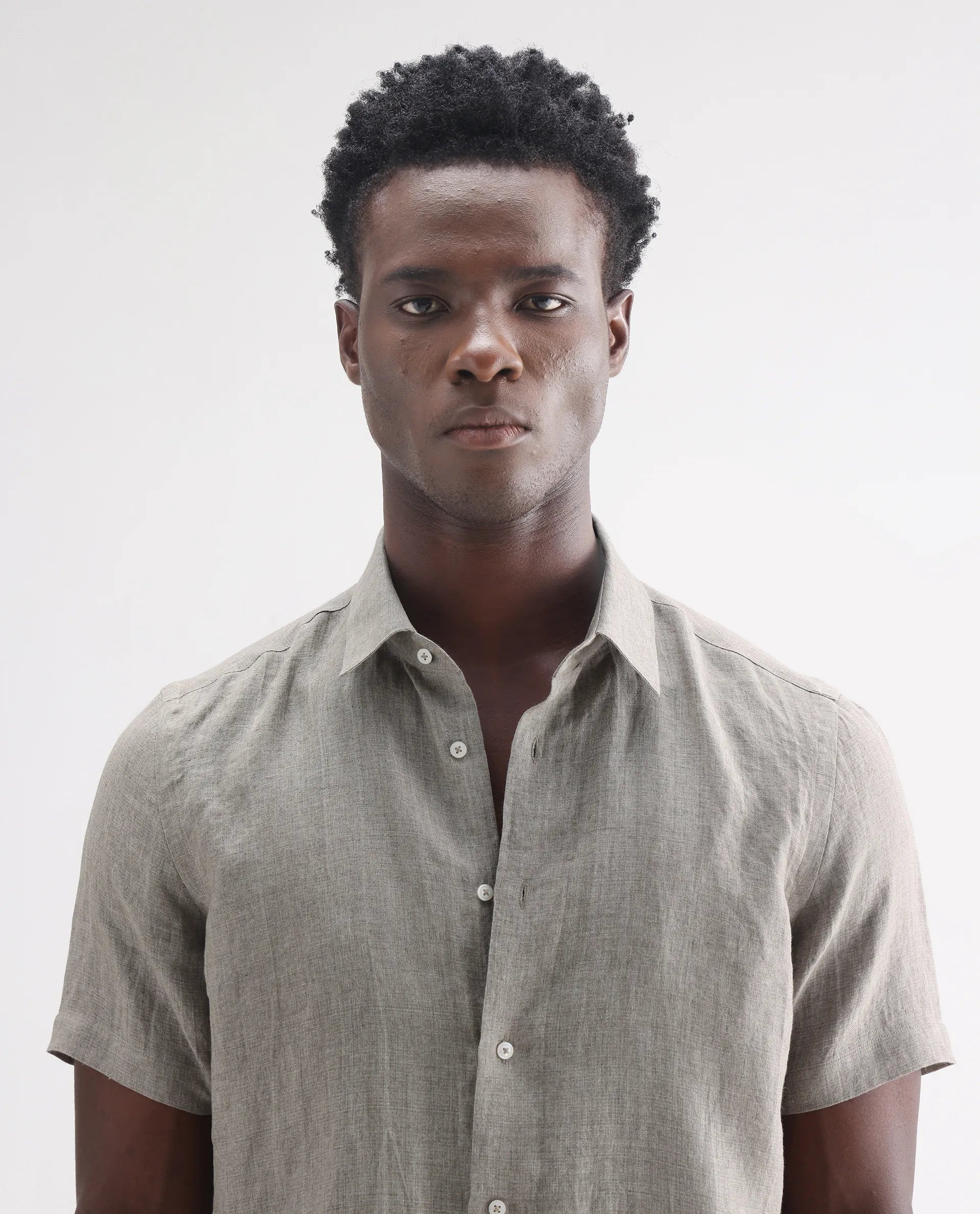 Rare Rabbit Men's Brisbane Ss Brown 100% Linen Plain Regular Fit Half Sleeve Collared Shirt