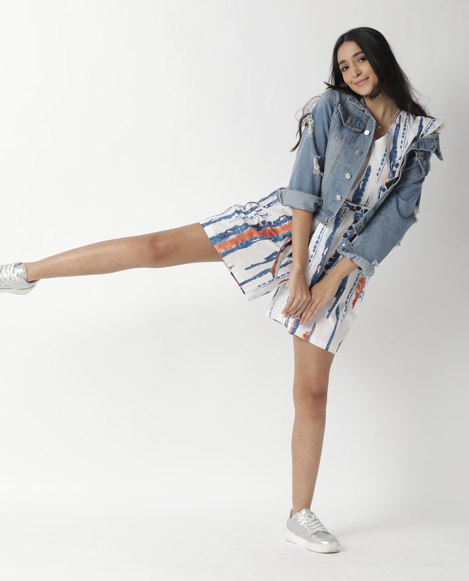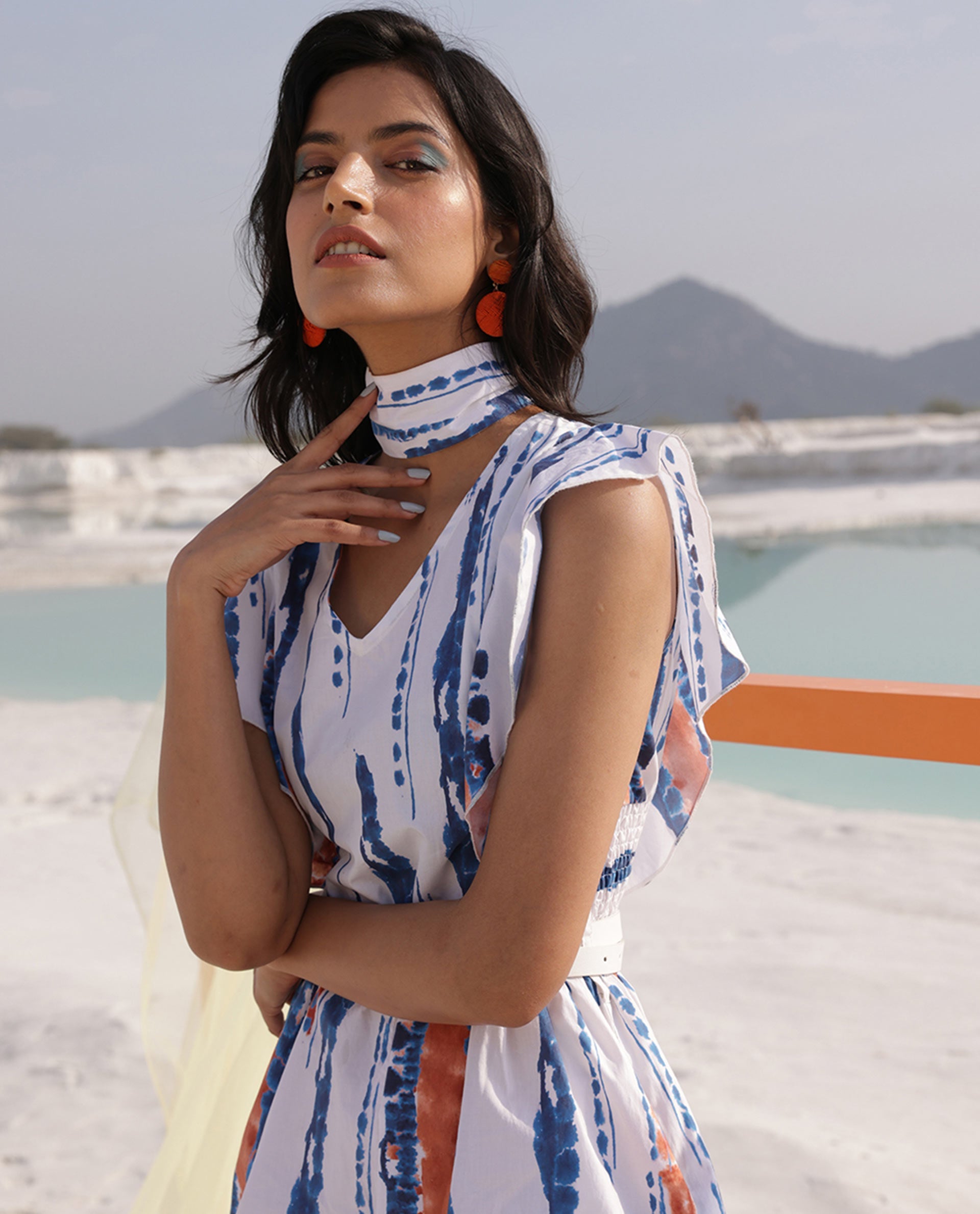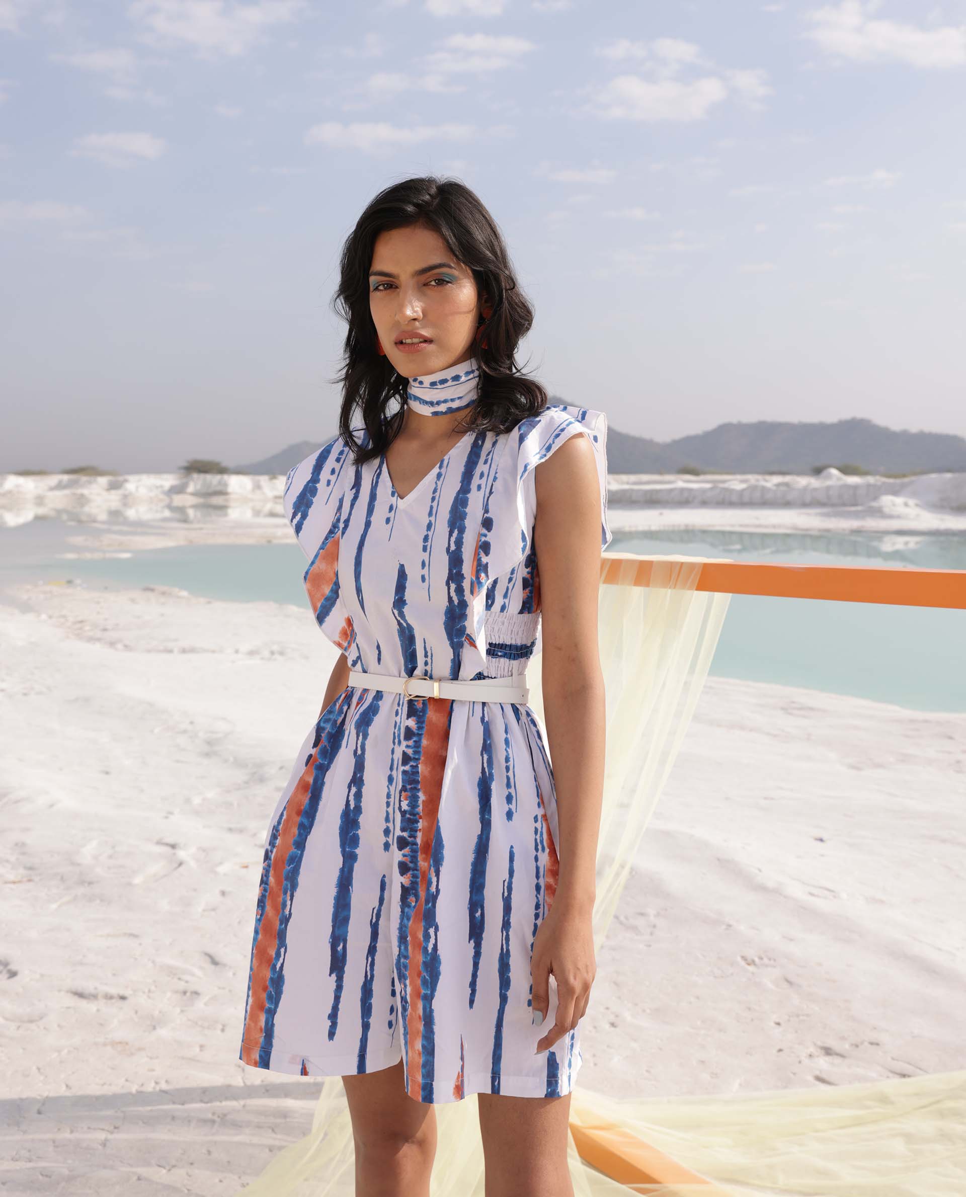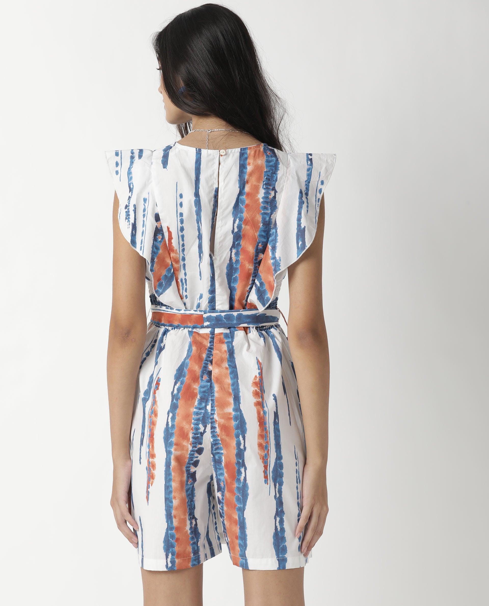 A contemporary style sleeveless playsuit in new tie and dye print.