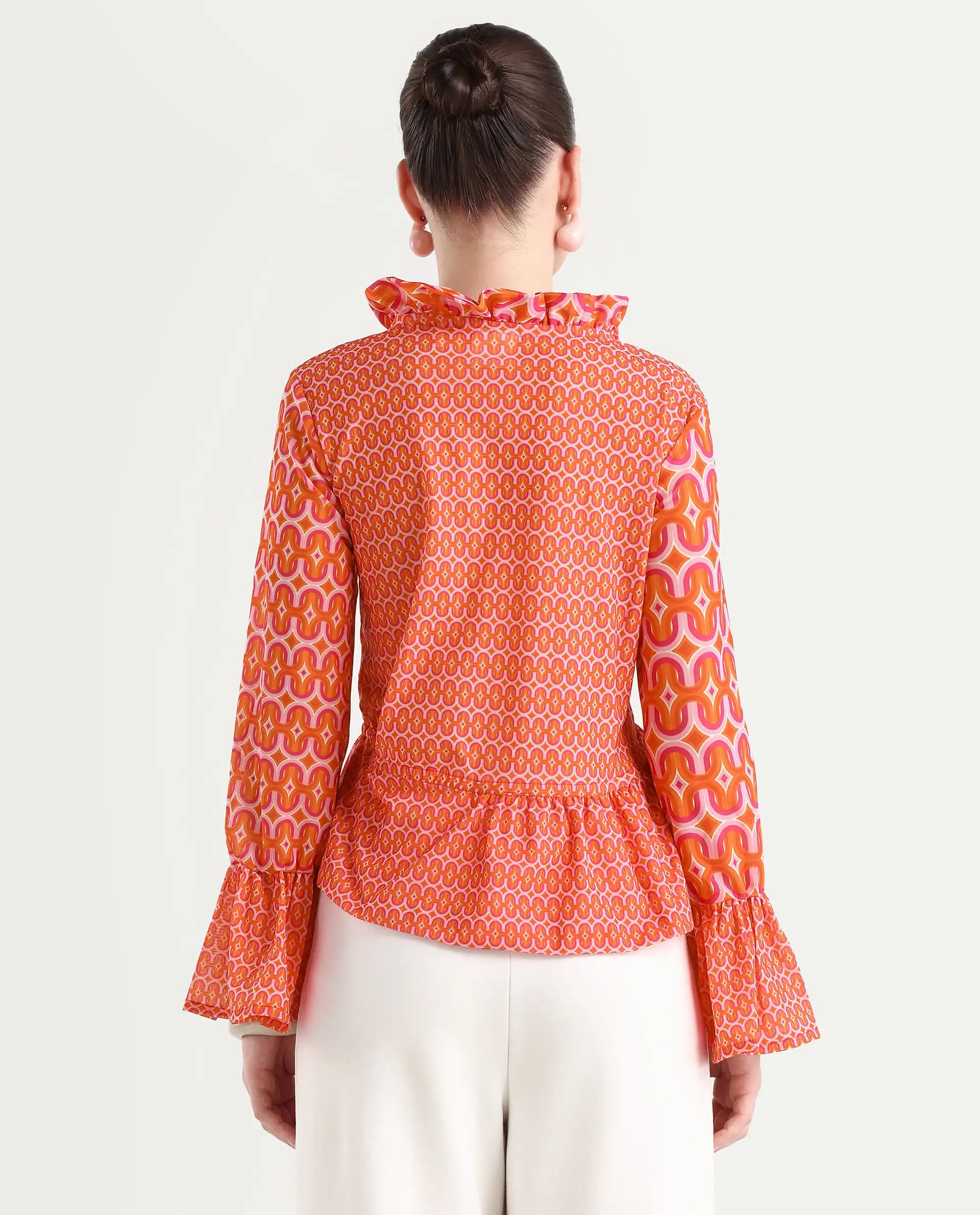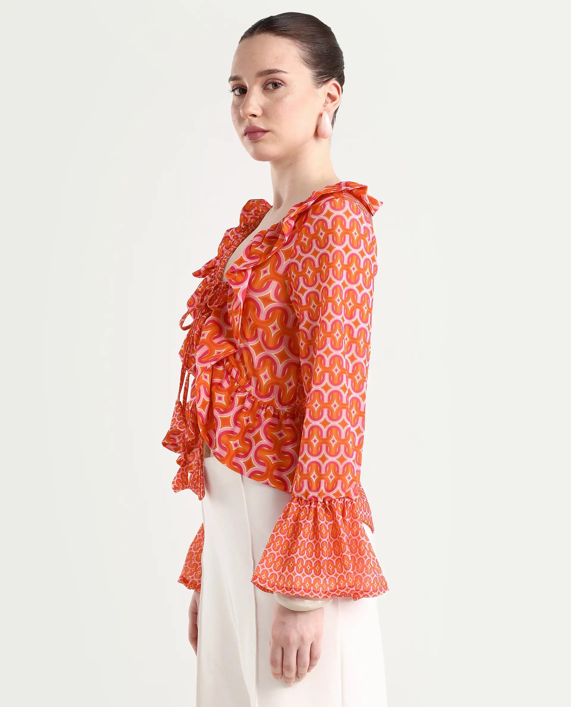 Add a touch of romance to your ensemble with our Ruffled V-Neck Crop Shrug. This delightful piece features a captivating printed design and a flattering V-neck adorned with extended ruffles, creating a whimsical and feminine look. The long sleeves with light bell-shaped hems add a subtle flair to the garment. Mix and match cut panels contribute to its unique and eye-catching style. Complete with a double tie-up closure at the front, embellished with matching tassels, allowing for adjustable fit and adding a charming detail. Crafted from a blend of viscose and mesh, this shrug ensures comfort and breathability, making it perfect for layering over your favourite tops or dresses for a stylish and romantic ensemble.