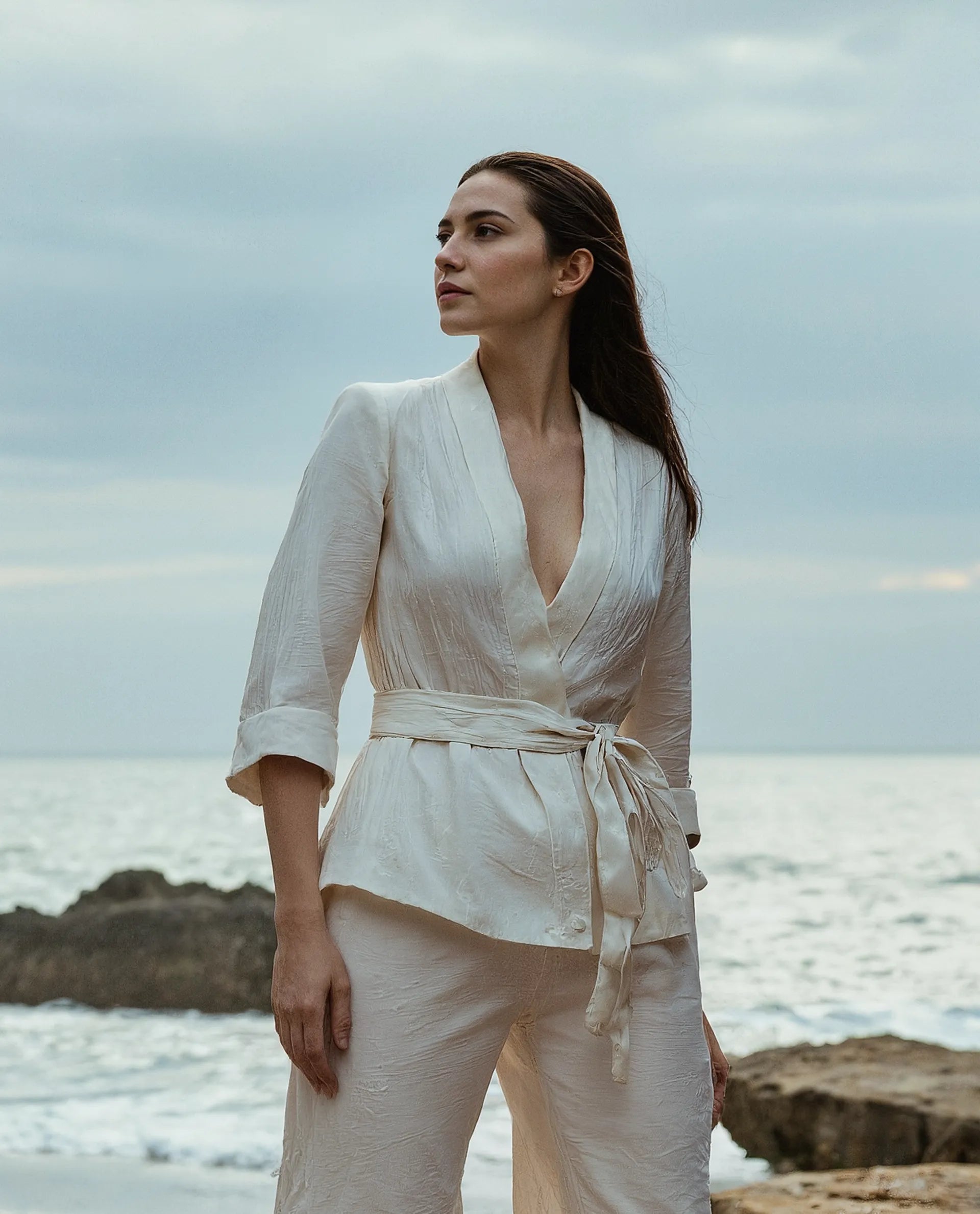 The model (Bust-31, Waist-24, Hip-34, Height-5'8") is wearing size XS.