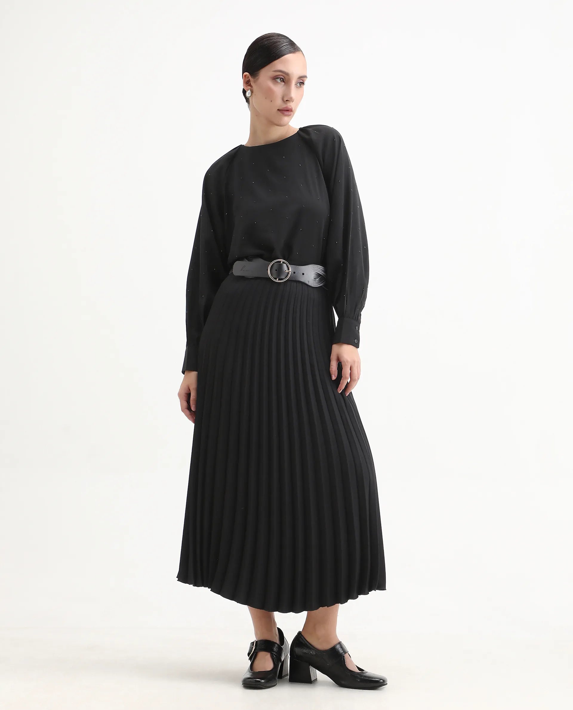 1. Crafted from luxurious satin fabric, this top exudes elegance with its plain black design accented by subtle rhinestone details.