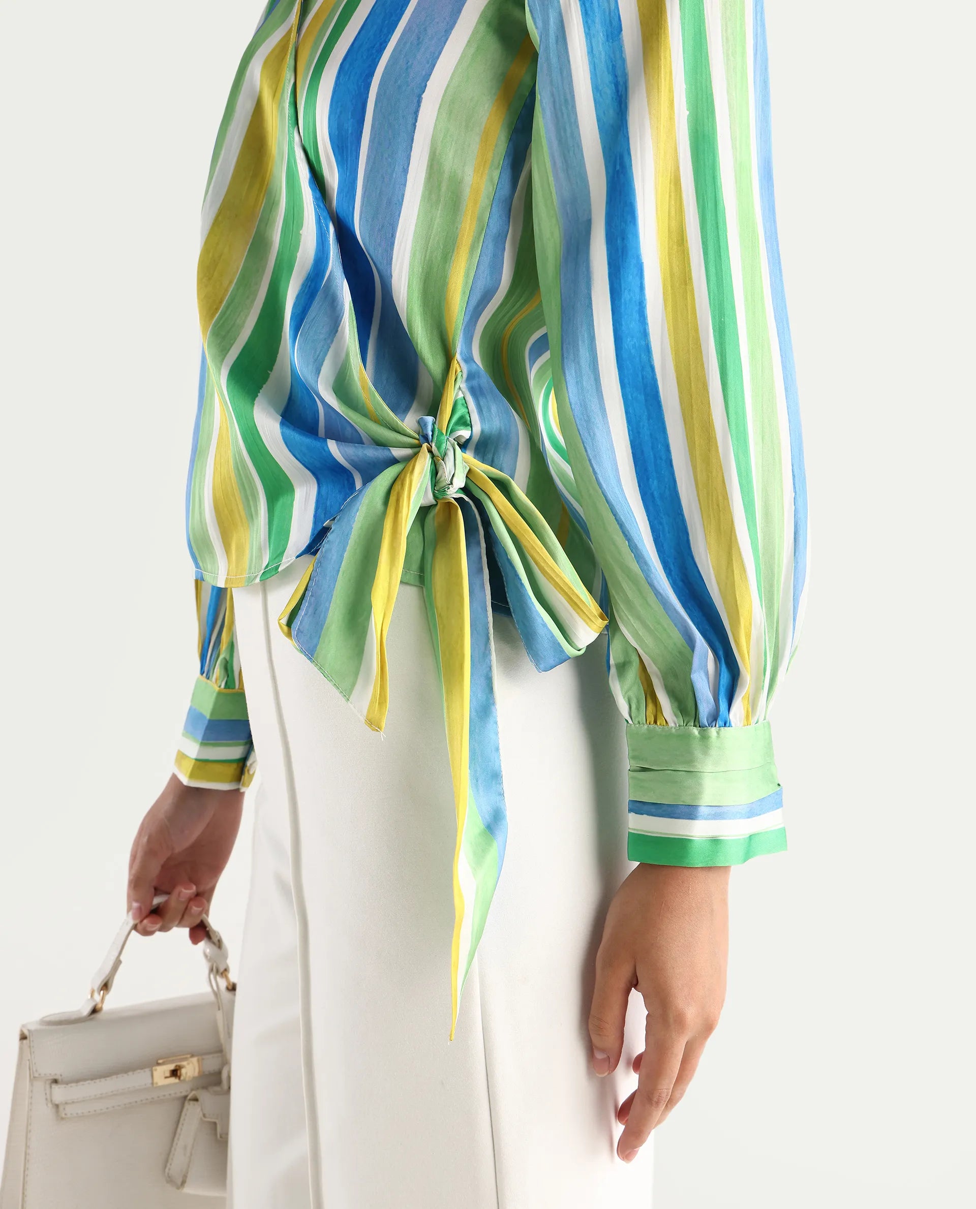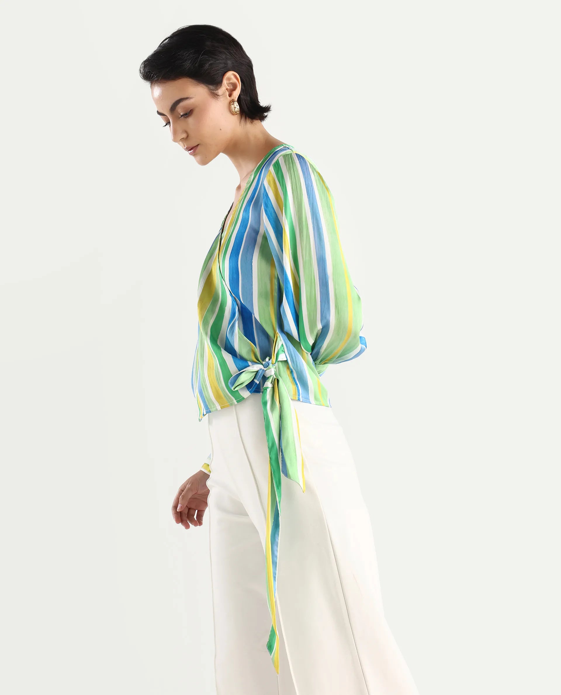 Rareism Women's Dessa Multi Overlap Neck Striped Cuffed Sleeve Regular Fit Top