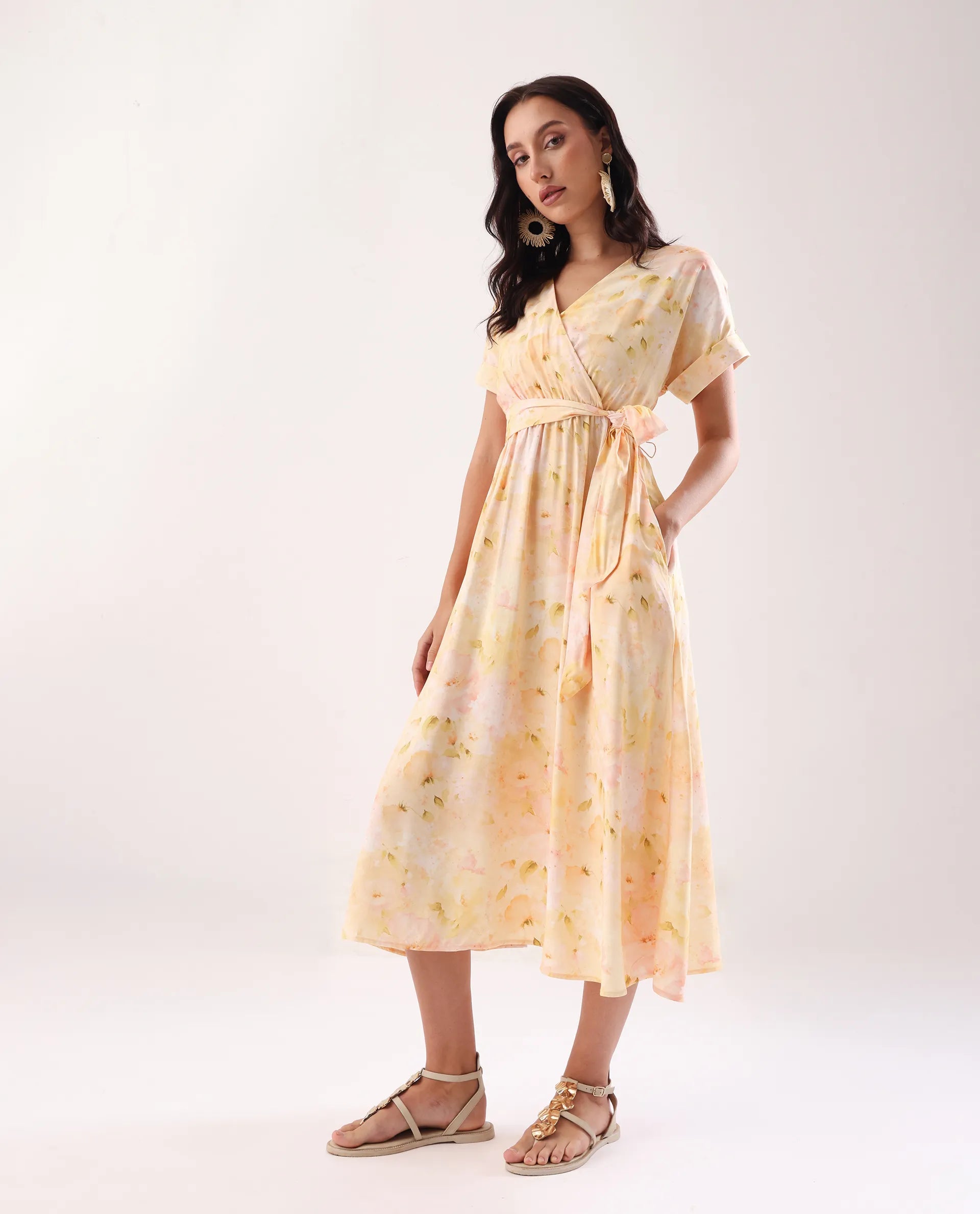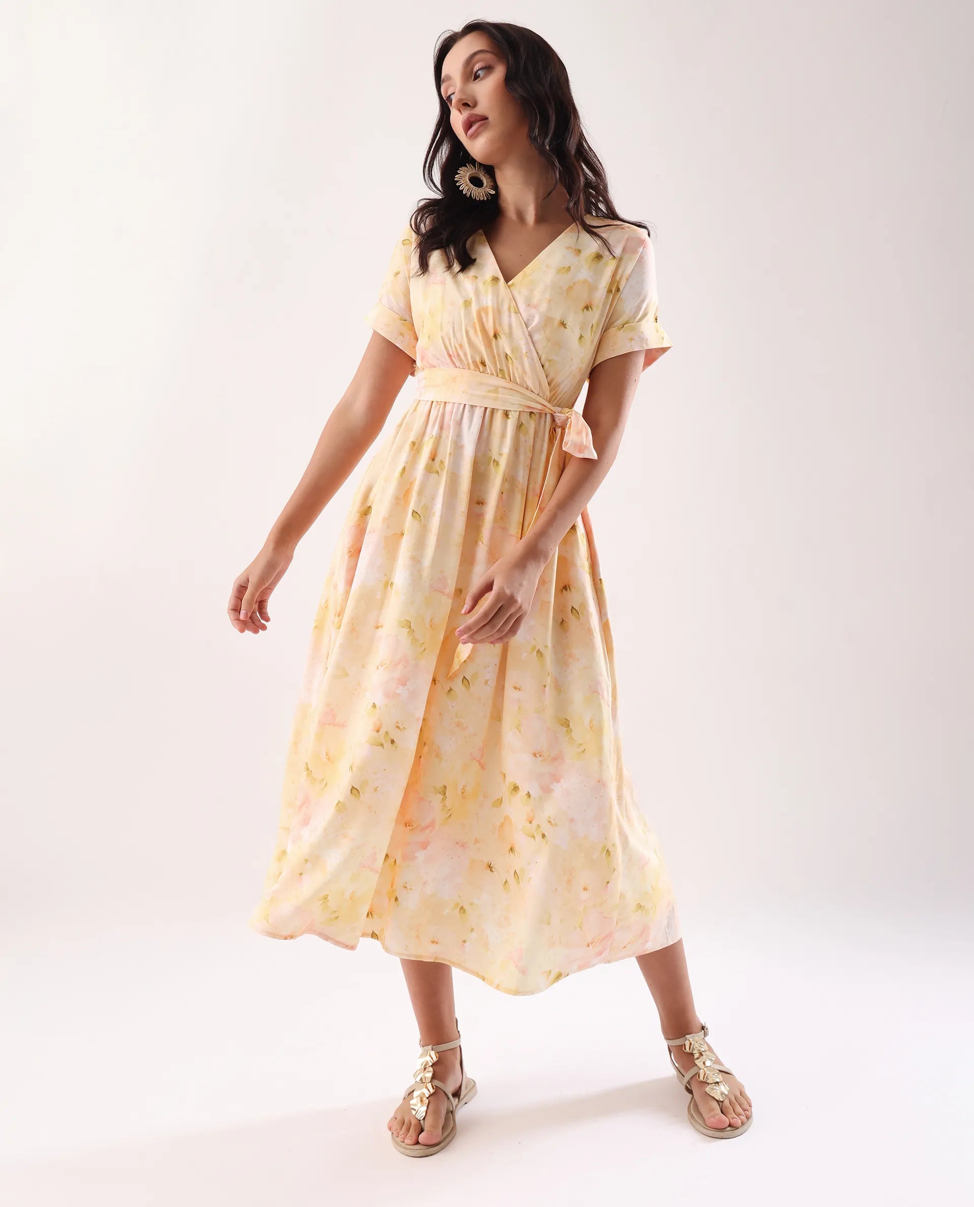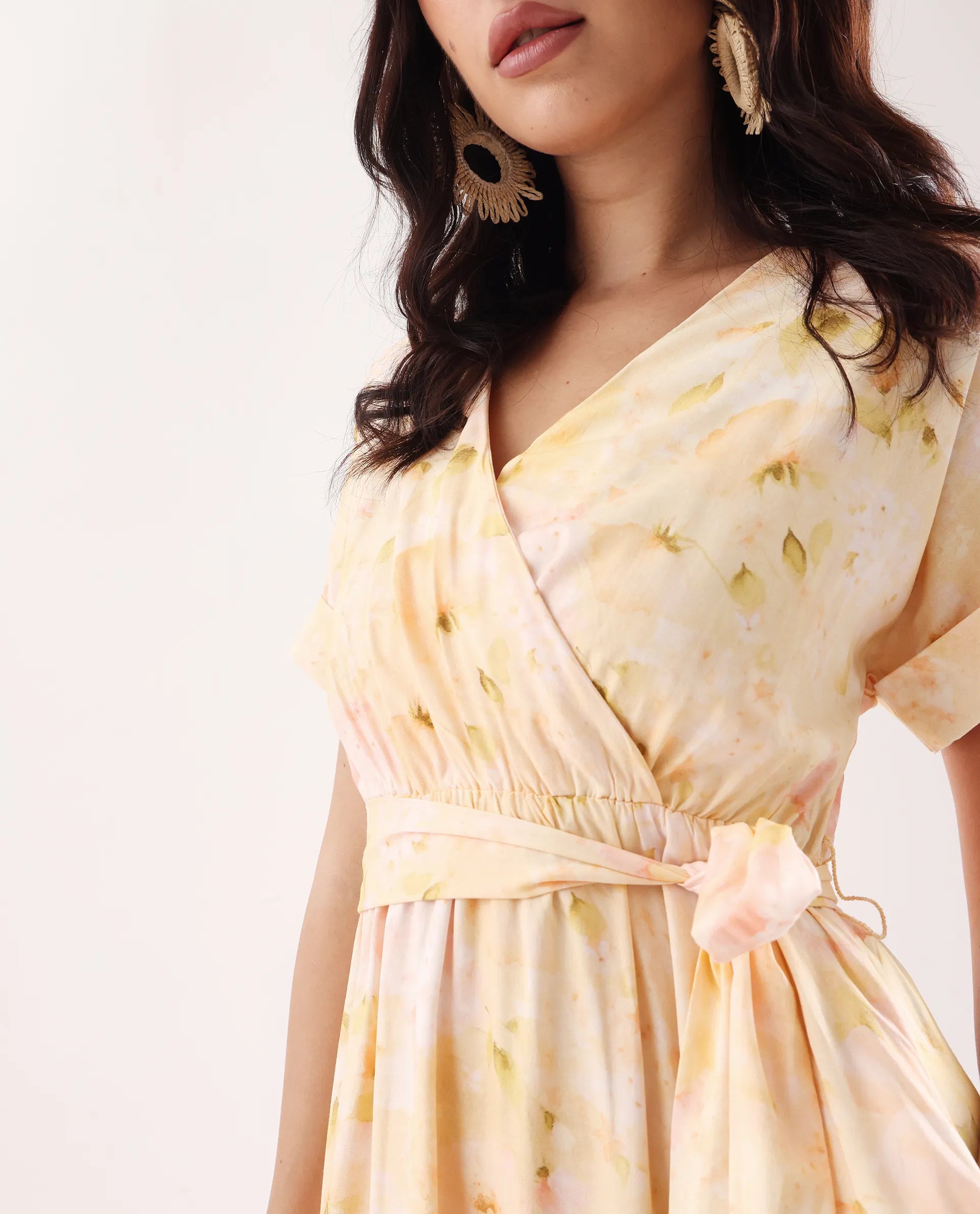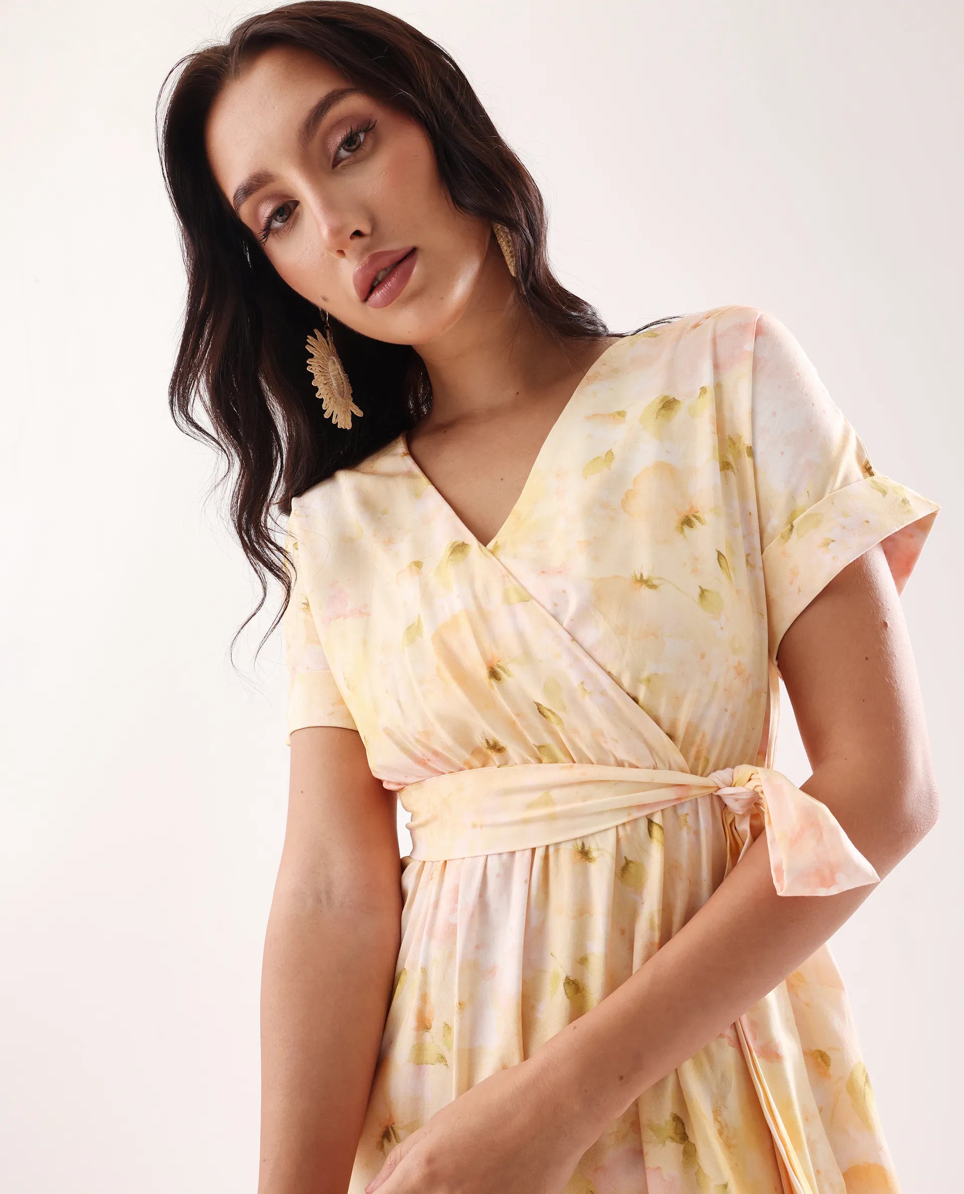 Elevate your wardrobe with this sophisticated yellow midi dress featuring an elegant overlap neck and convenient elastic closure. The flattering flared silhouette creates graceful movement while the distinctive print adds visual interest. Meticulously crafted for both comfort and style, this versatile piece transitions effortlessly from day to evening occasions.
