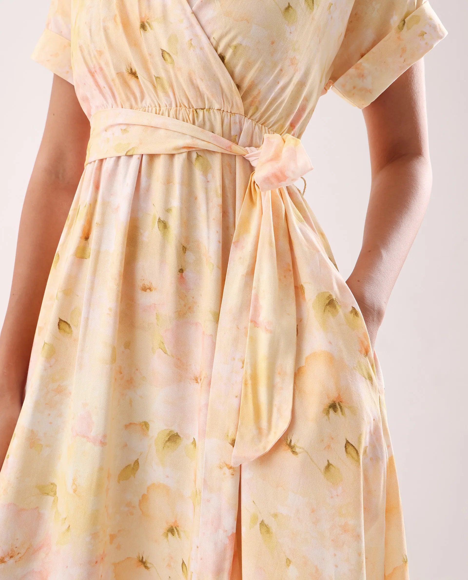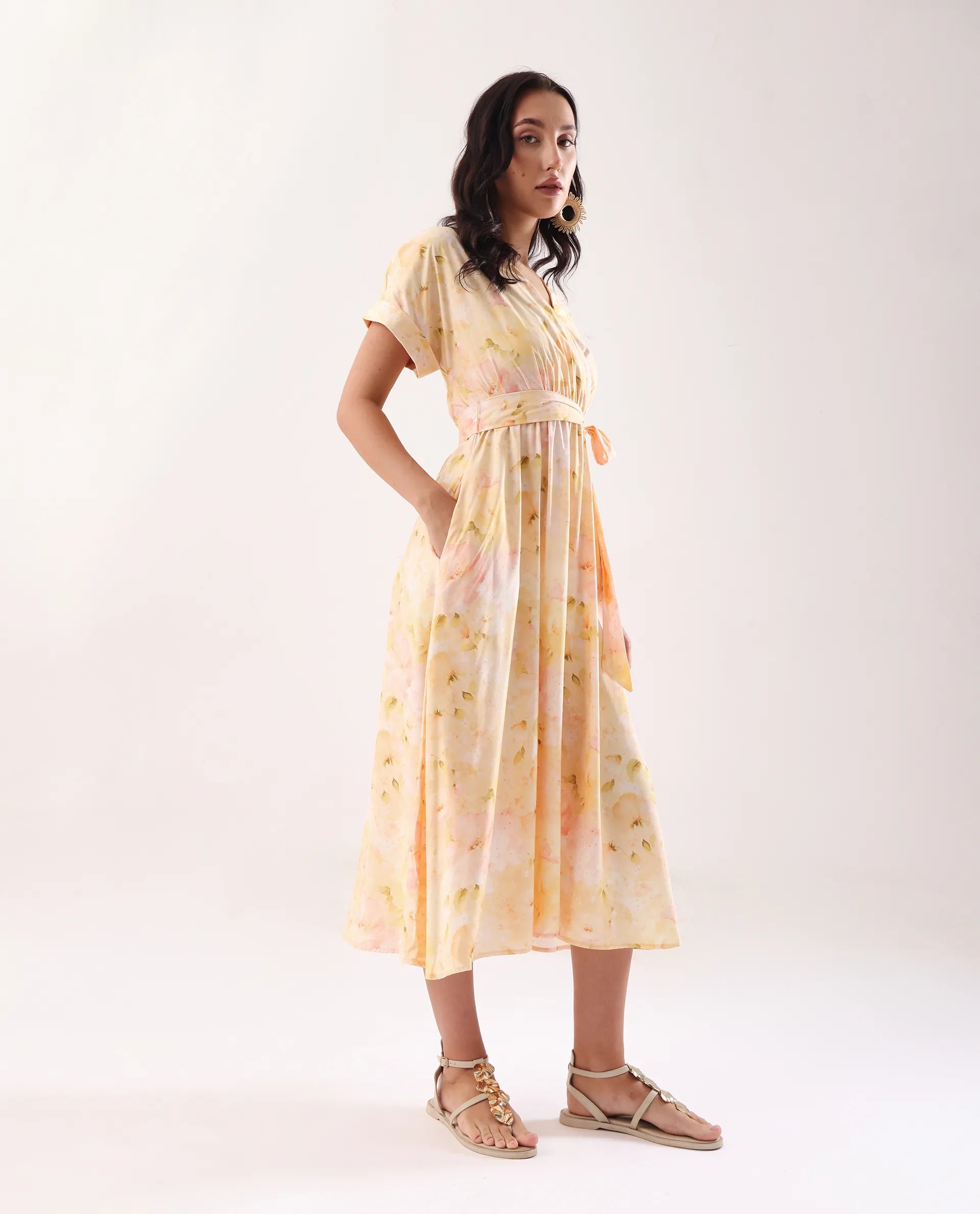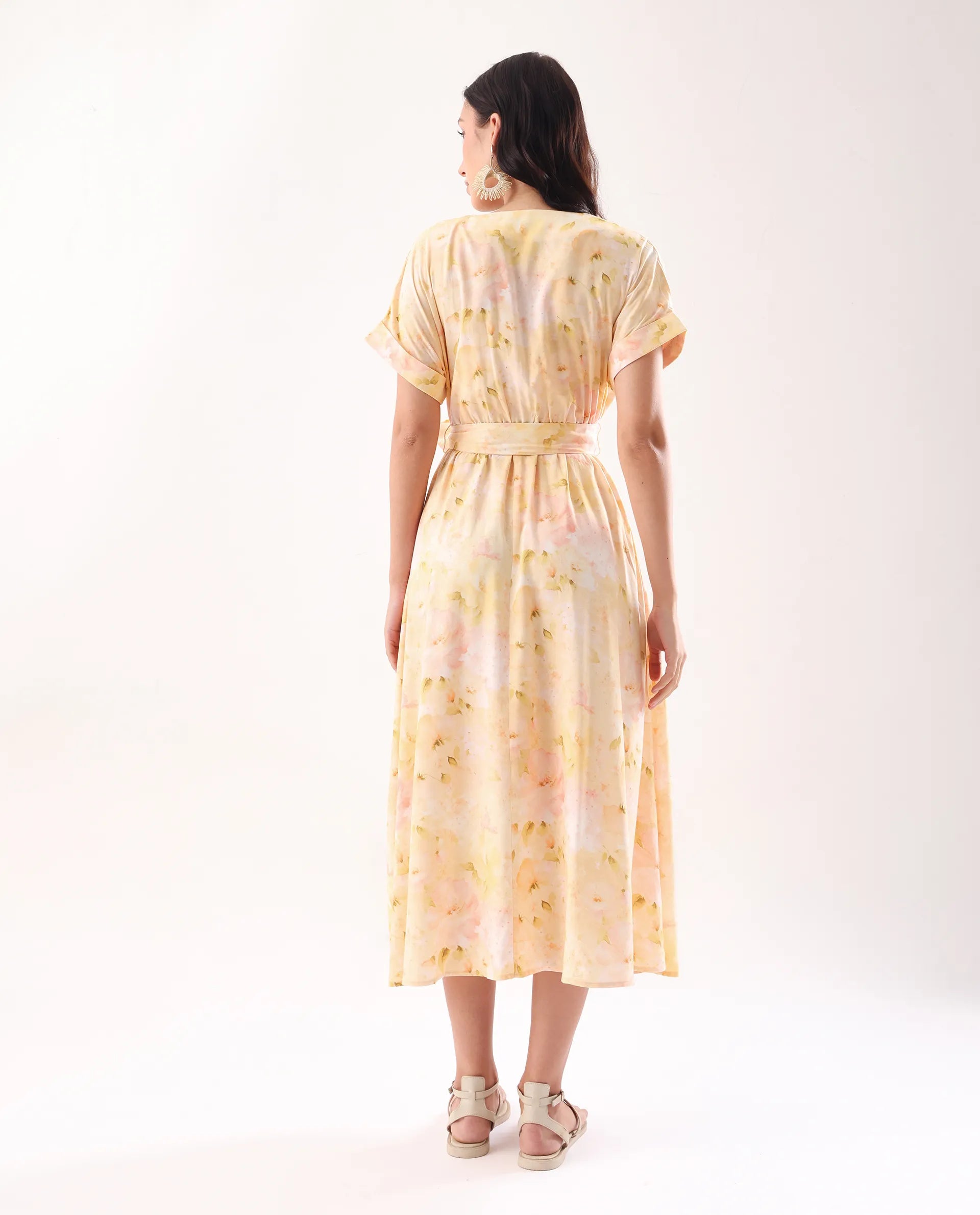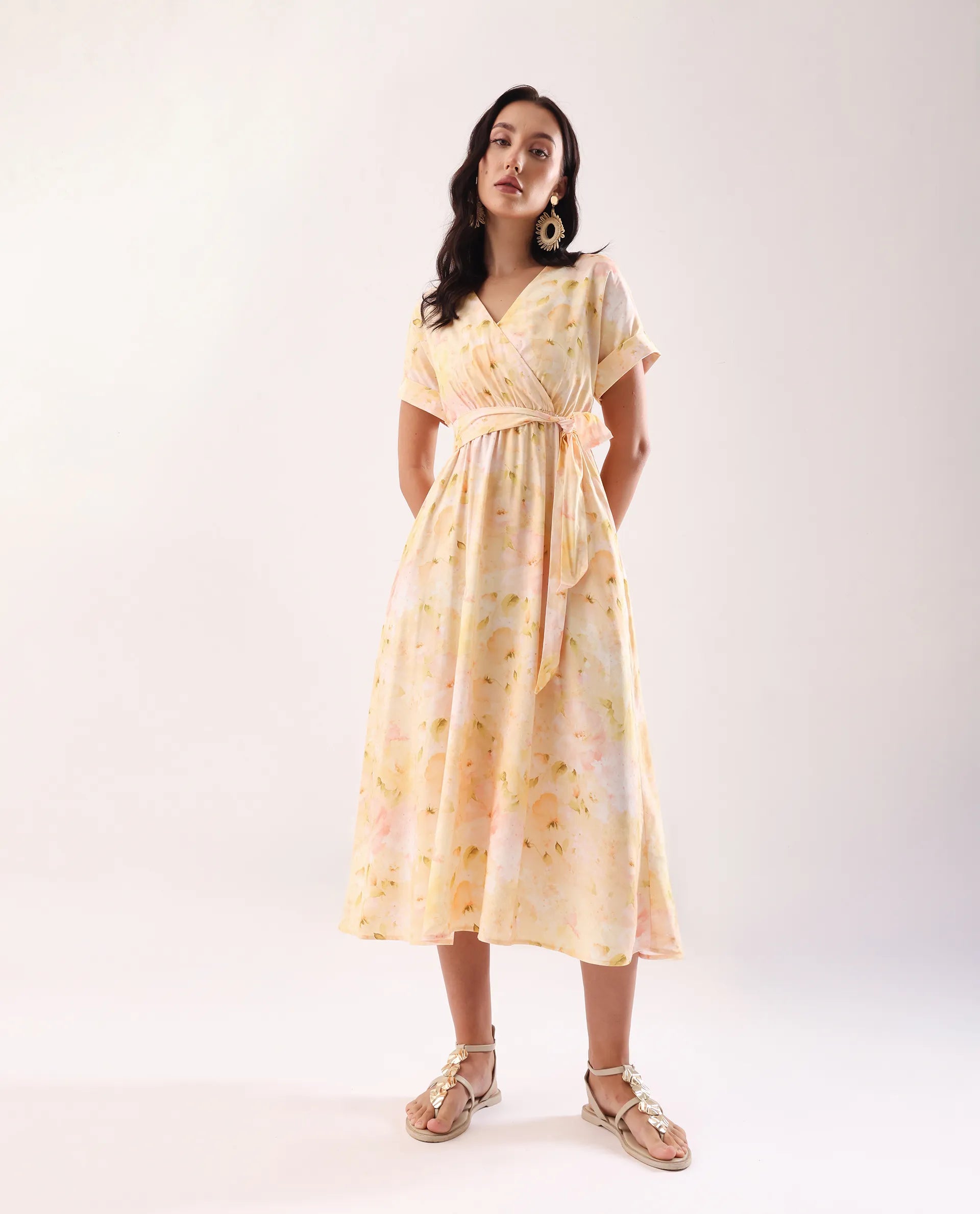 Elevate your wardrobe with this sophisticated yellow midi dress featuring an elegant overlap neck and convenient elastic closure. The flattering flared silhouette creates graceful movement while the distinctive print adds visual interest. Meticulously crafted for both comfort and style, this versatile piece transitions effortlessly from day to evening occasions.