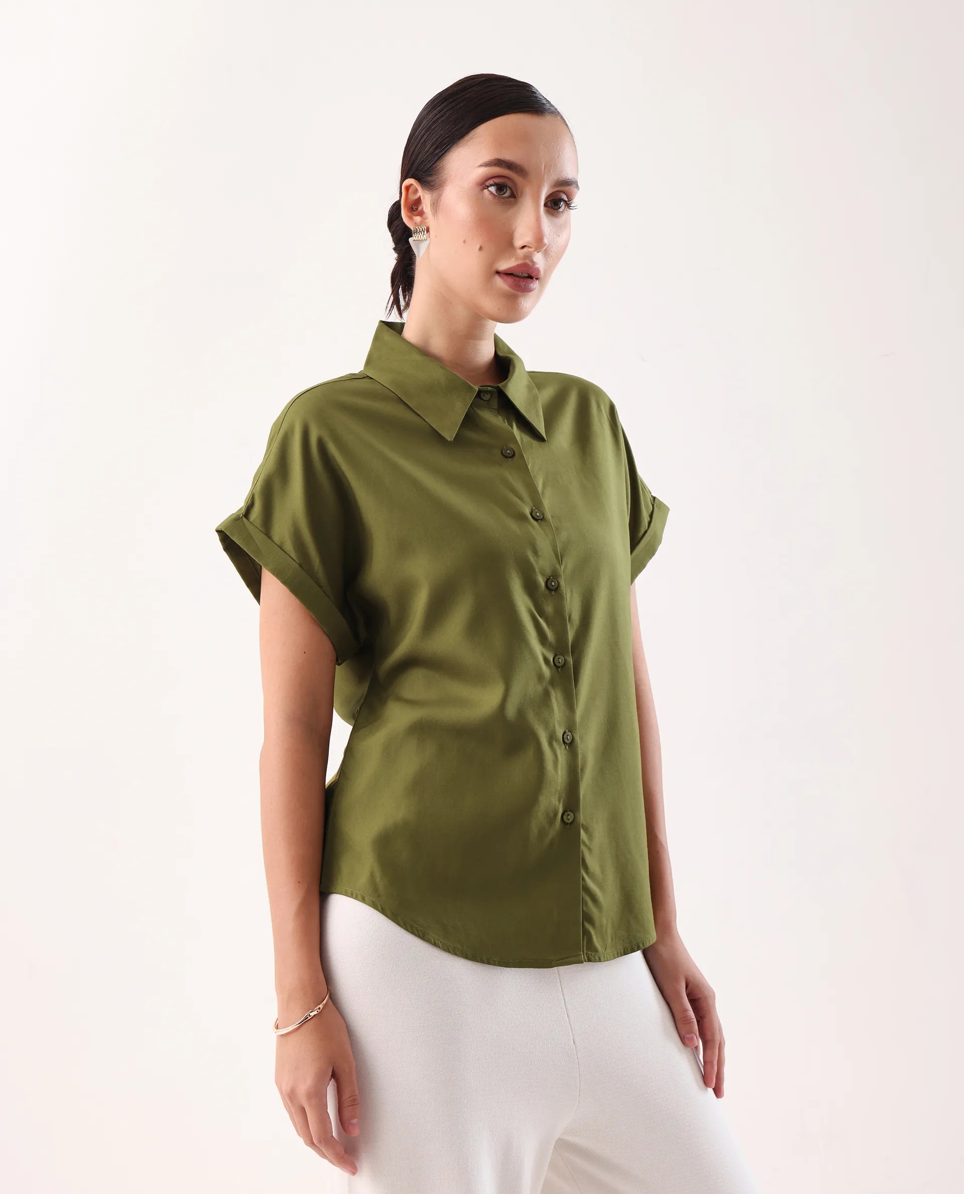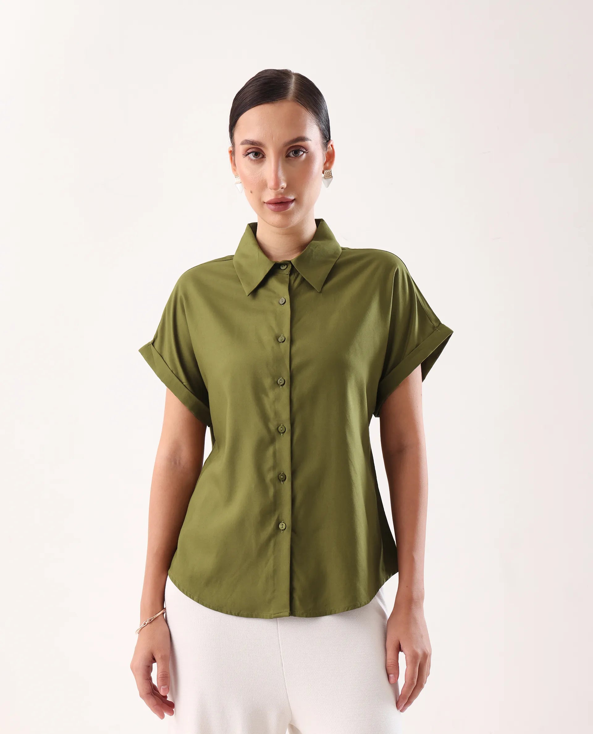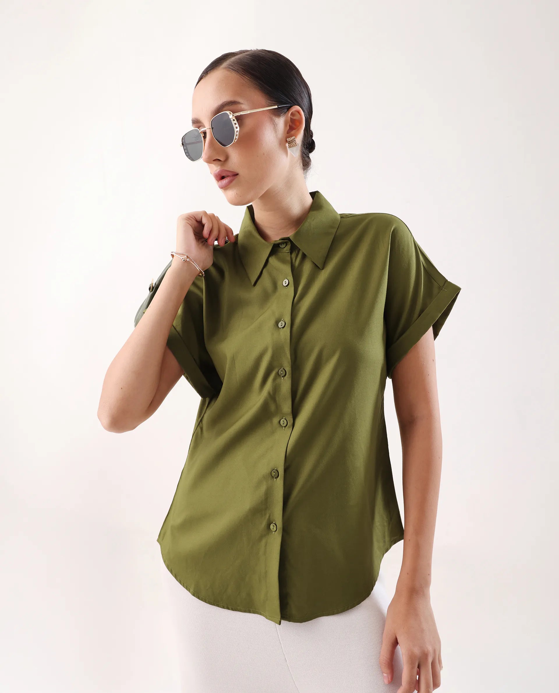 Elevate your wardrobe with our Rareism Women Elcee Olive Collared Neck Shirt. Featuring a classic collared design and convenient button closure, this plain olive shirt offers versatile styling options for both professional settings and casual outings. The refined silhouette ensures a flattering fit while maintaining sophisticated comfort throughout the day.