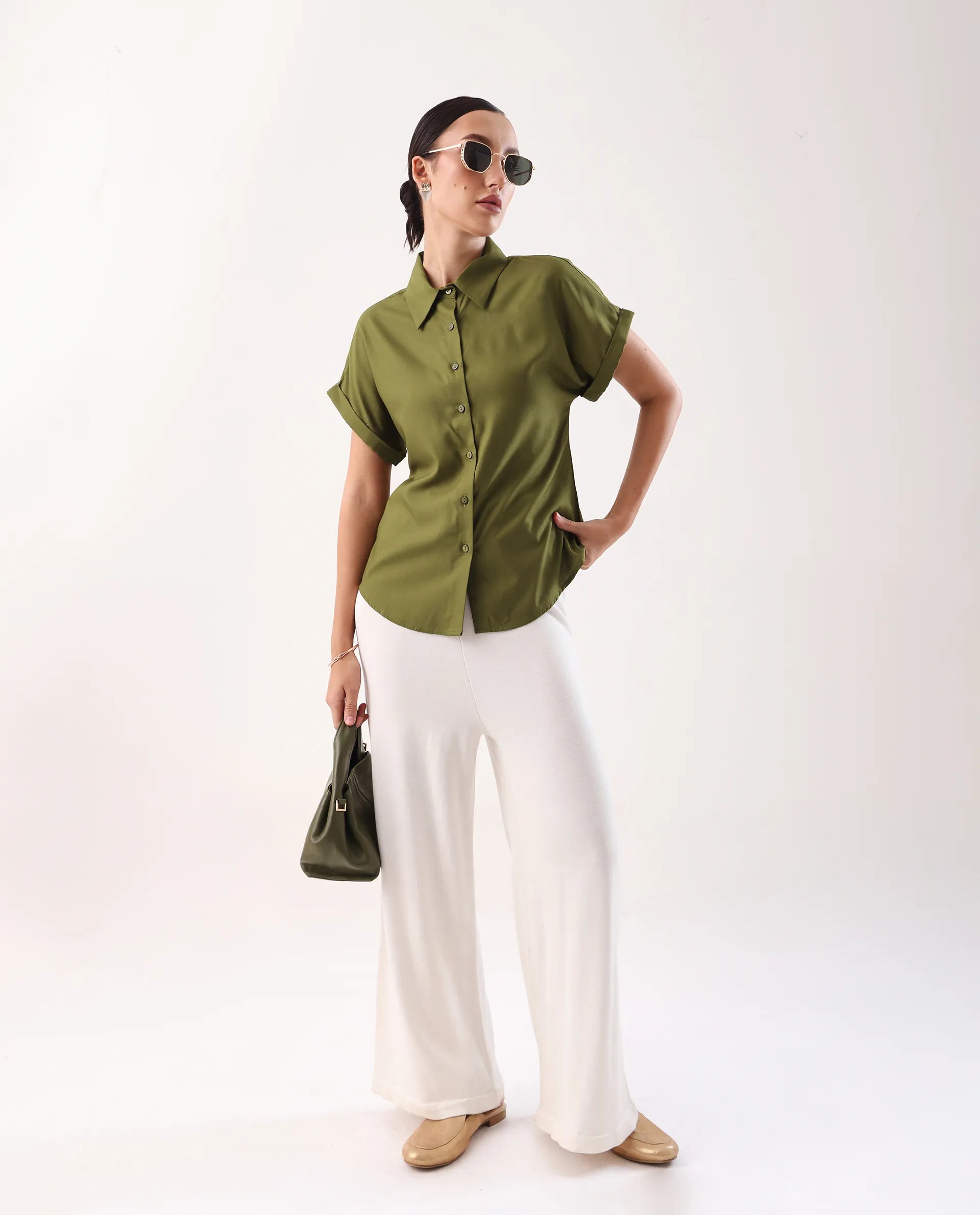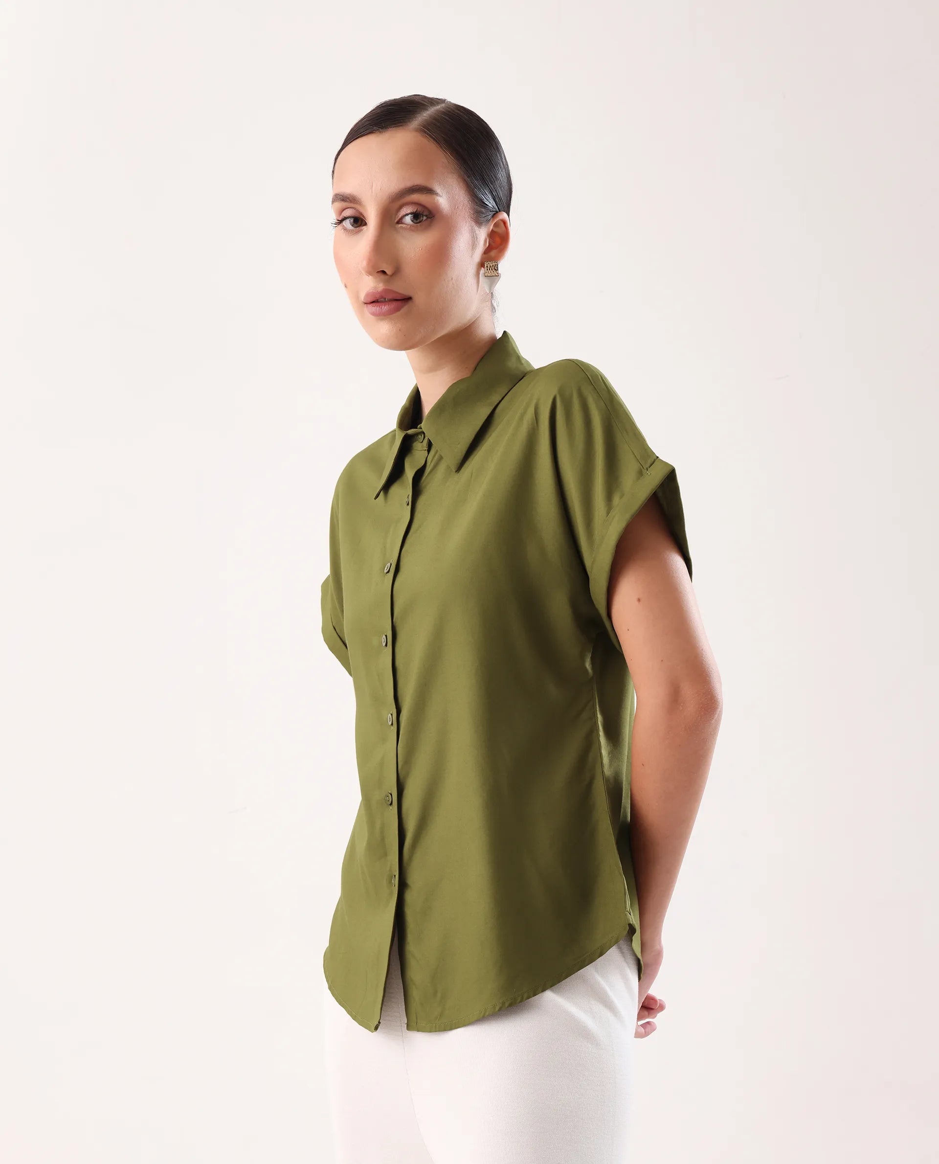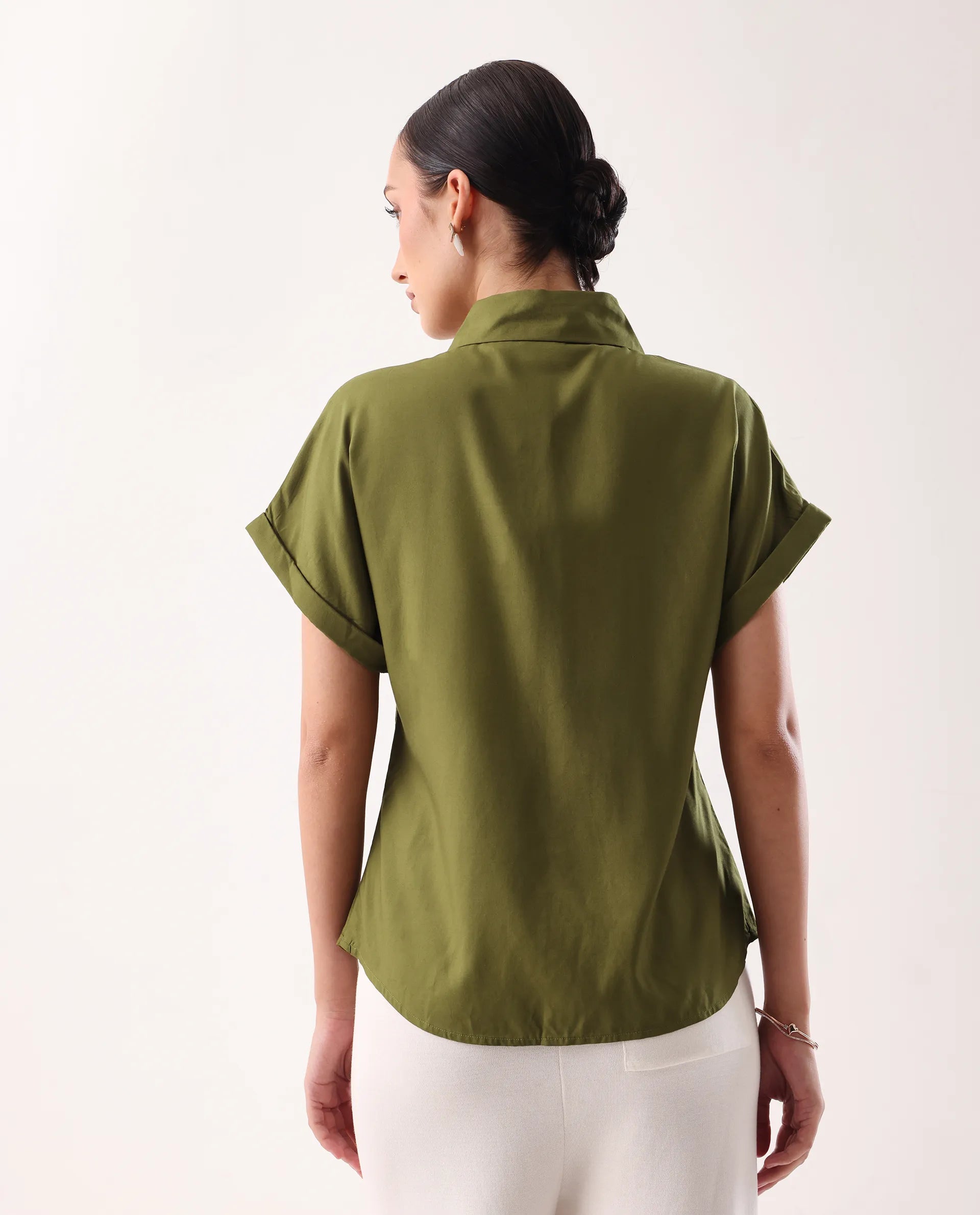 Elevate your wardrobe with our Rareism Women Elcee Olive Collared Neck Shirt. Featuring a classic collared design and convenient button closure, this plain olive shirt offers versatile styling options for both professional settings and casual outings. The refined silhouette ensures a flattering fit while maintaining sophisticated comfort throughout the day.
