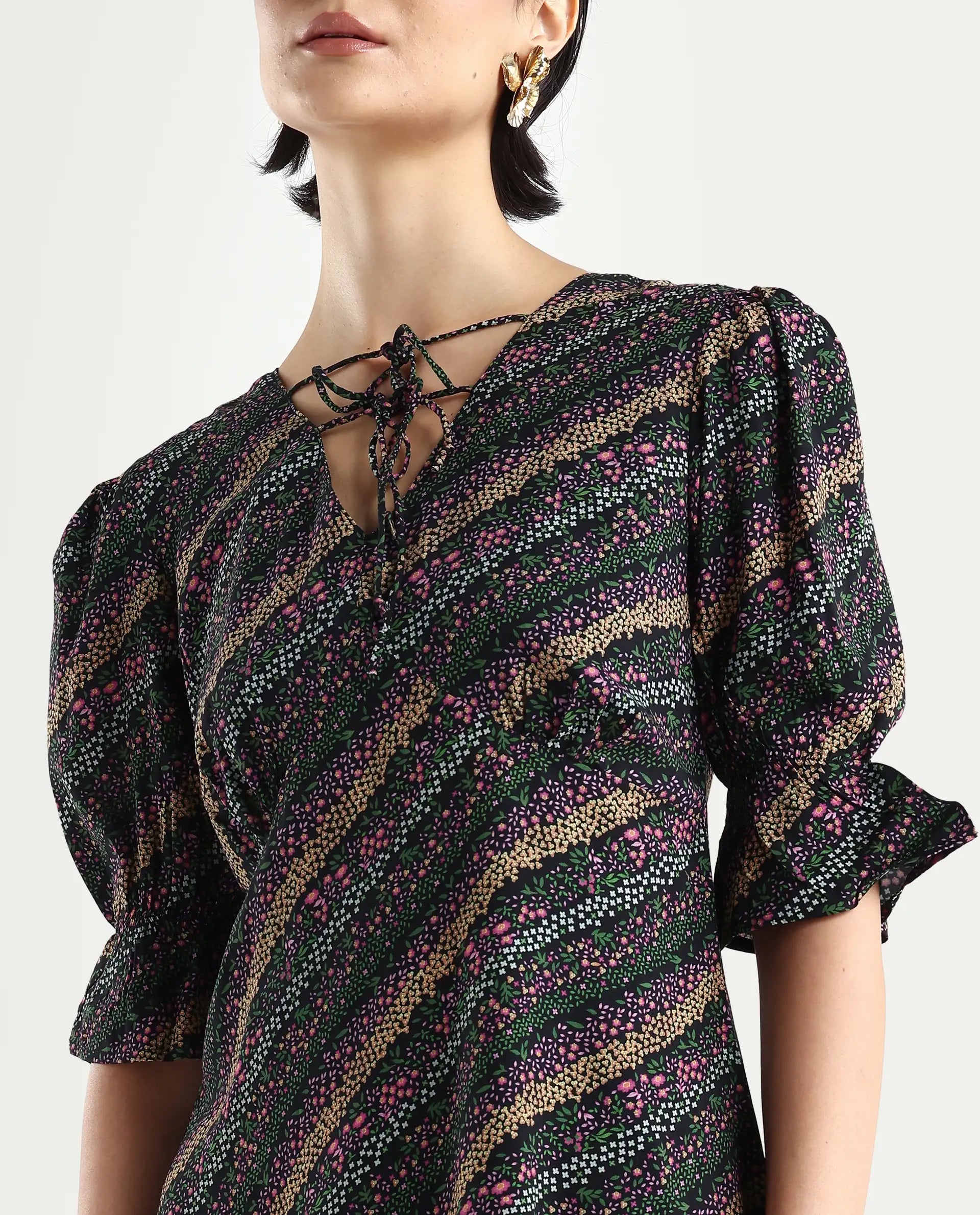 - V neck with double tie up, half sleeve with elastic, and a line fit with light circular ruffle at the bottom.