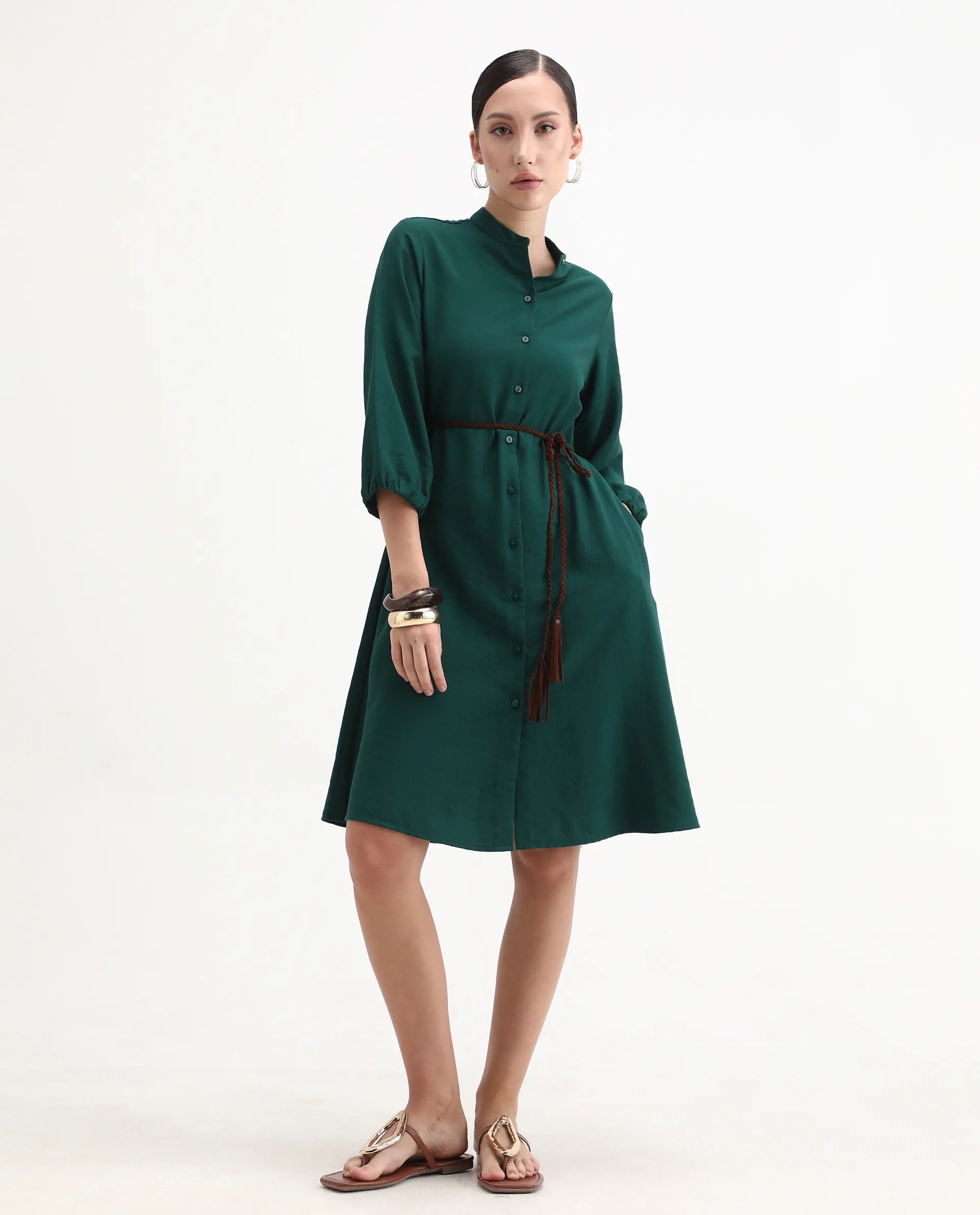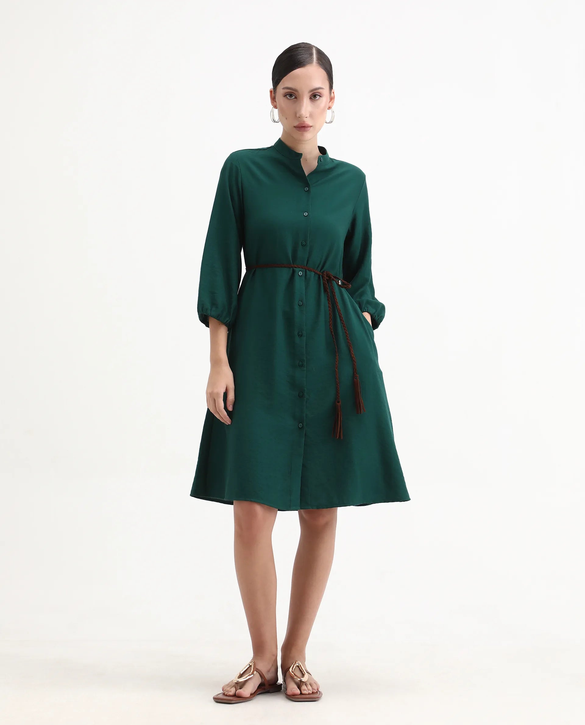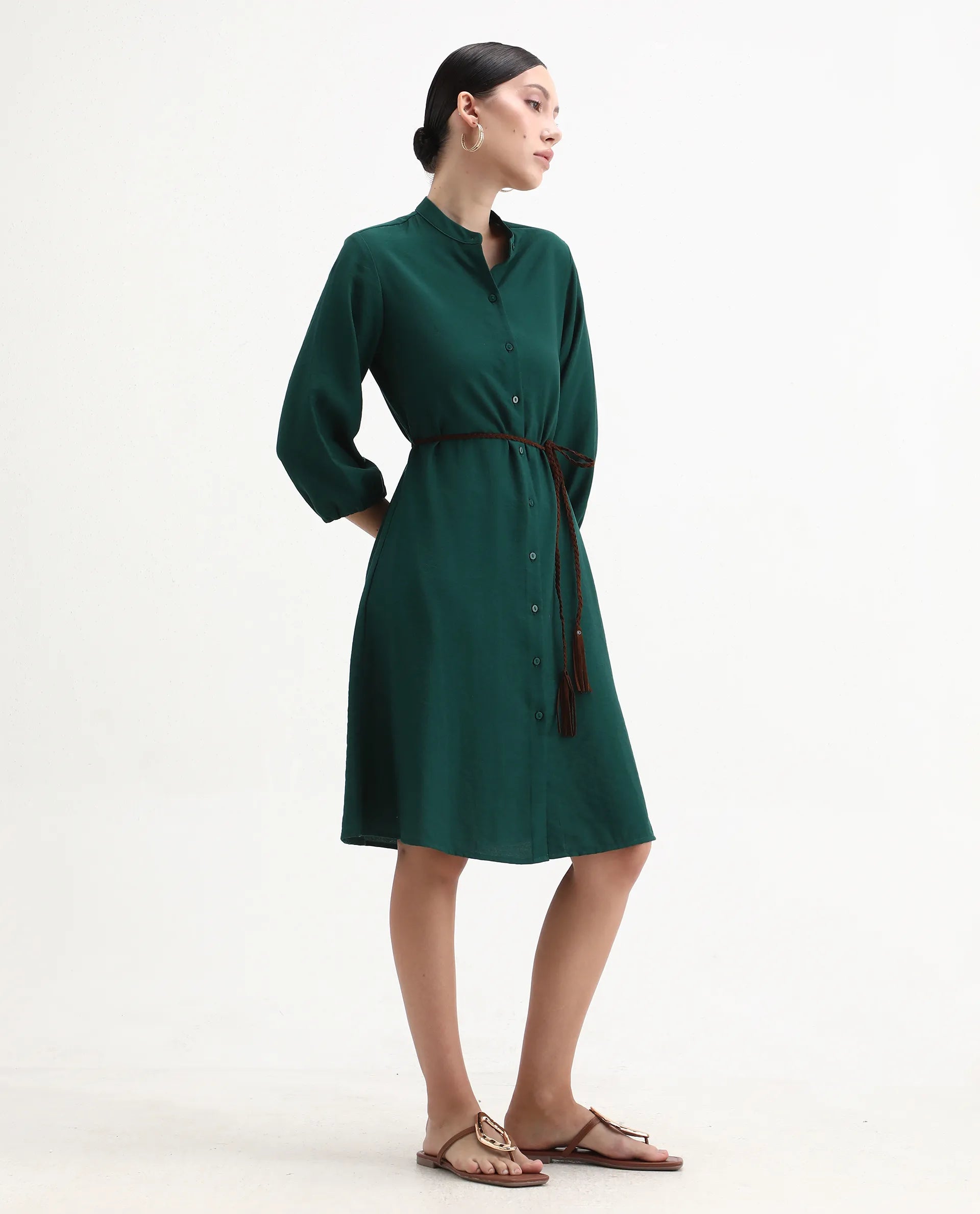 This Rareism Eliah dress features a sophisticated mandarin collar and bishop sleeves, combining classic elegance with modern style. The button closure enhances its tailored fit, while the A-line silhouette and knee-length cut offer comfort and flattering movement. Crafted in a plain green fabric, this dress is versatile for both professional and casual occasions, making it a refined addition to your wardrobe.