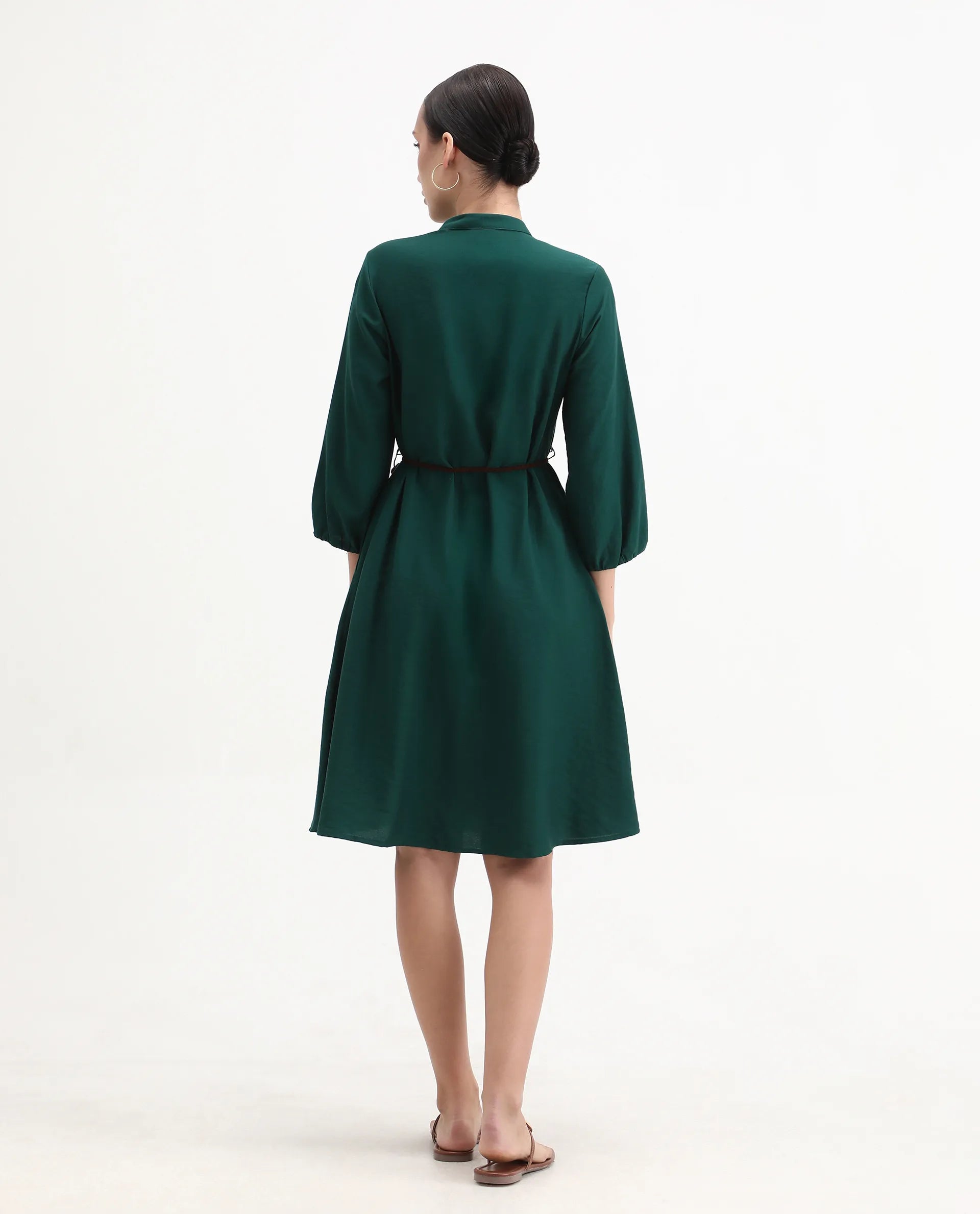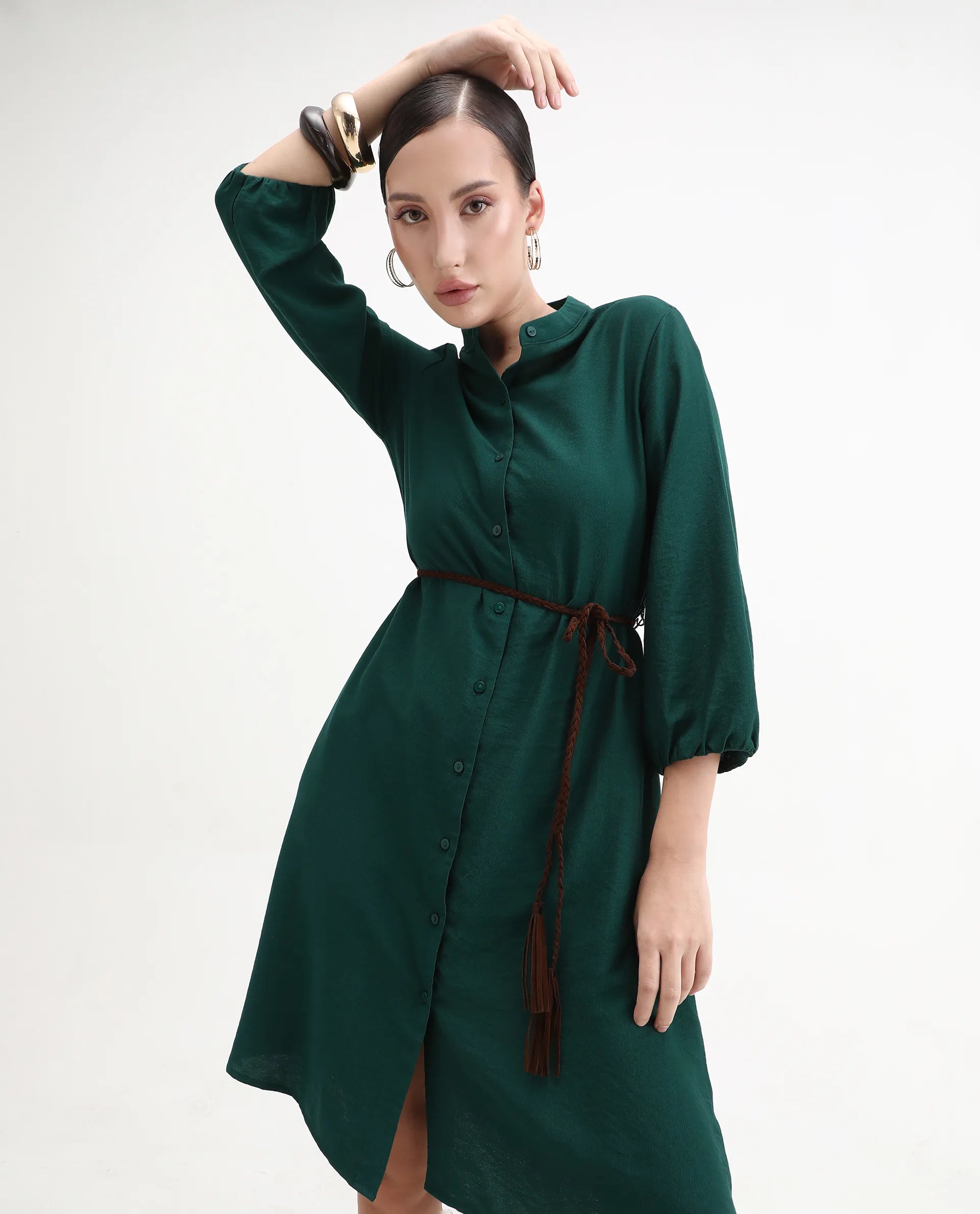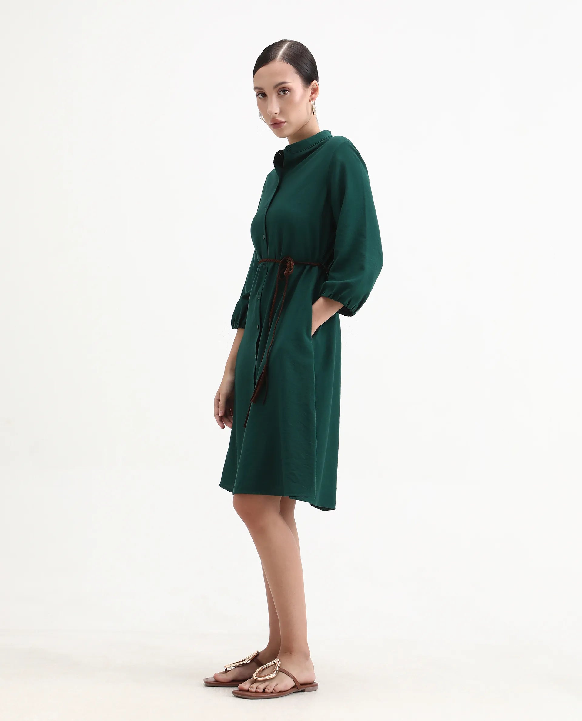 This Rareism Eliah dress features a sophisticated mandarin collar and bishop sleeves, combining classic elegance with modern style. The button closure enhances its tailored fit, while the A-line silhouette and knee-length cut offer comfort and flattering movement. Crafted in a plain green fabric, this dress is versatile for both professional and casual occasions, making it a refined addition to your wardrobe.