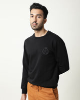 A solid colored sweatshirt with embroidered chest branding in long sleeves.