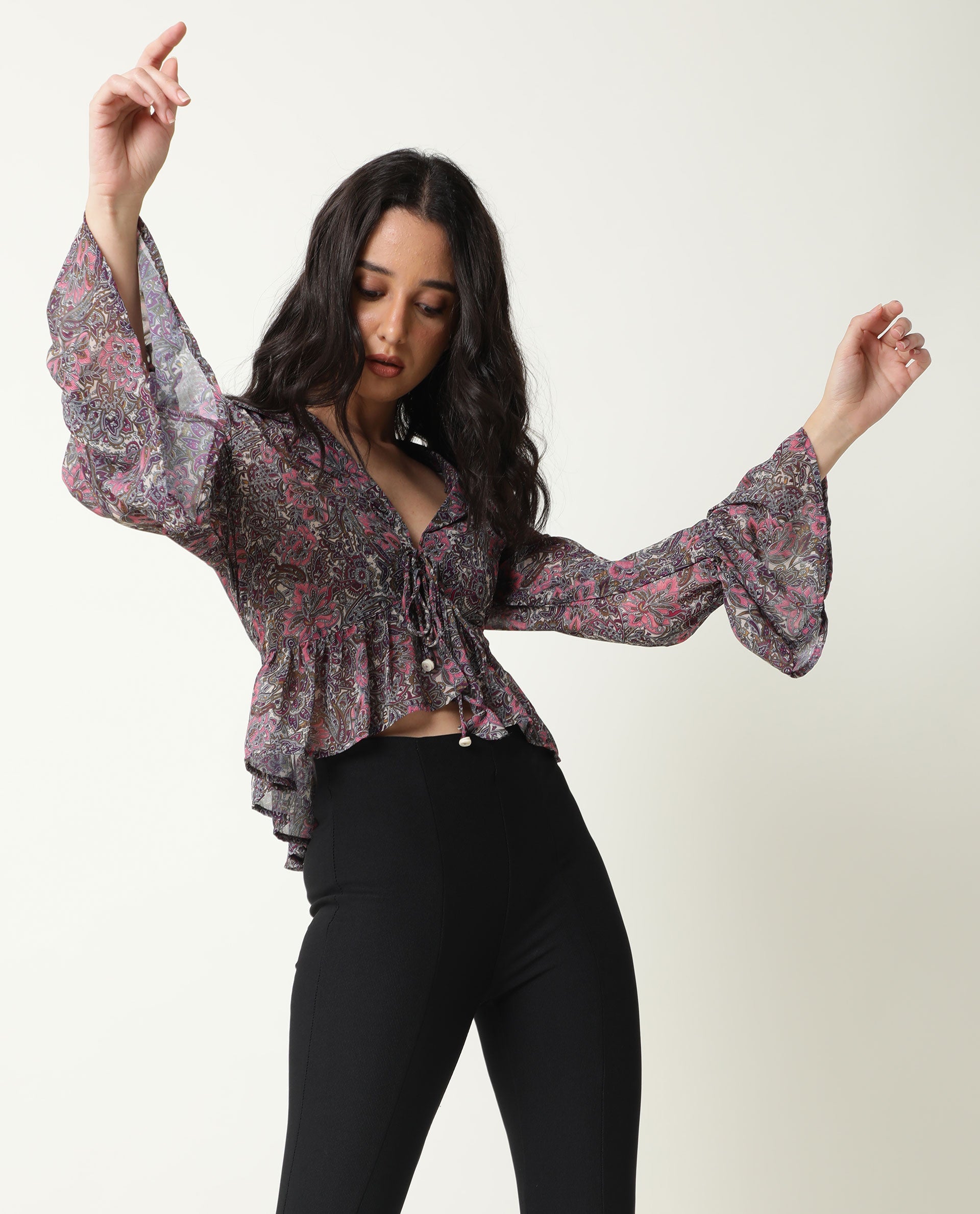 A chic style overlay in an all-over floral print with full sleeves and ruffles.