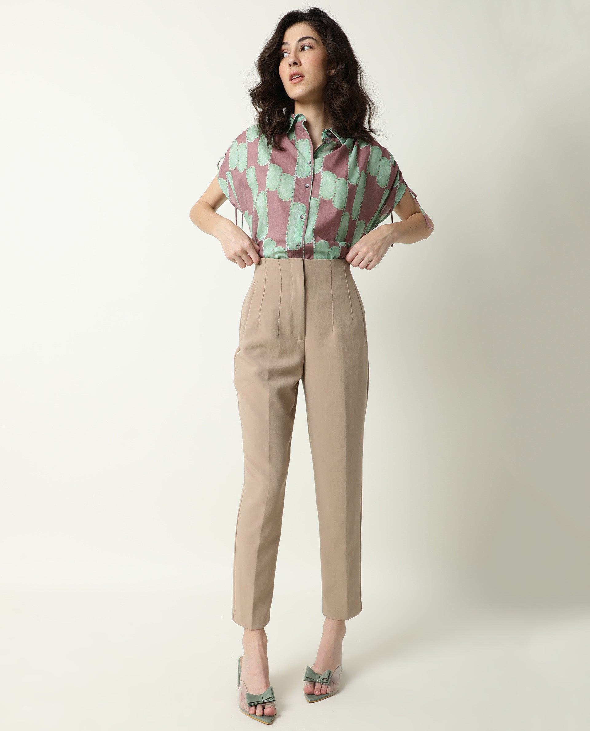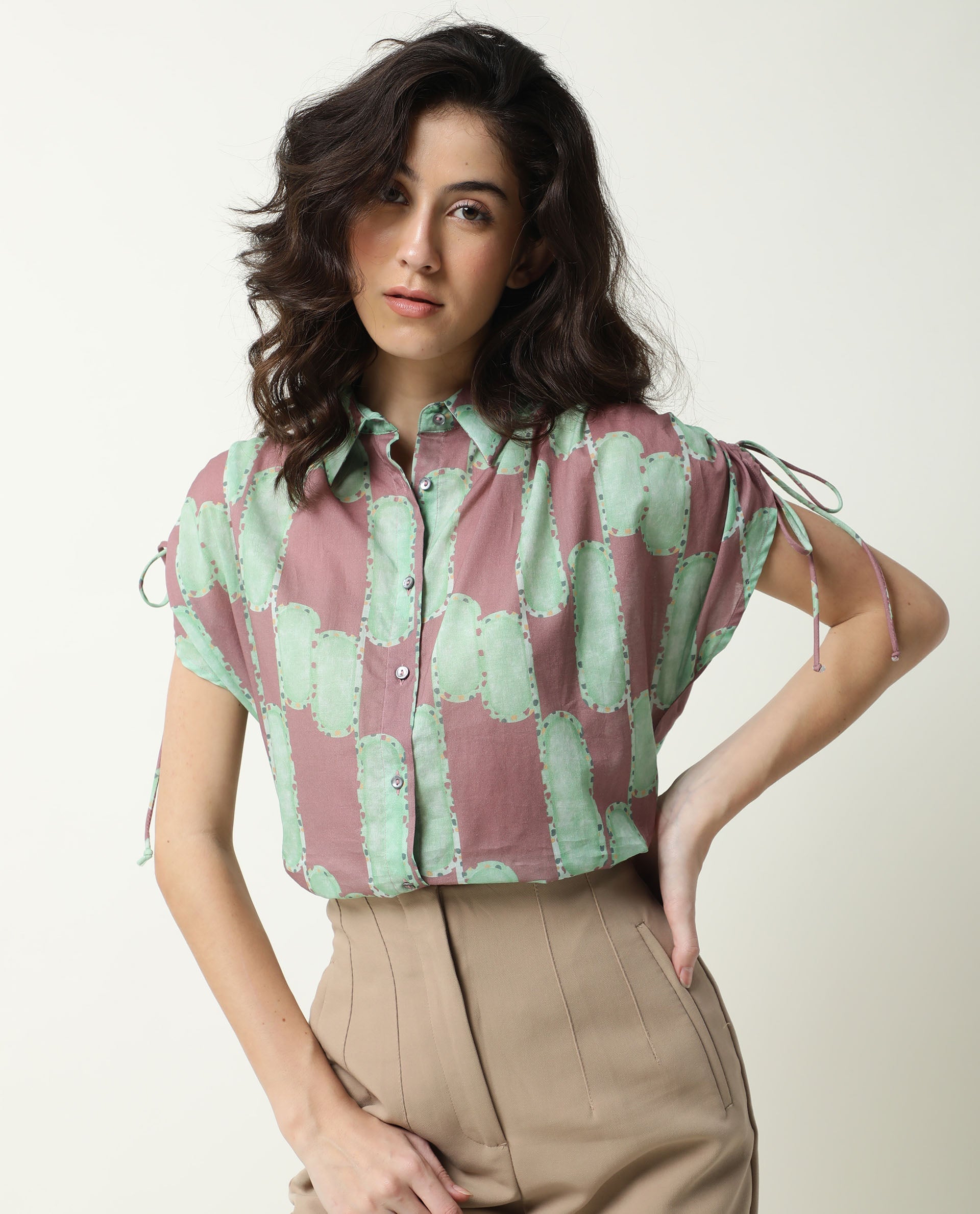 An urban style short sleeve shirt top with pull up shoulder in a geometric print.