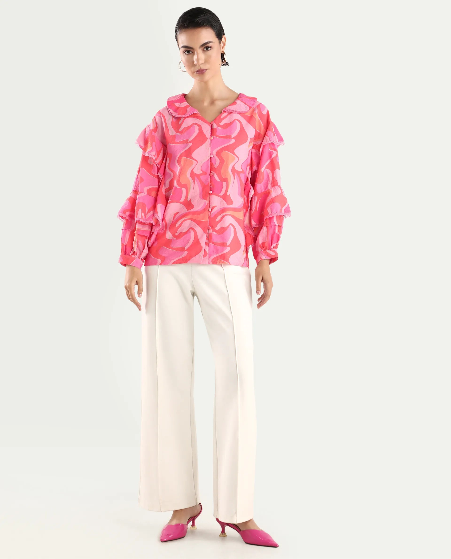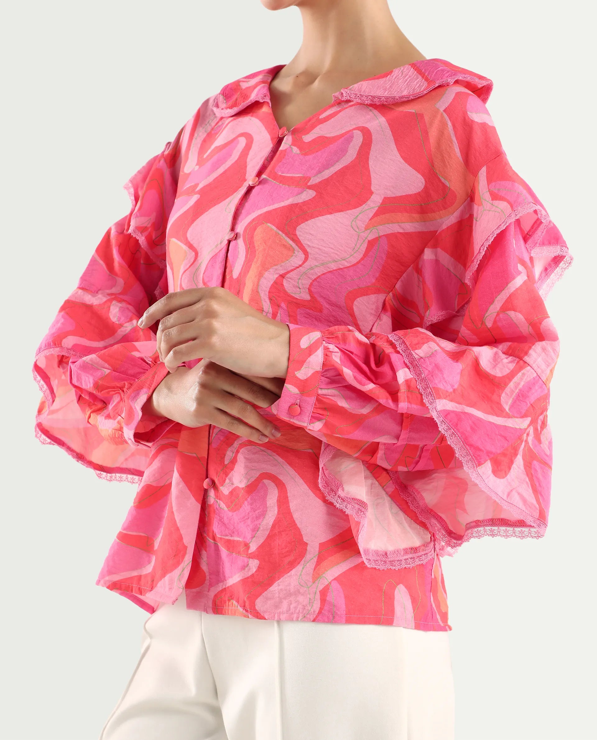 Elevate your style with our Co-Ord Ruffled Top featuring an abstract print and delicate lace detailing. The Peter Pan collar and bishop sleeves add a touch of whimsy to this enchanting piece. Crafted from a luxurious Viscose Blend, it seamlessly combines comfort with contemporary flair.
