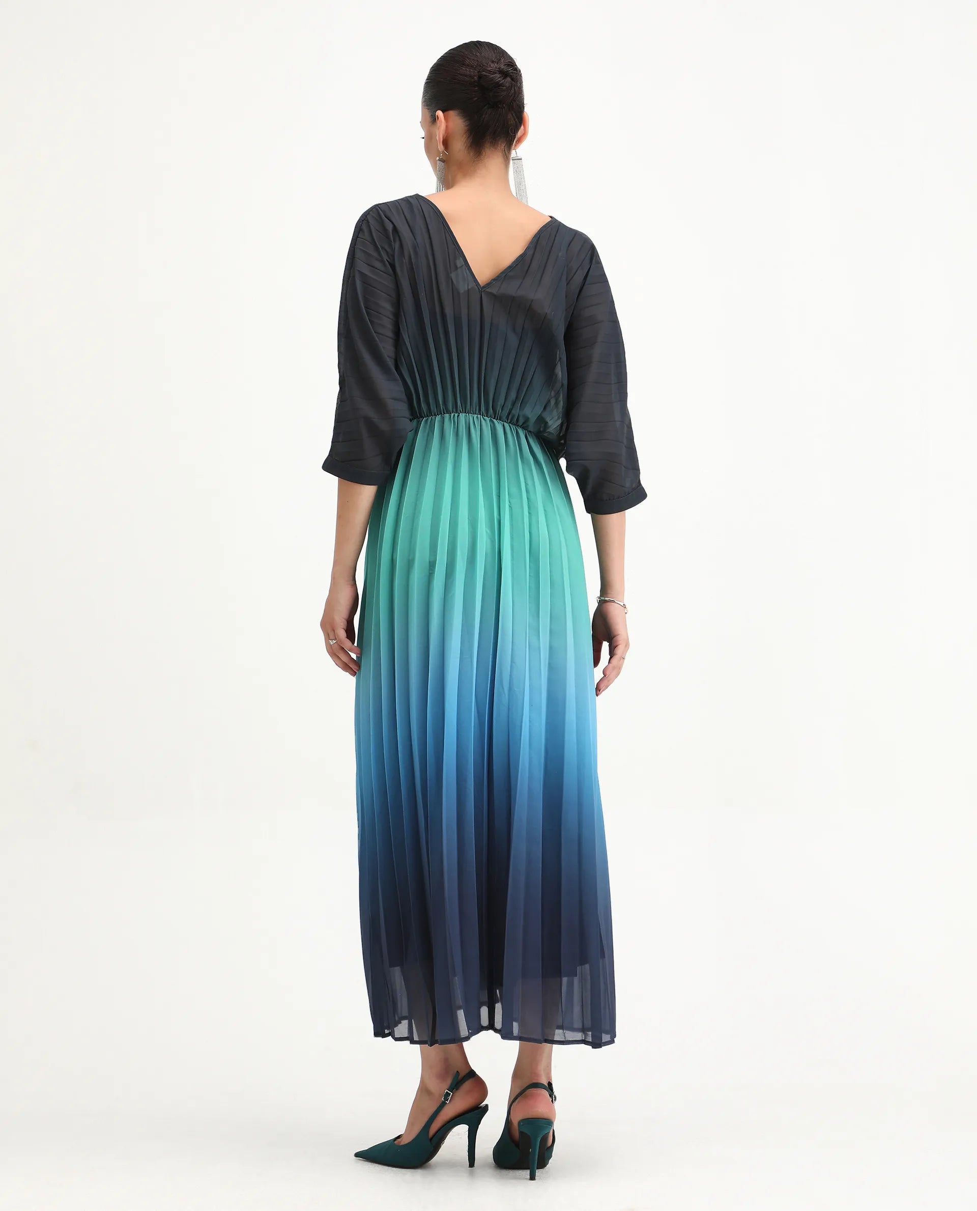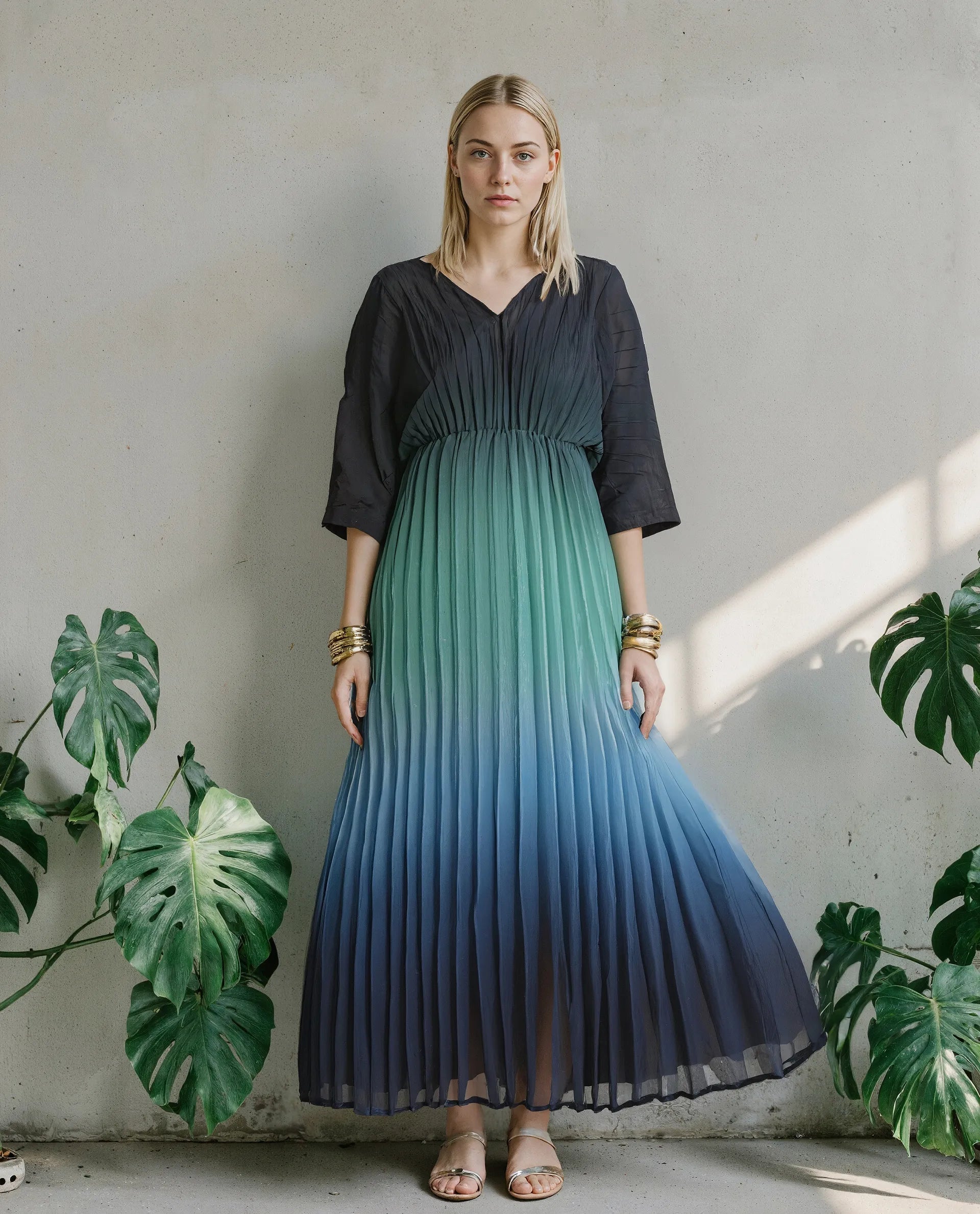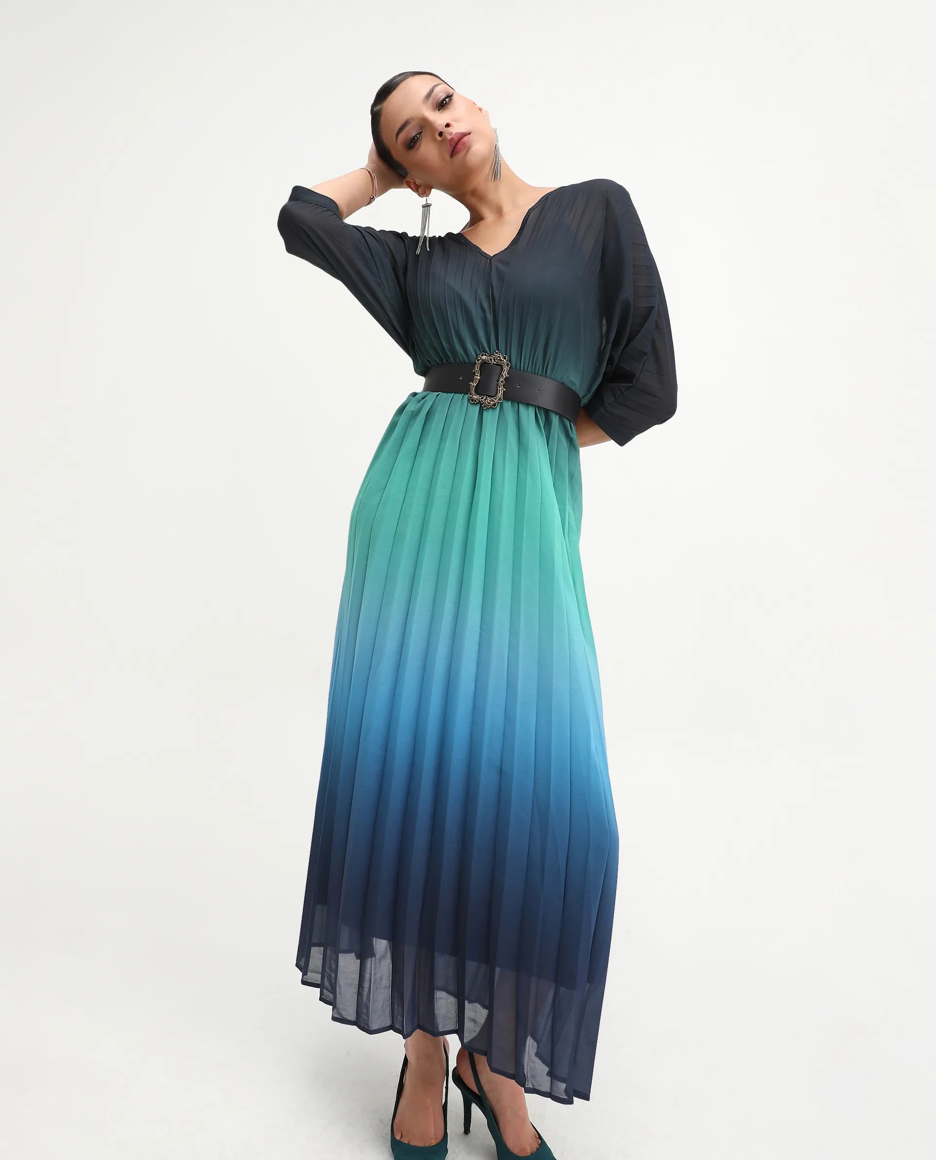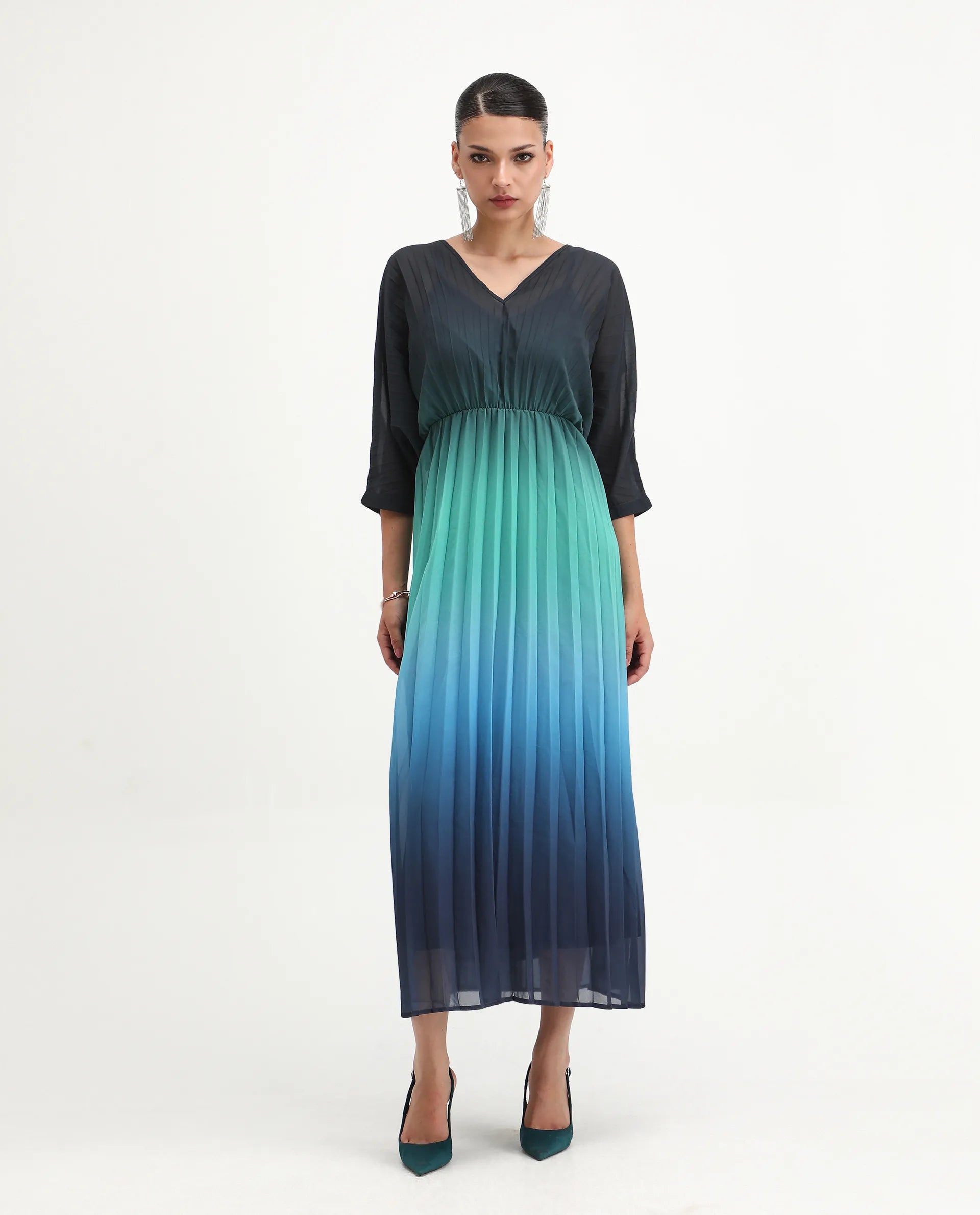 Elevate your wardrobe with this stunning ombre pleated maxi dress, perfect for any occasion. The graceful gradient transitions from deep navy to a serene teal, offering a sophisticated look. Designed with a flattering V-neckline and three-quarter sleeves, this dress ensures comfort and style. The relaxed fit and flowing silhouette make it ideal for both casual and formal events. Crafted from high-quality 100% Polyester fabric, it promises durability and elegance. Pair it with your favorite heels for a complete ensemble that exudes confidence and charm.
