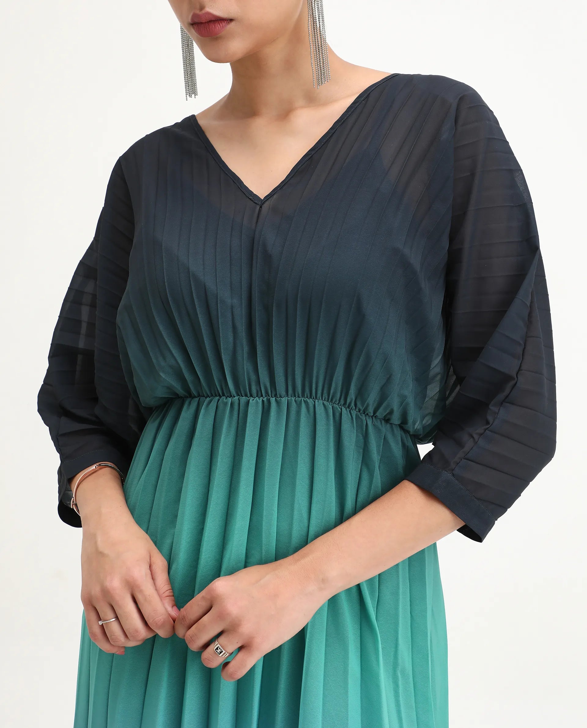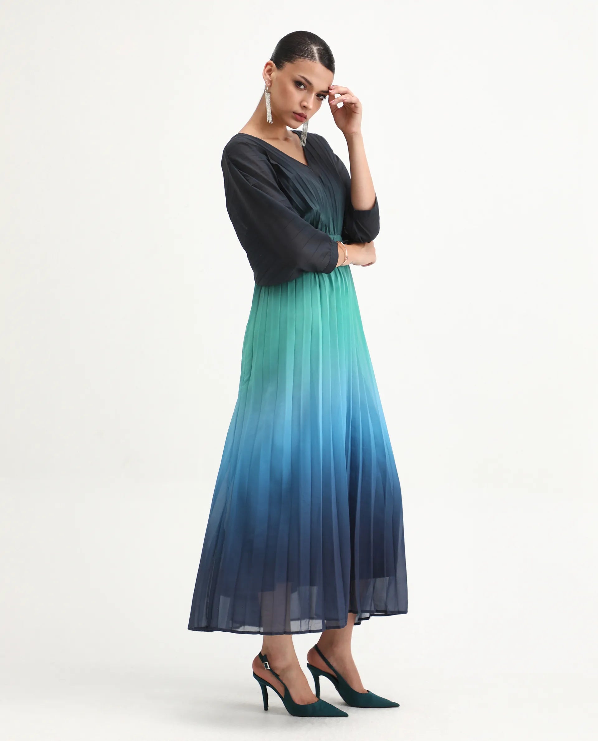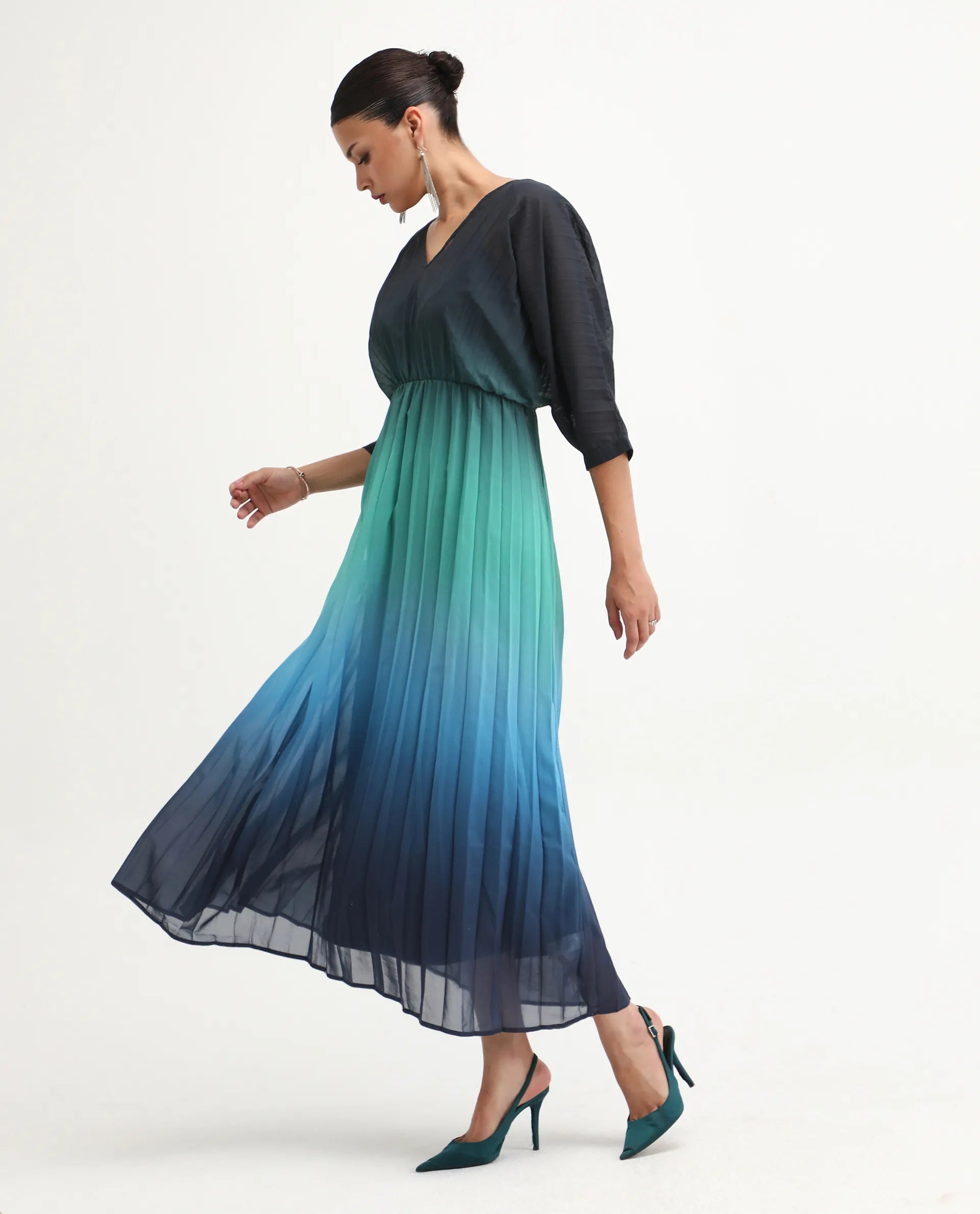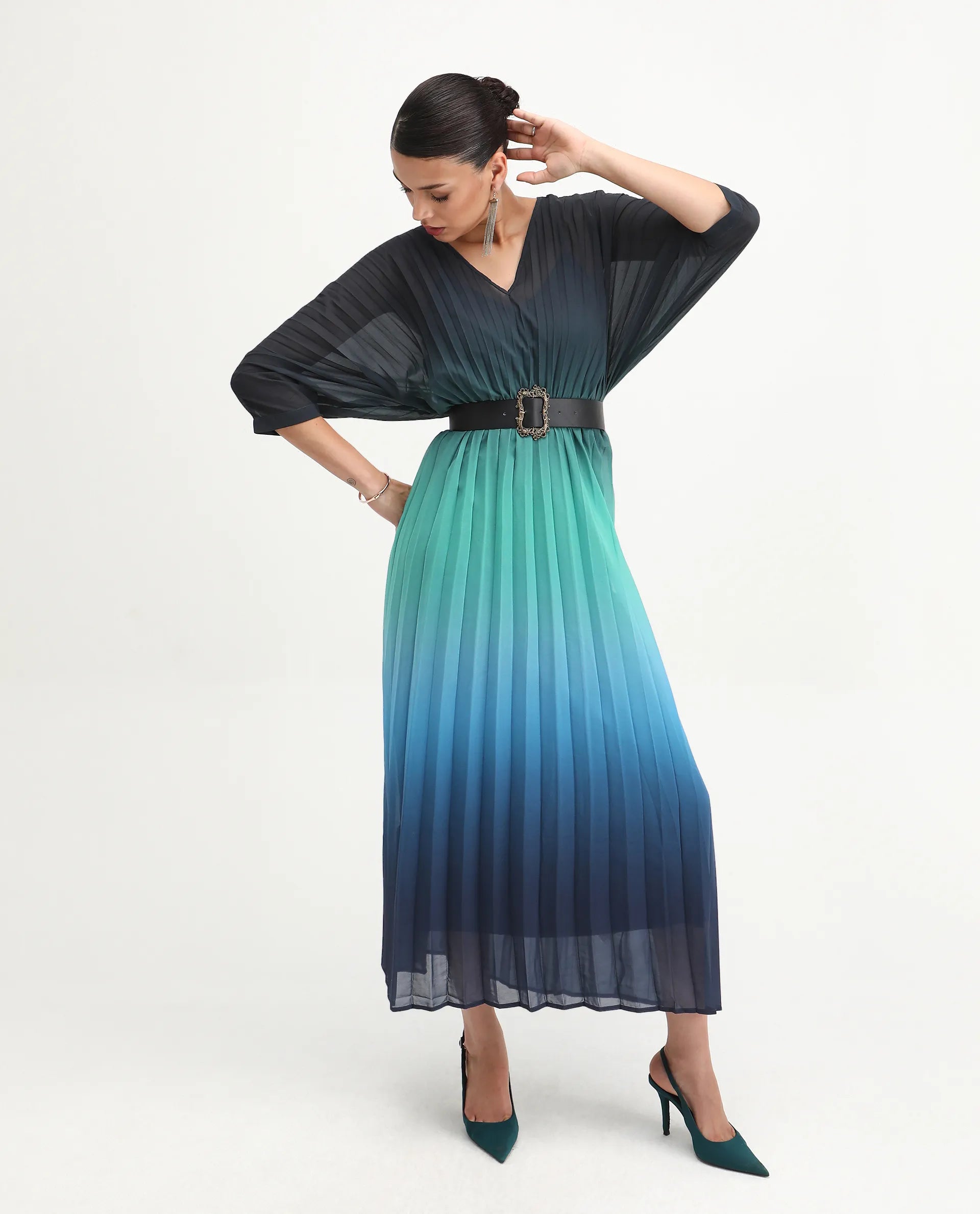 Elevate your wardrobe with this stunning ombre pleated maxi dress, perfect for any occasion. The graceful gradient transitions from deep navy to a serene teal, offering a sophisticated look. Designed with a flattering V-neckline and three-quarter sleeves, this dress ensures comfort and style. The relaxed fit and flowing silhouette make it ideal for both casual and formal events. Crafted from high-quality 100% Polyester fabric, it promises durability and elegance. Pair it with your favorite heels for a complete ensemble that exudes confidence and charm.