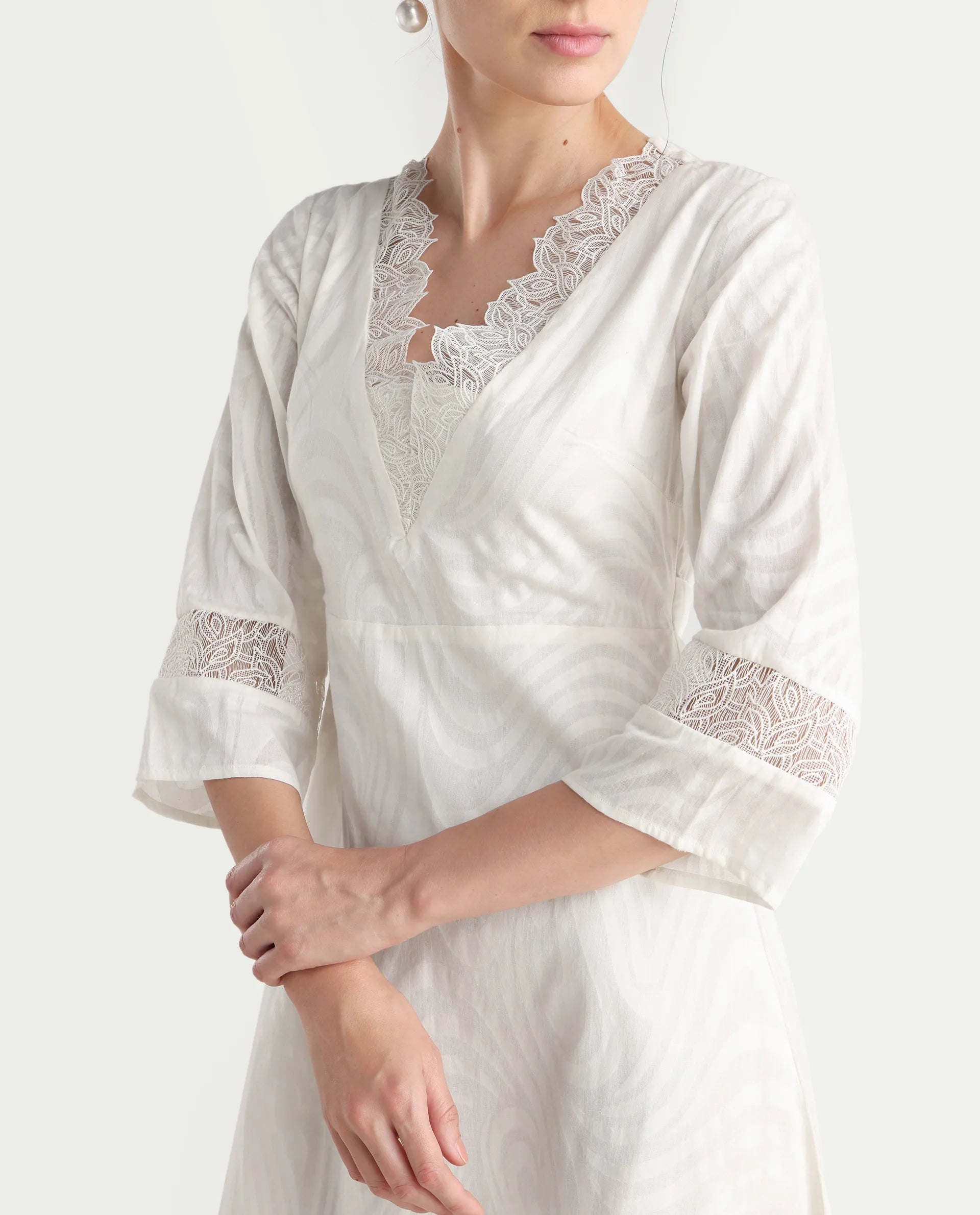 - The model (Chest-34, Waist-28, Hips-38, Height-178 cms) is wearing a size XS.