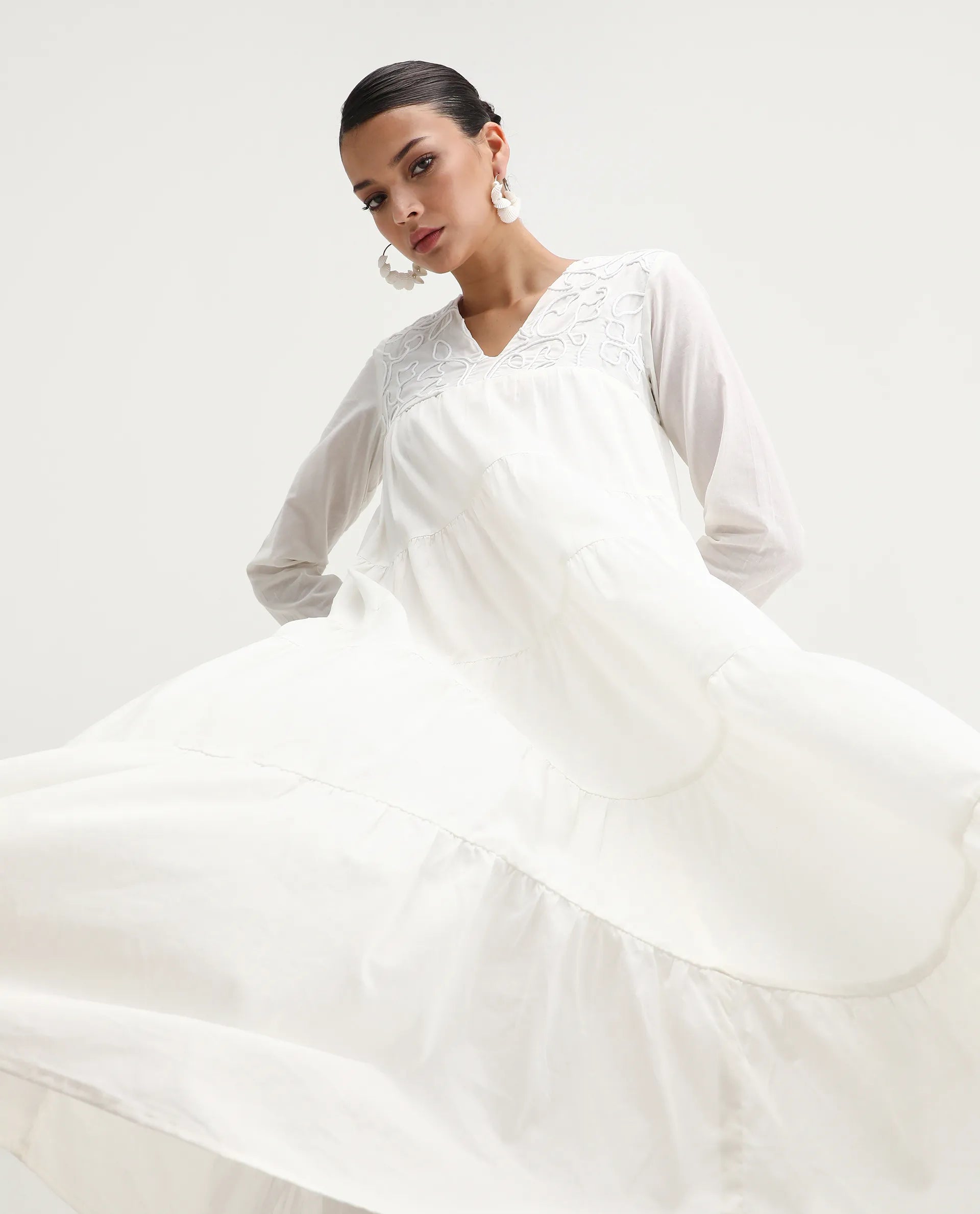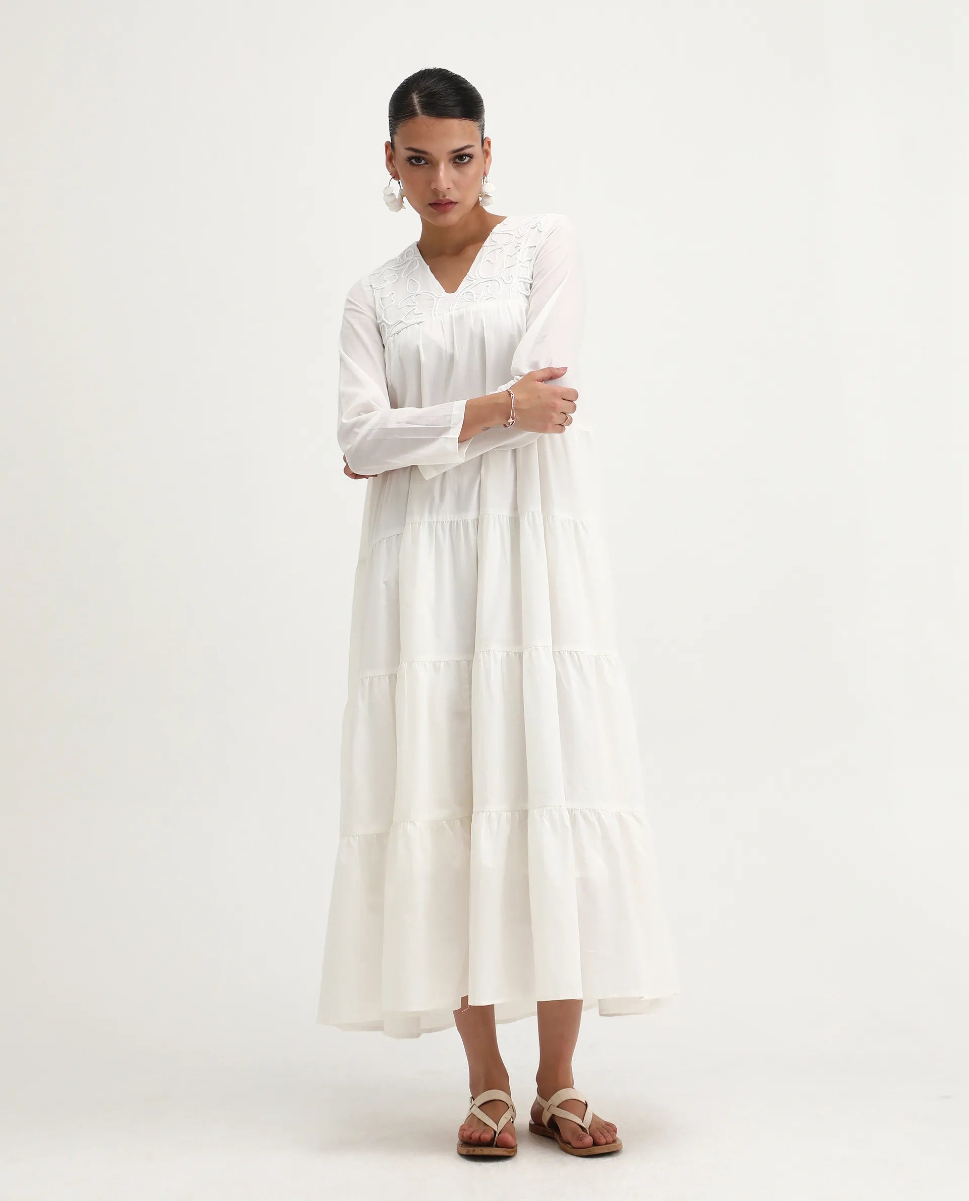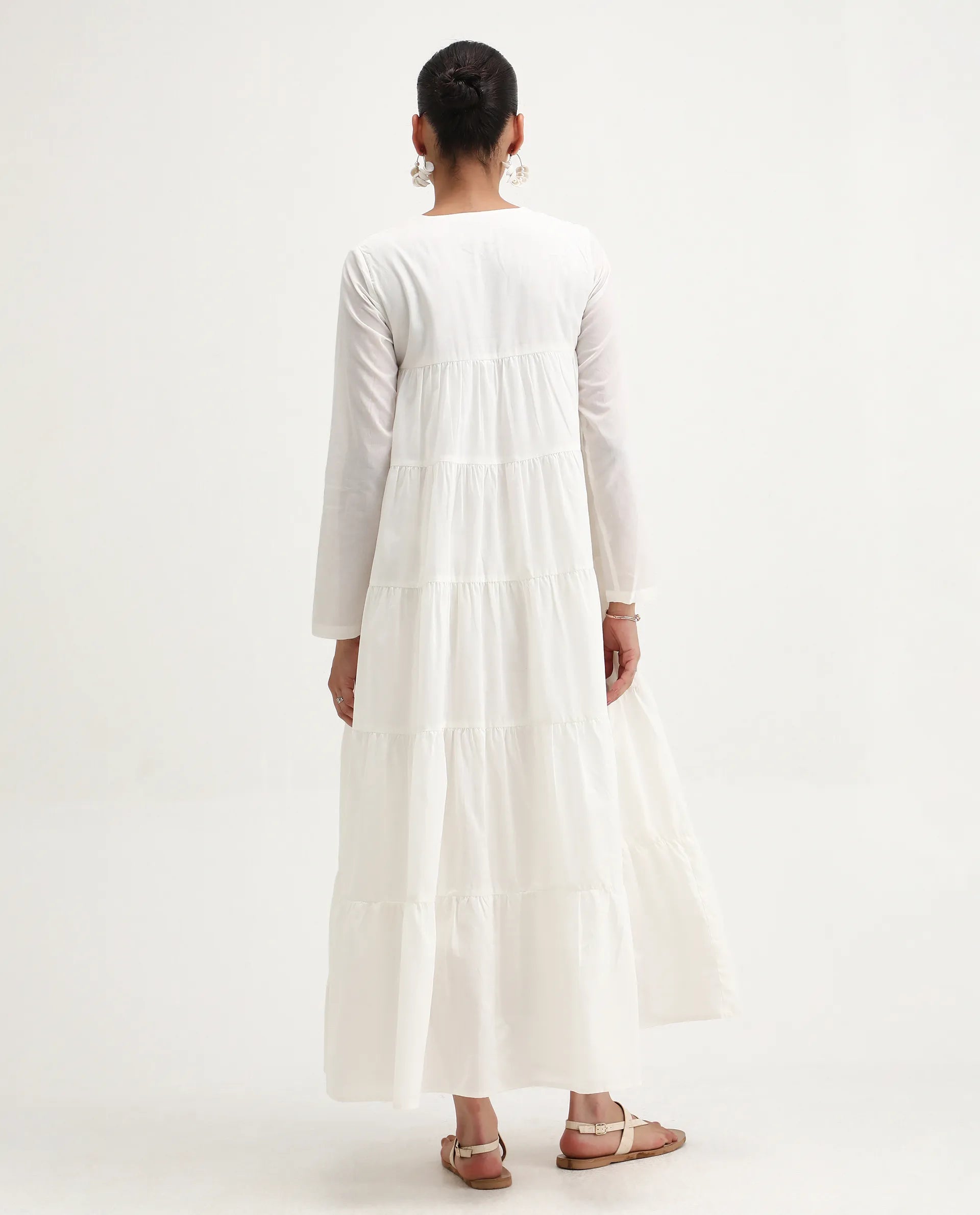 Rareism Women's Janear Beige Cotton Round Neck Plain Maxi Flared Dress