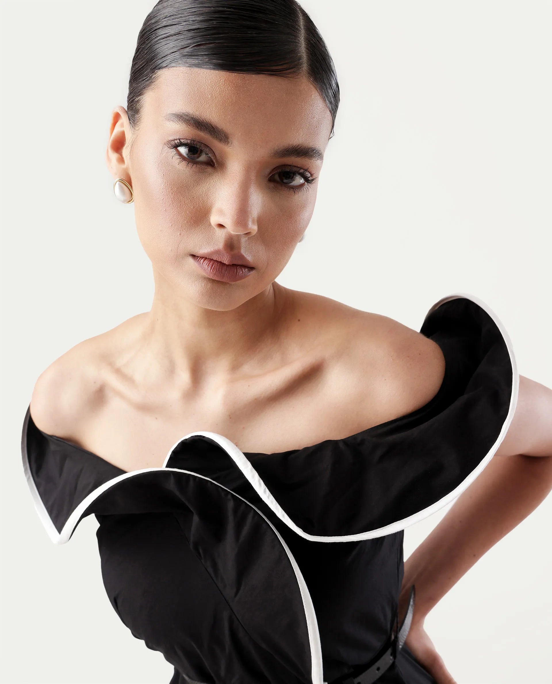 Rareism Women's Janrol Black Cotton Ruffled Neck Plain Sleeveless Midi Fit And Flare Dress