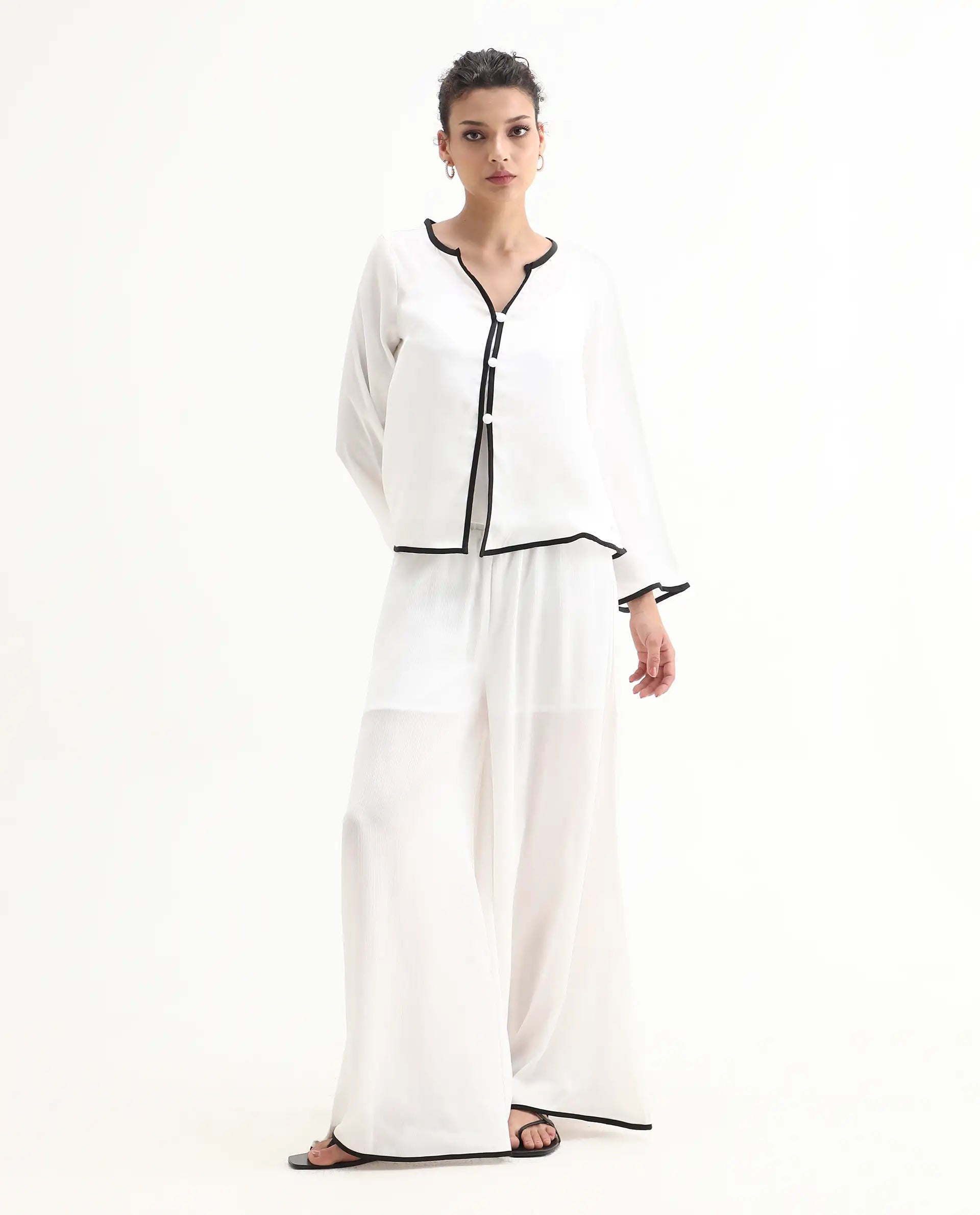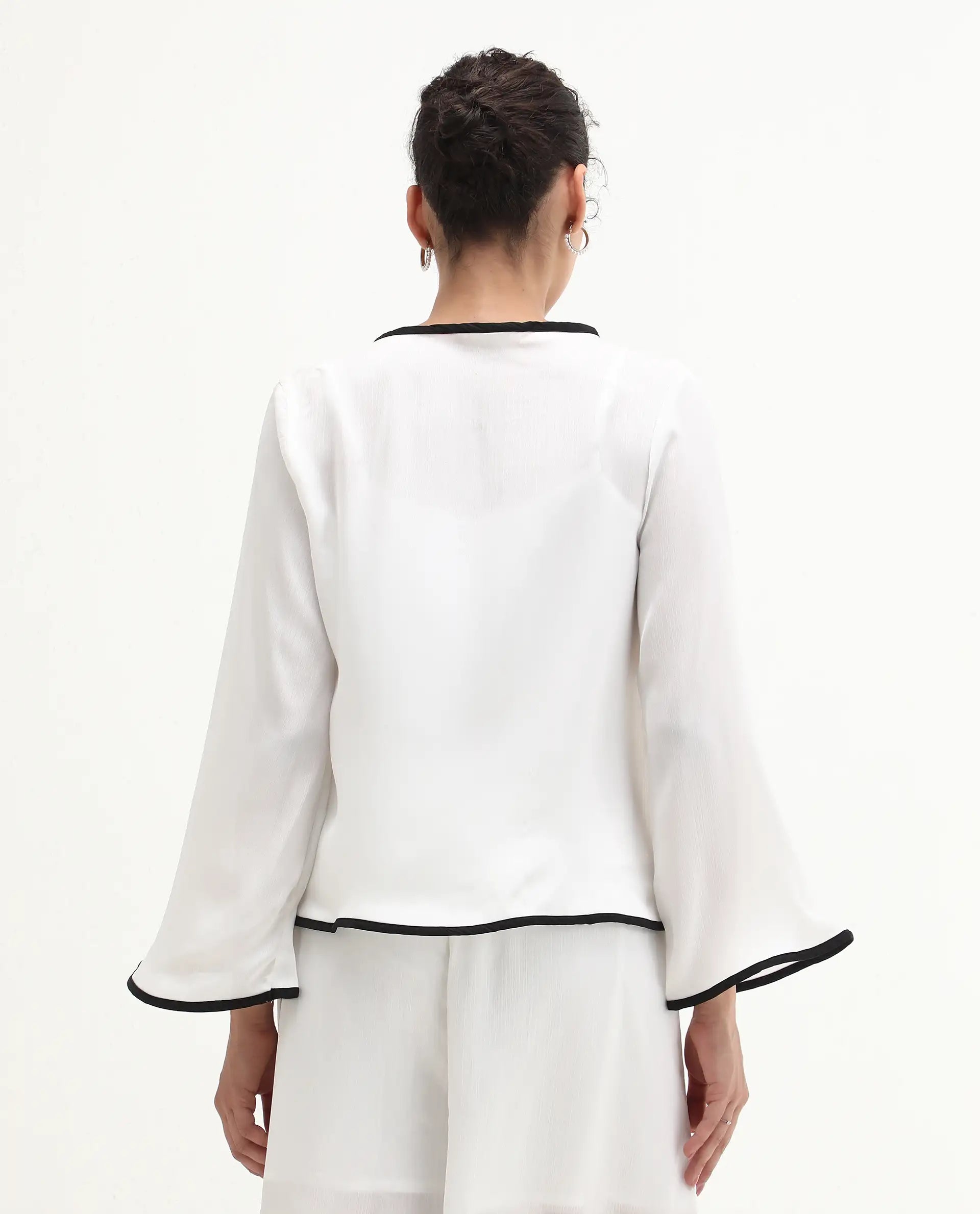 Introducing our Rareism Women Janula-T White 100% Polyester Fabric top! With its unique bell sleeves, it'll add a playful and stylish touch to any outfit. The round neck and button closure make it easy to wear, while the polyester fabric ensures comfort and durability. Dress it up or down, this plain top is a versatile addition to any wardrobe.