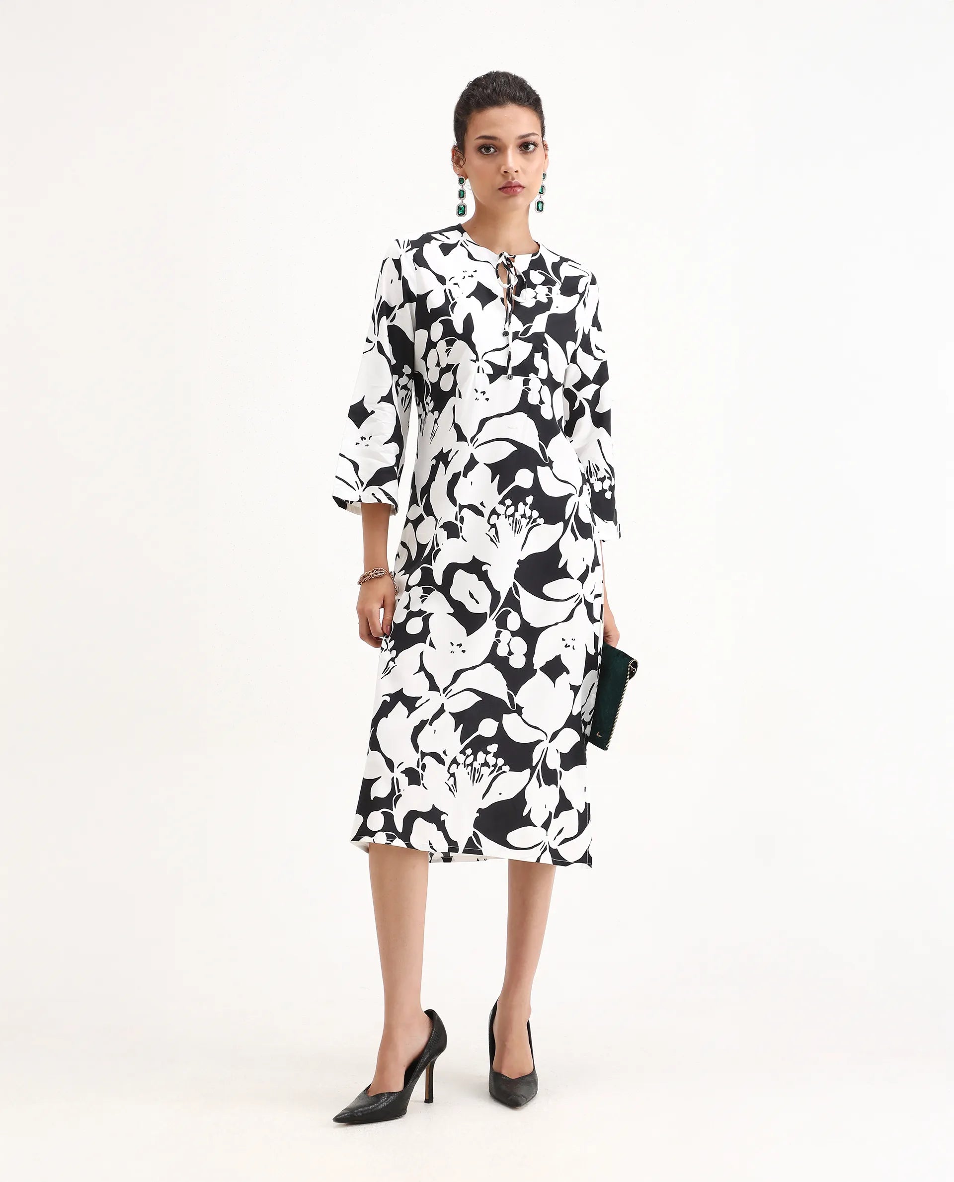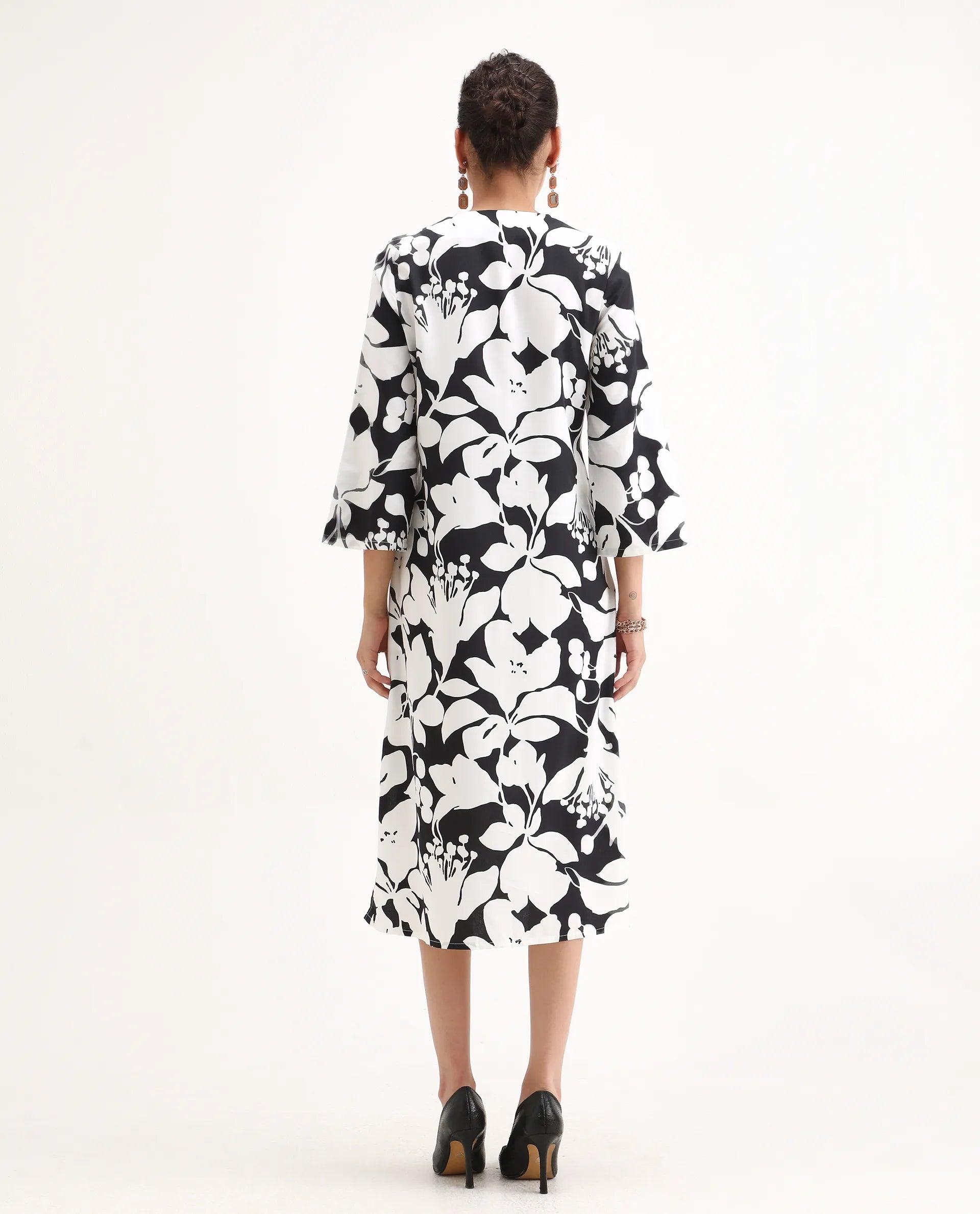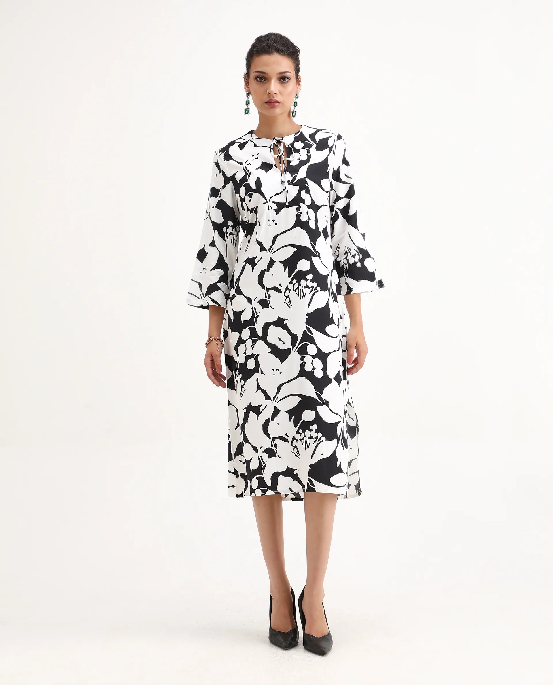 Rareism Women's Janzen Black Viscose Tie-Up Neck Floral Print Bell Sleeve Midi Straight Fit Dress