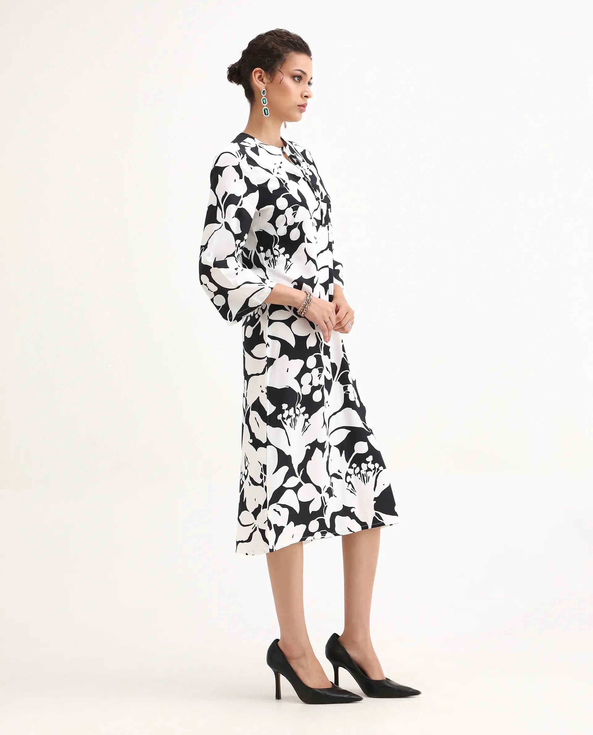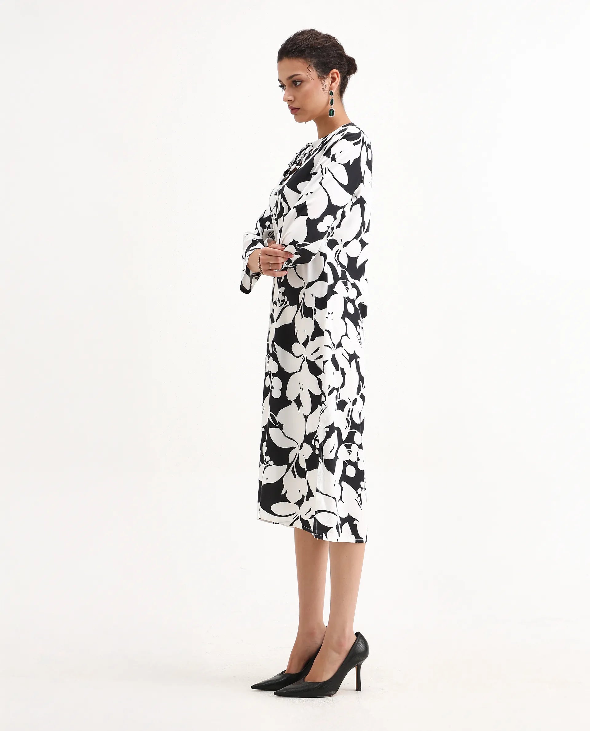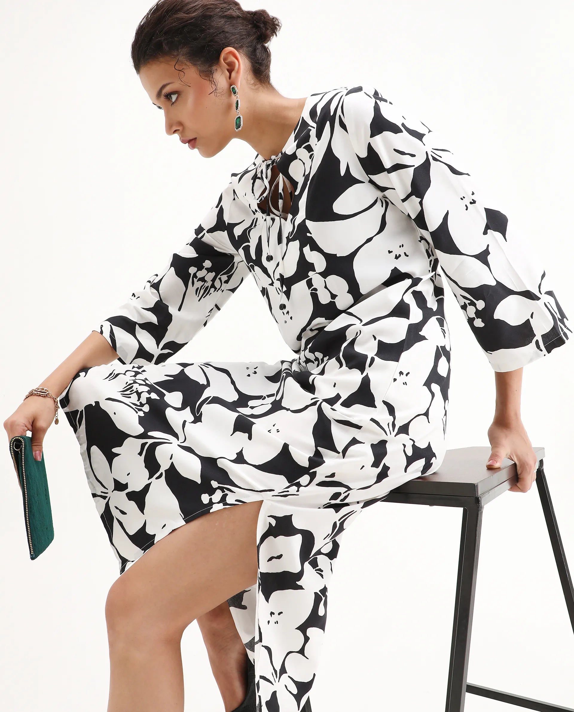 Rareism Women's Janzen Black Viscose Tie-Up Neck Floral Print Bell Sleeve Midi Straight Fit Dress